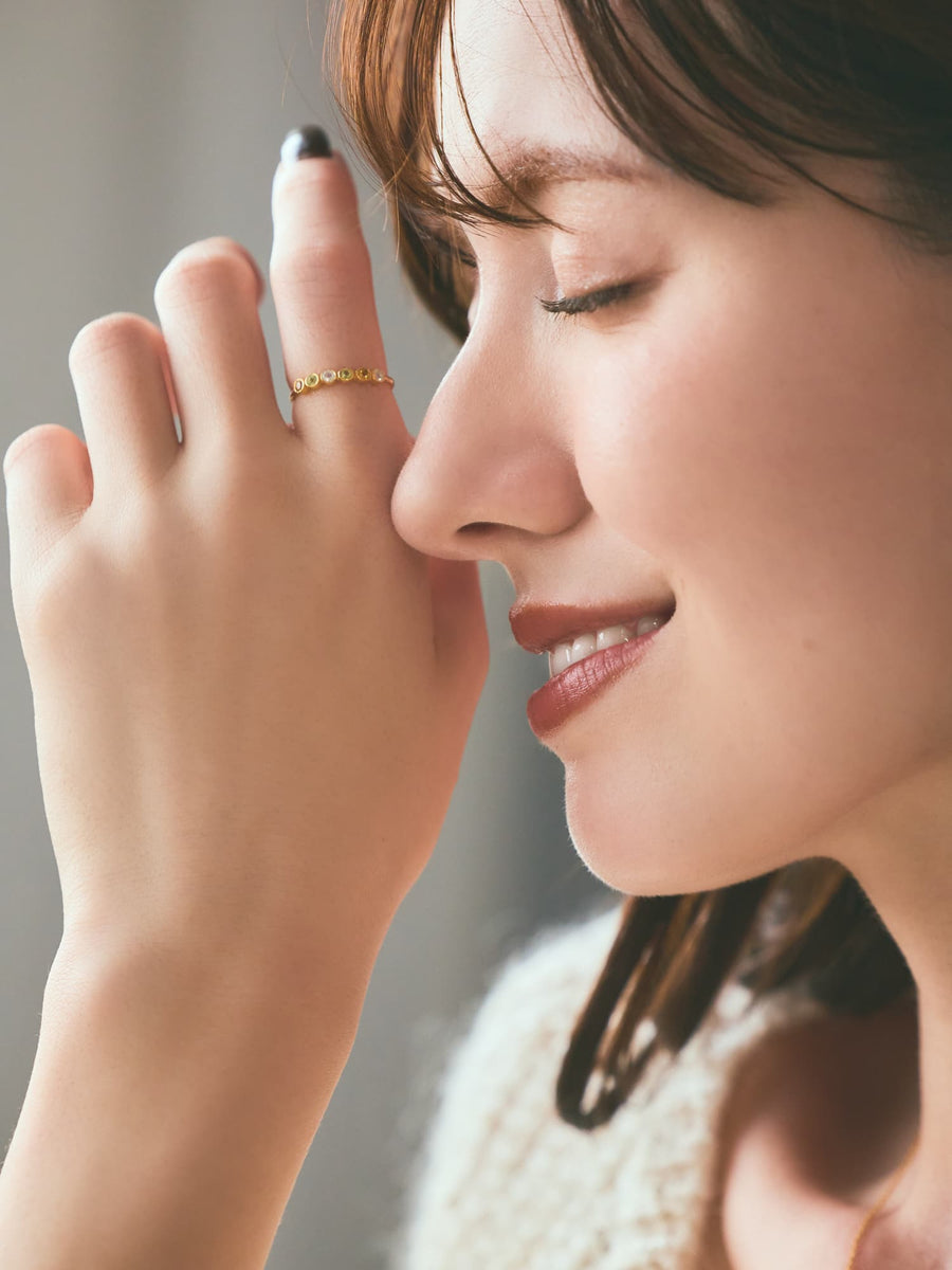 シンプルなリングや地金アイテムとの重ねづけで、表情の異なる輝きを楽しめます。