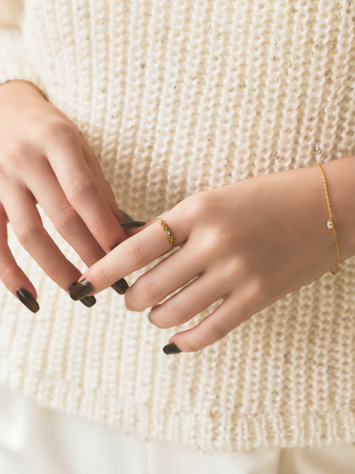 粒が連なる“ドット”のようなデザインが、指先に柔らかな光を宿します。