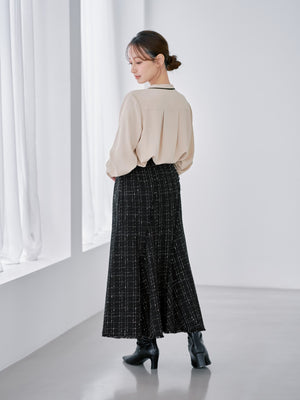 高級感があるチェックツイードを使用して、贅沢にエスカルゴ調の切り替えでややランダムなフレアをデザインしています。腰周りをすっきり作ることでマーメイドライクなラインに仕上げました。