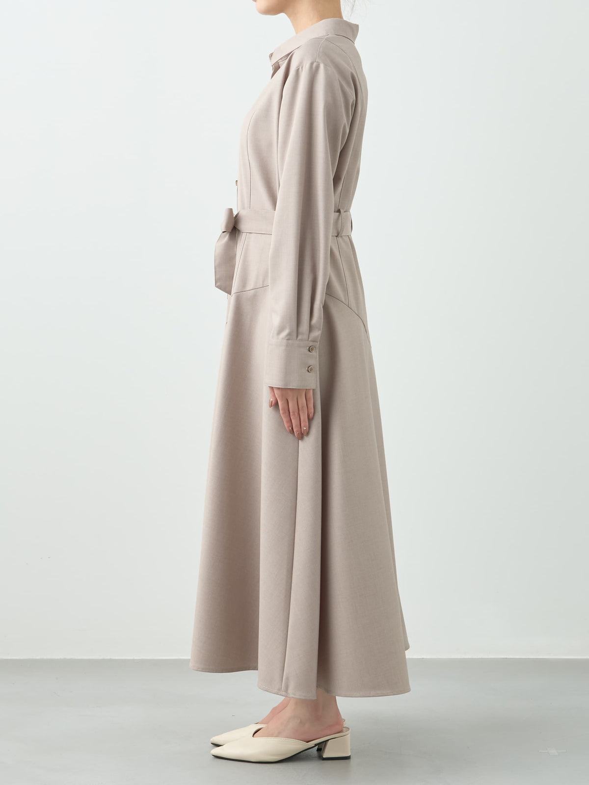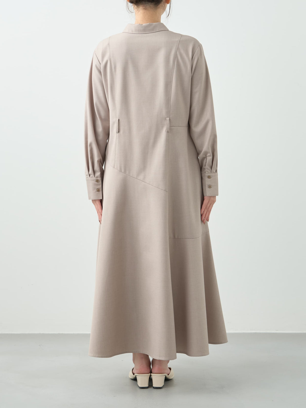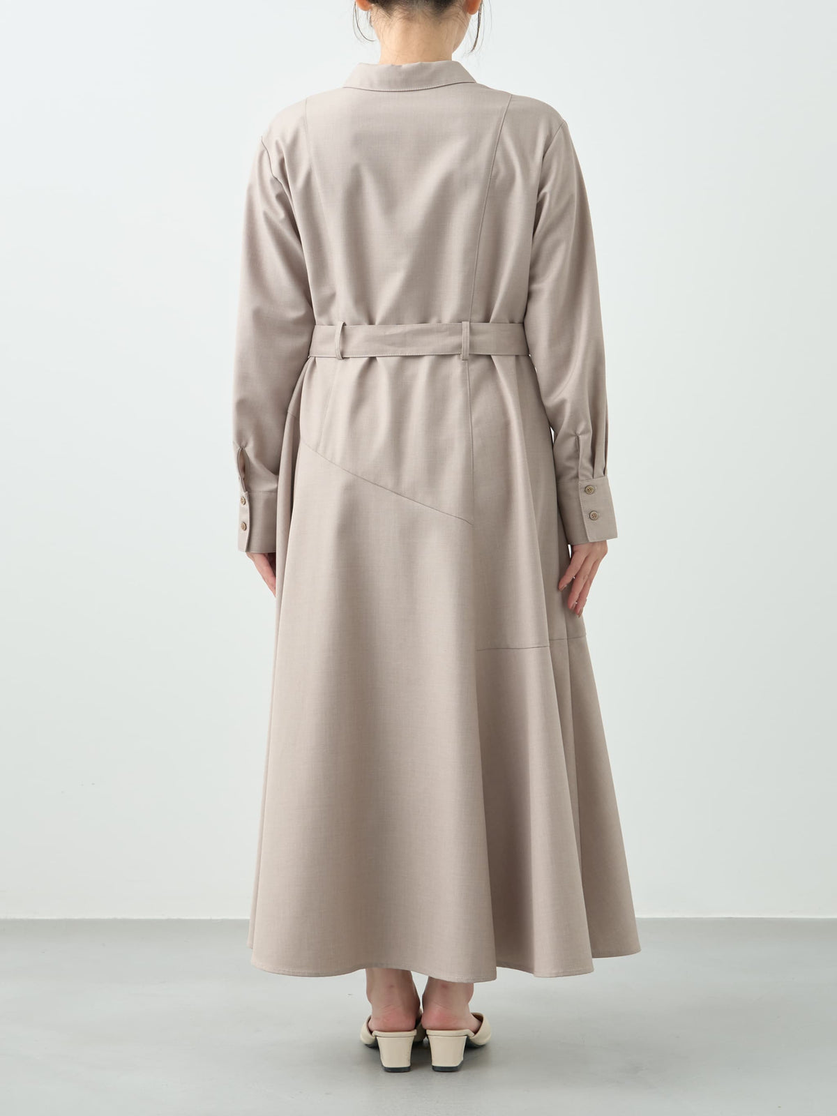 すとんと落ちる上品な生地感がボディラインを拾いにくく、360°どこから見ても美しく仕上がるシルエットです。