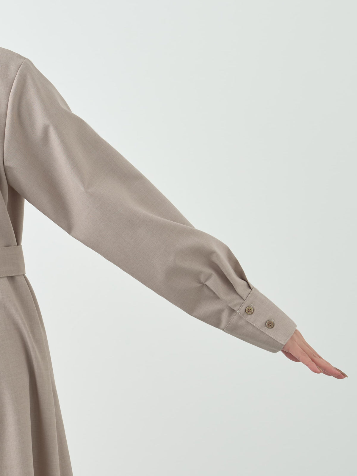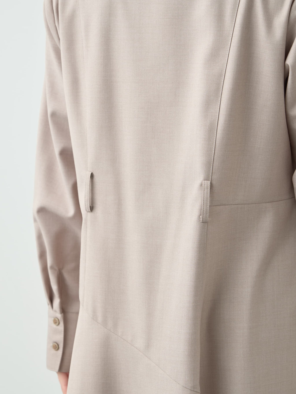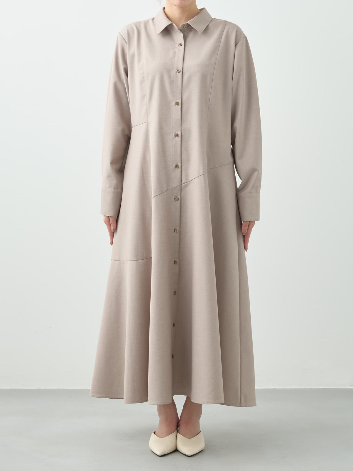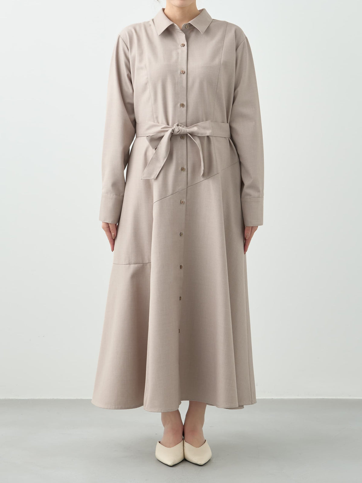 すとんと落ちる上品な生地感がボディラインを拾いにくく、360°どこから見ても美しく仕上がるシルエットです。