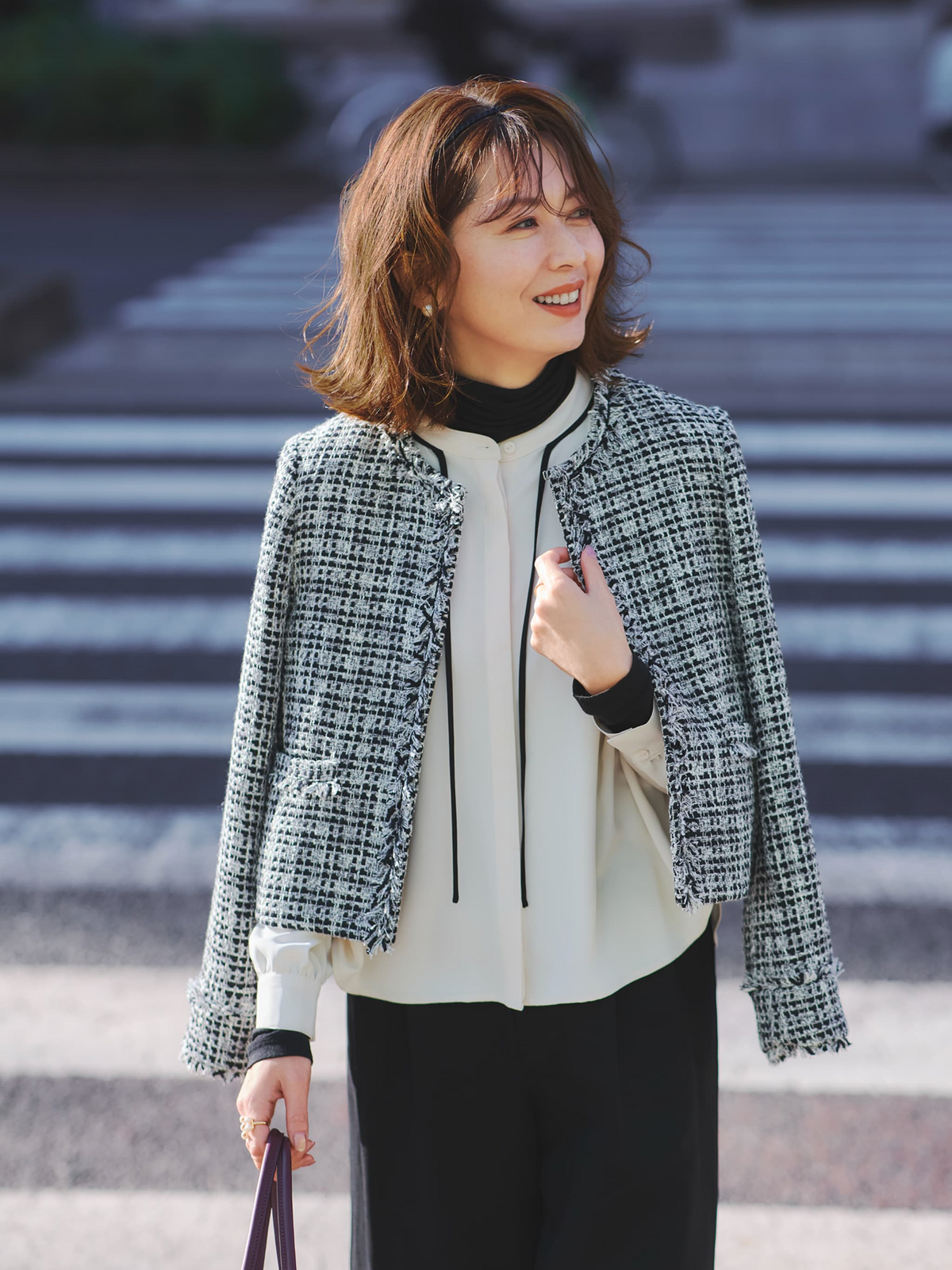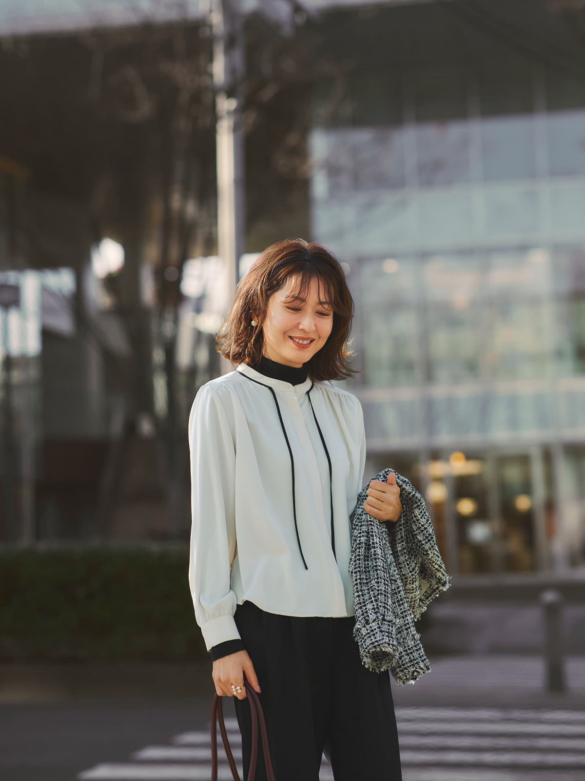 シンプルでありながら、繊細な細い配色リボンが顔まわりを印象的に華やかにしてくれて、コーディネートを上品に仕上げてくれます。淡い色合いのブラウスも黒の配色が全体を引き締め、甘すぎない印象に。