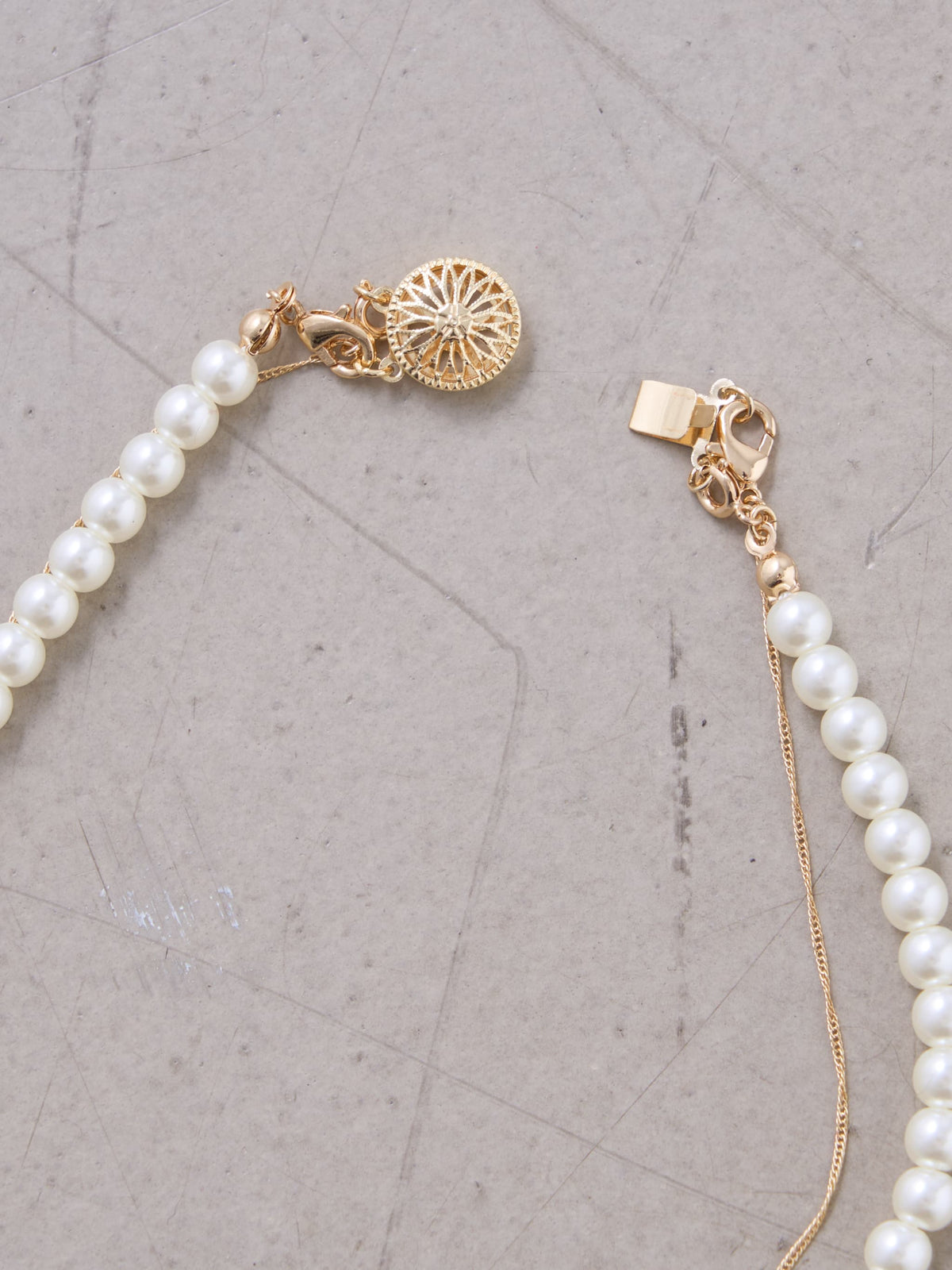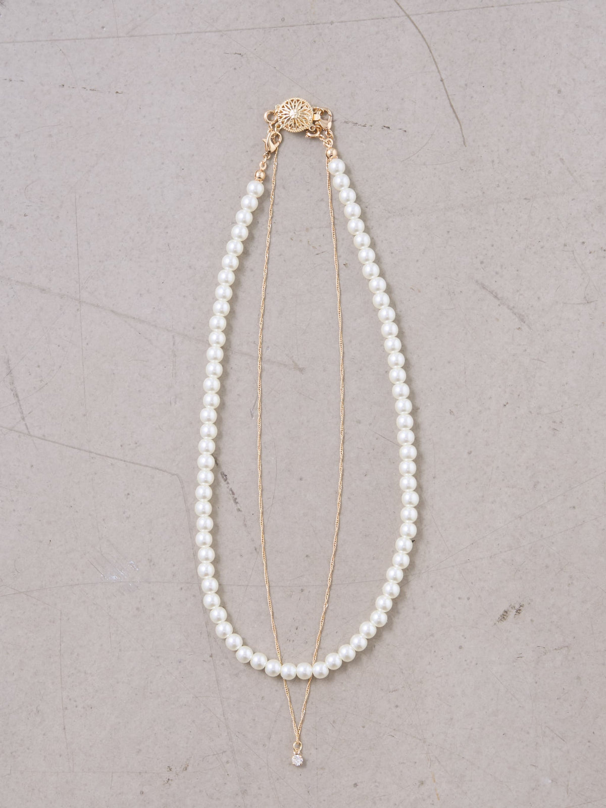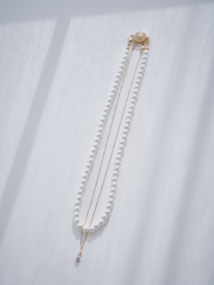 パールネックレスとストーン付きのチェーンネックレスがレイヤードになったデザインネックレス。