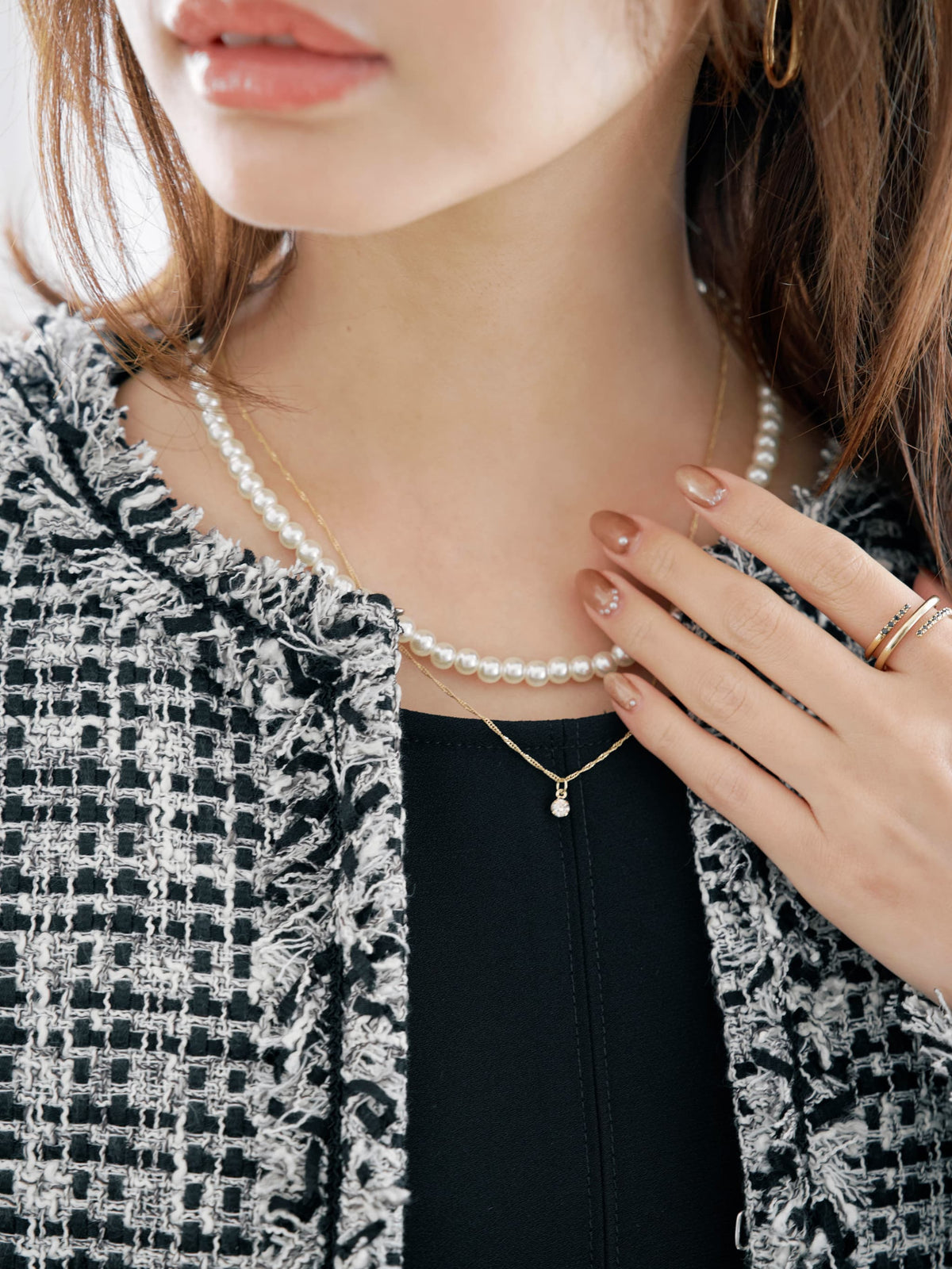 さりげなく煌めくストーンがポイントになり、上品なパールとチェーンの連なりが首元を美しく華やかに演出します。