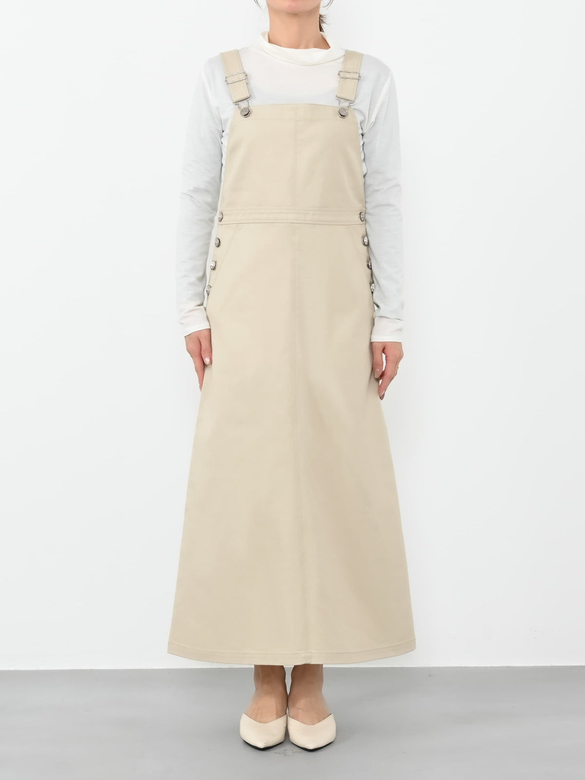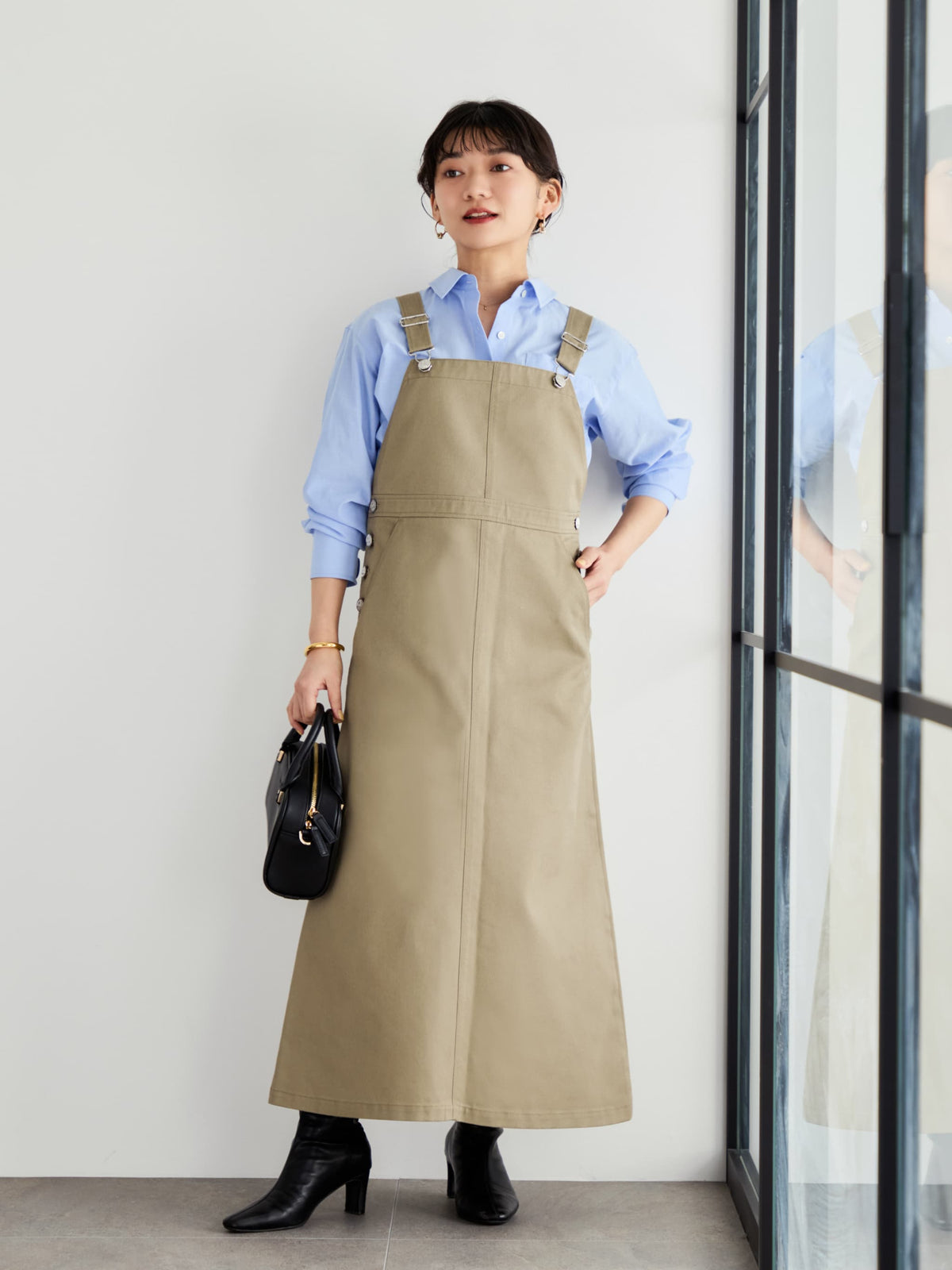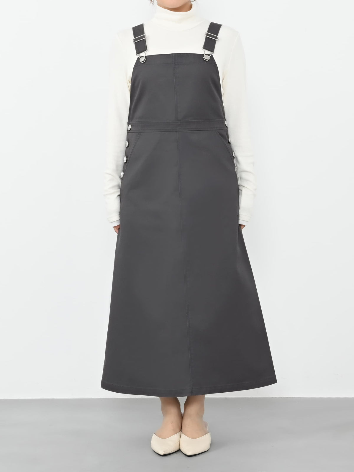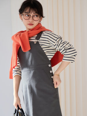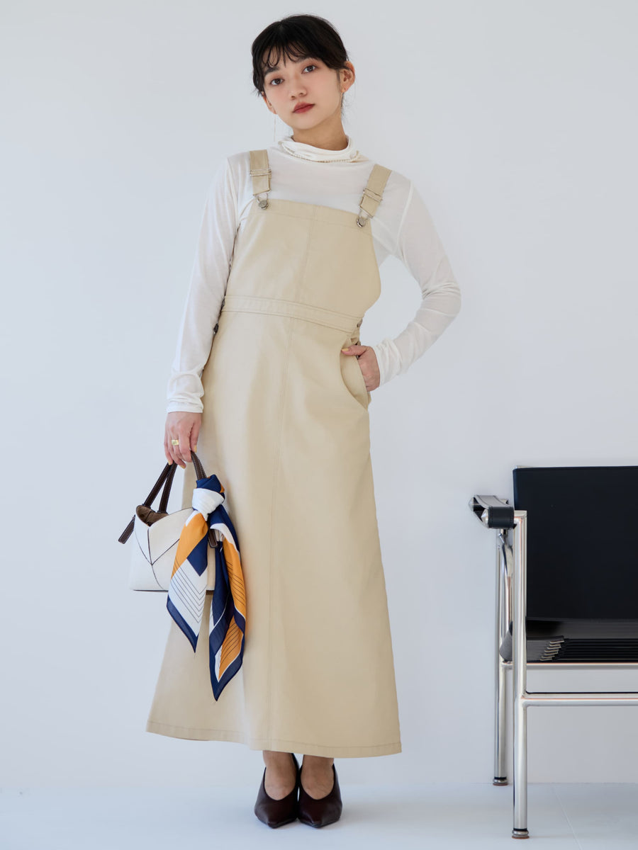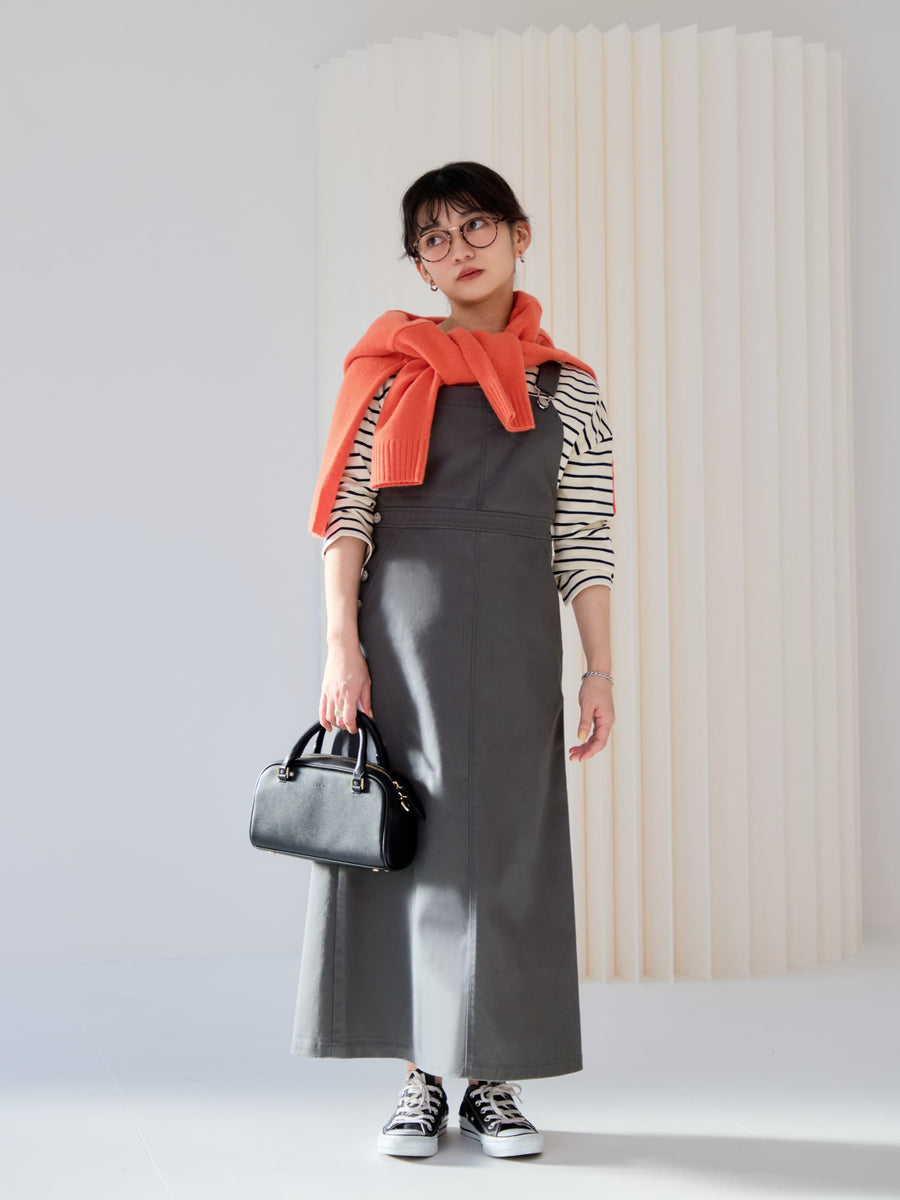 ワークディティールがありながらも、春カラーやブーツとの合わせもバッチリで、女性らしく着ることができるデザインにときめきます♡身長148cmでふくらはぎが隠れる丈感で、肩部分のアジャスターもあるので、お好みの長さで調整可能です◎