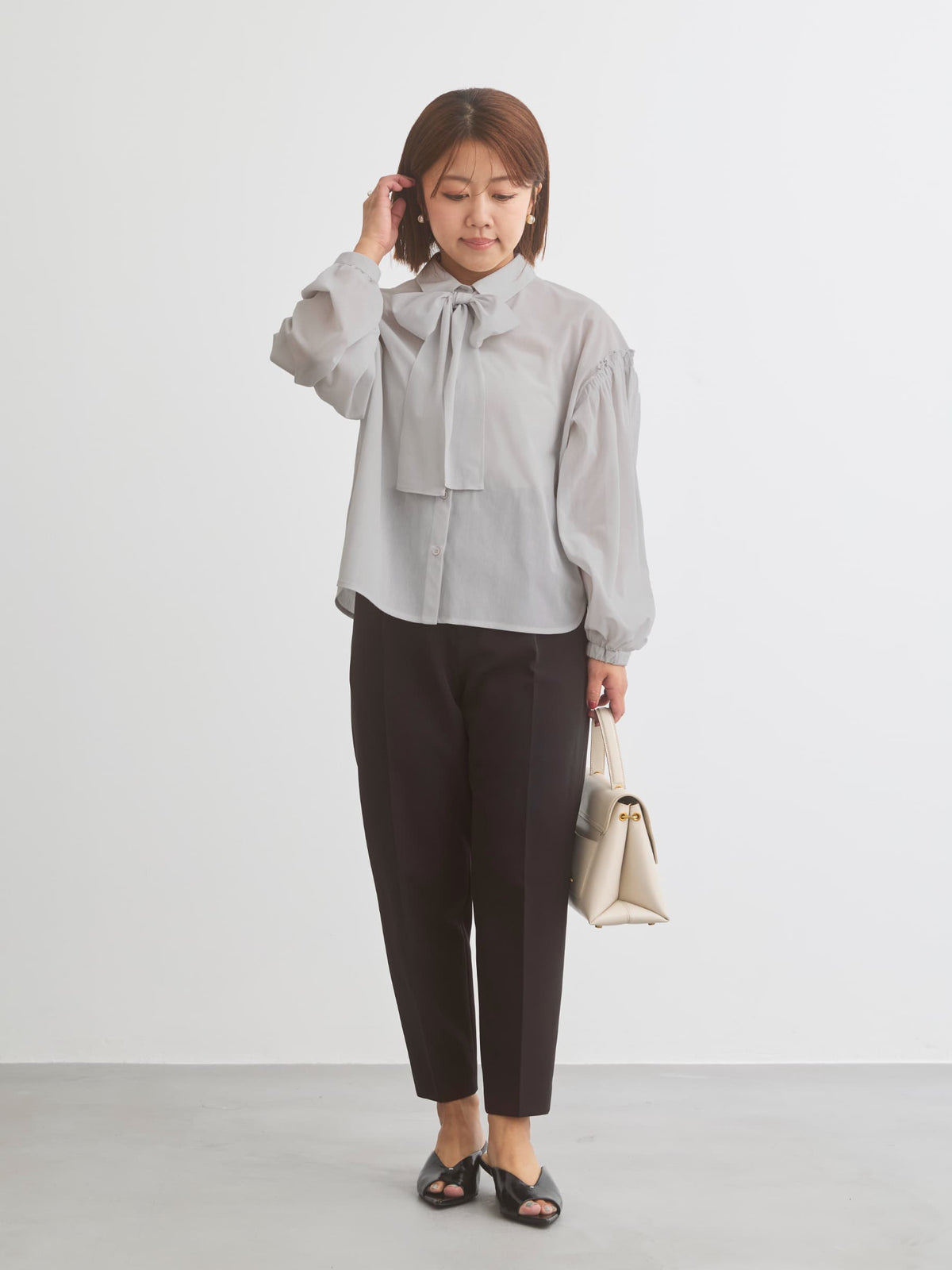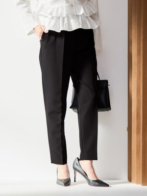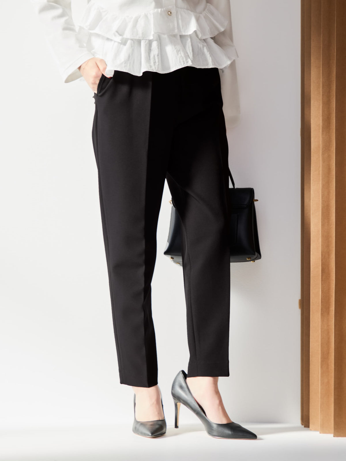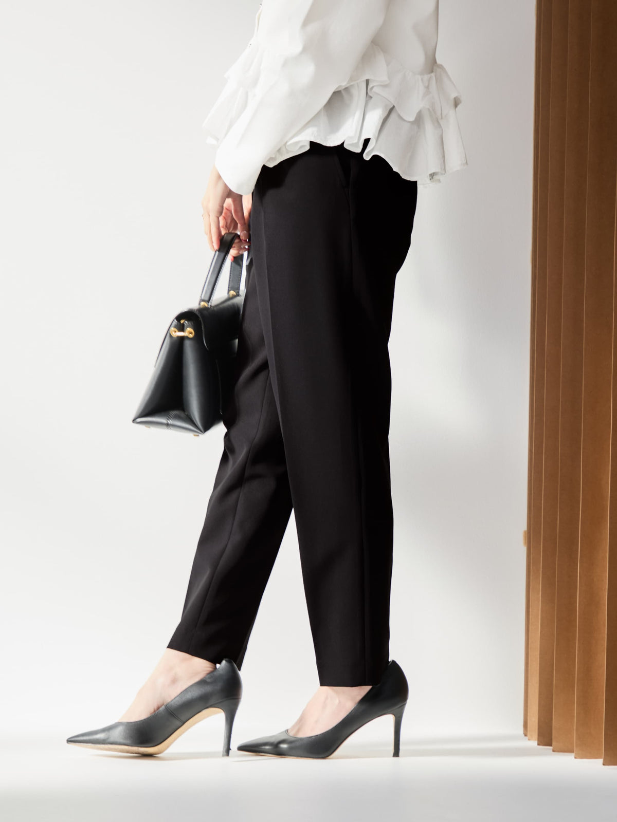 すっきりと美脚見えするテーパードパンツは、トップスをインしてもアウトでもバランス良く決まるのが嬉しいポイント。デイリー使いはもちろん、きれいめなシーンにも自然と馴染む頼れる1本です。