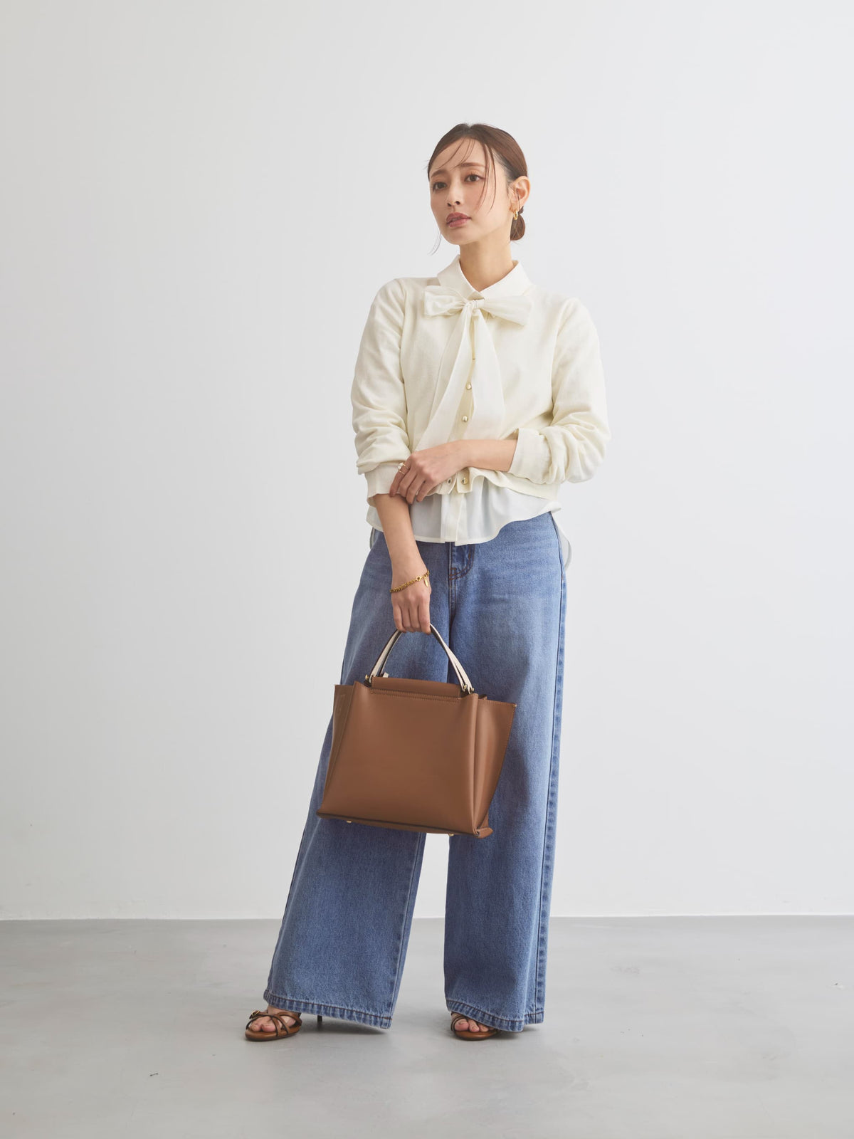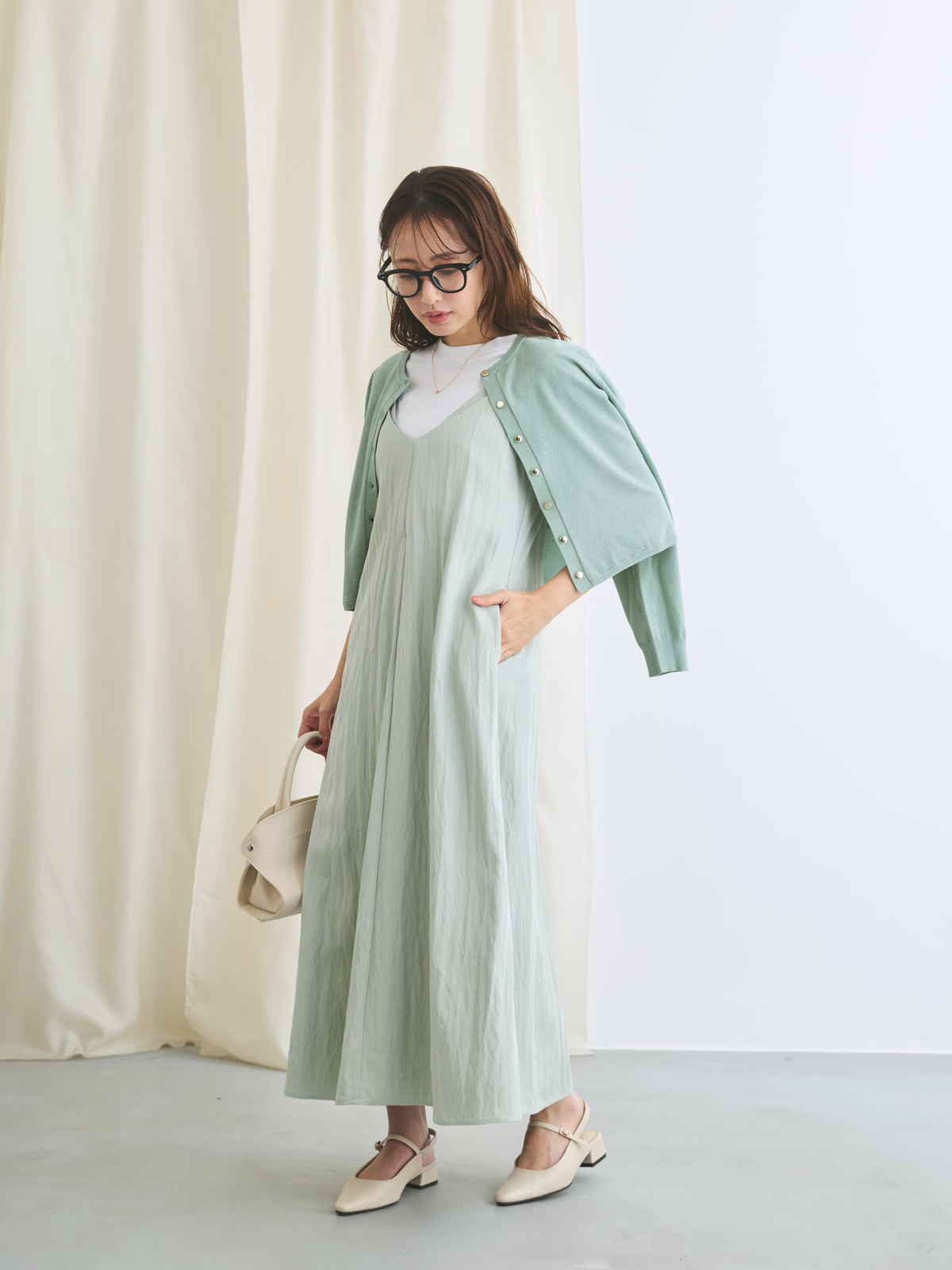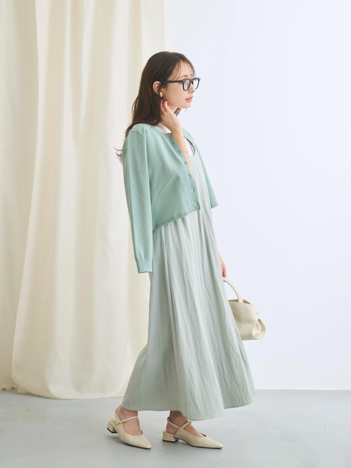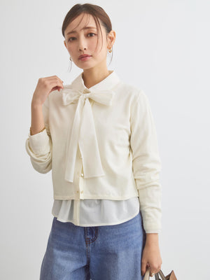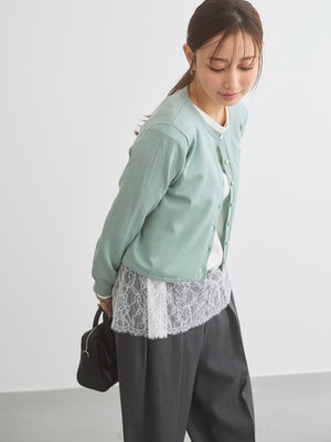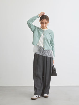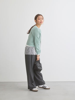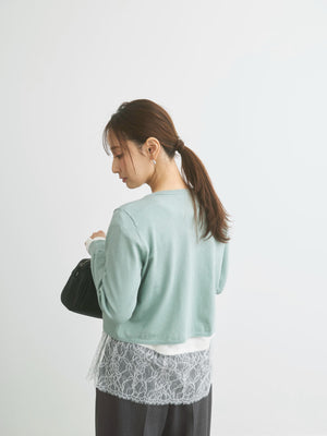 カットソーやブラウスとのレイヤードはもちろん、ワンピースにさらっと肩掛けするだけでも上品な印象に。
