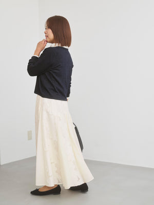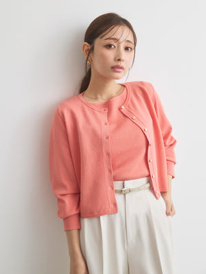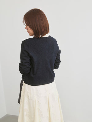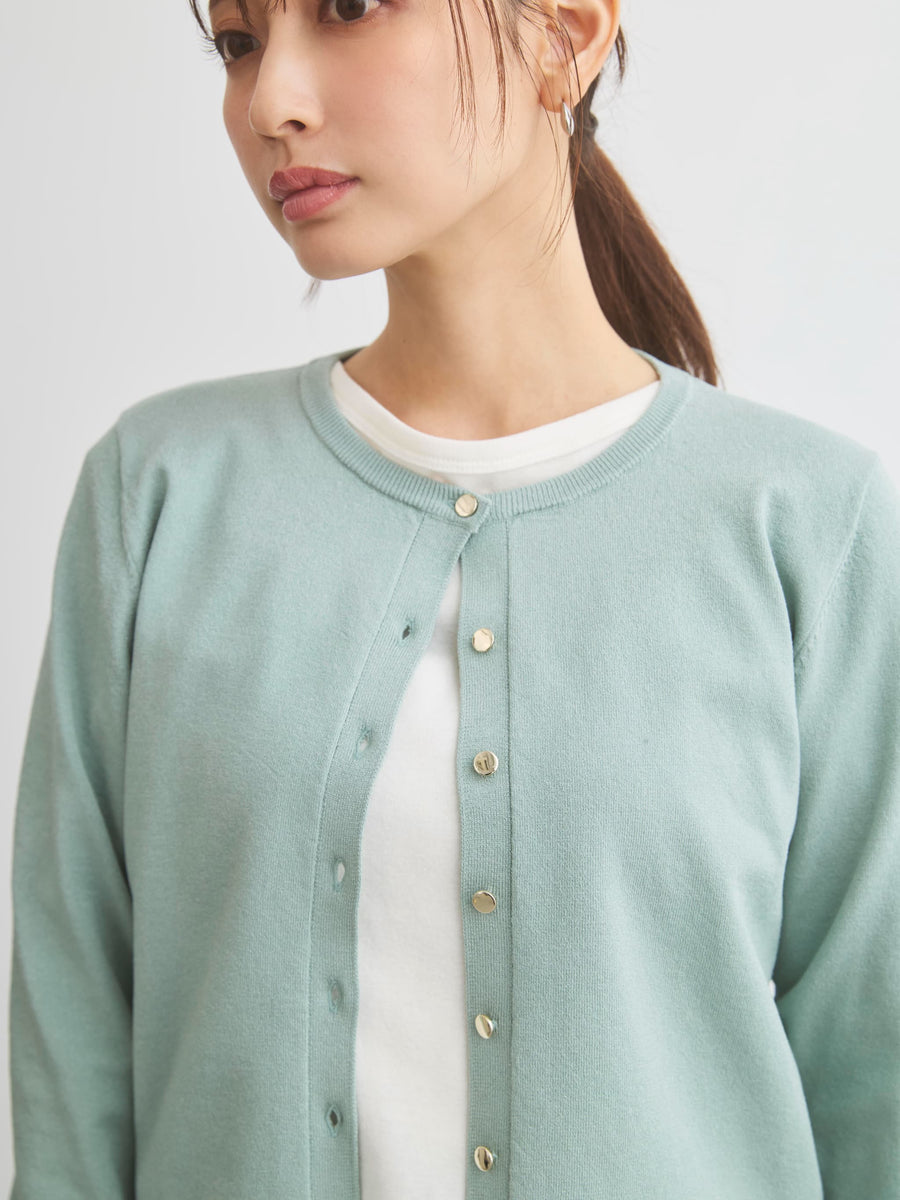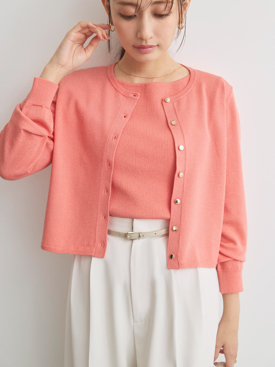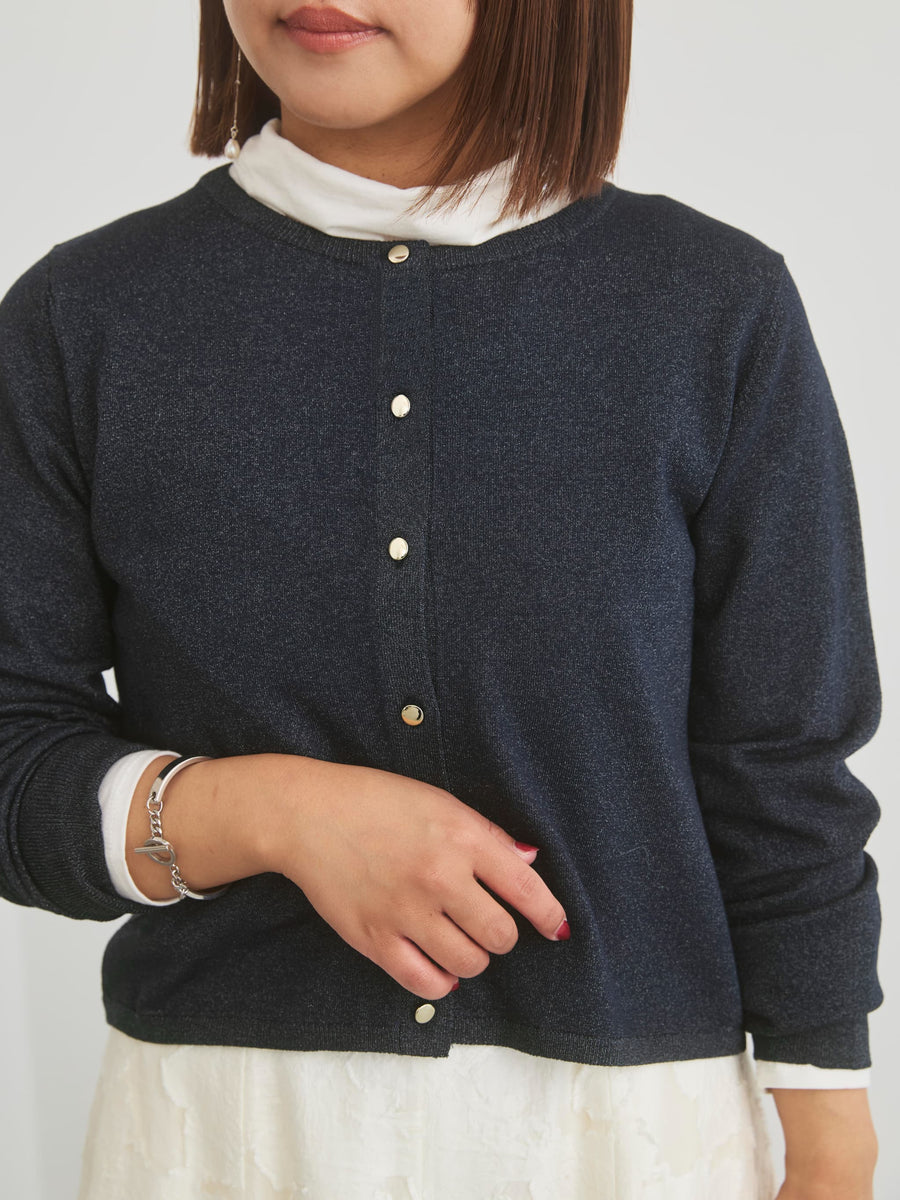 きちんと感と女性らしさを引き立てる上品なきらめきをまとったニットカーディガン。