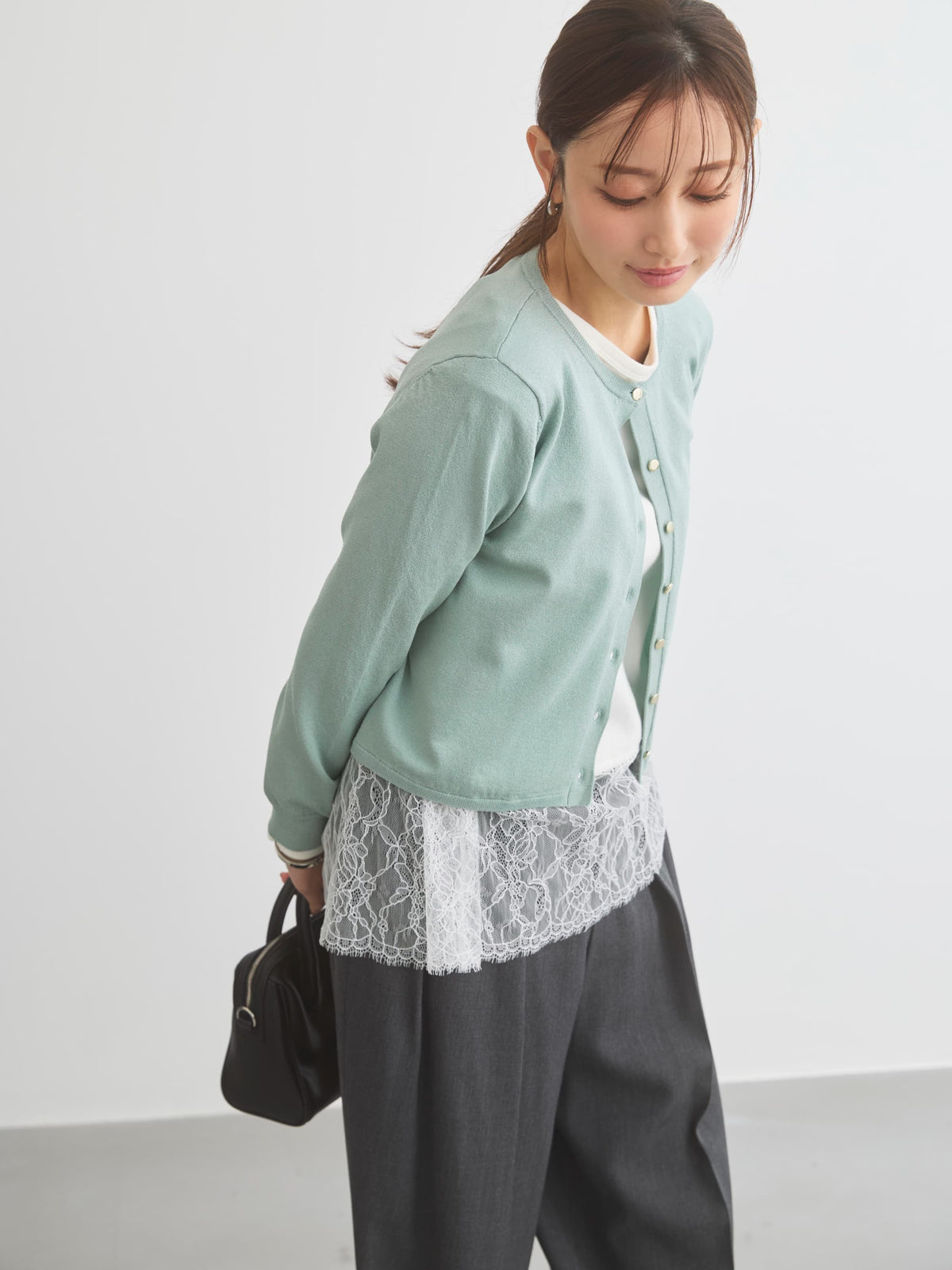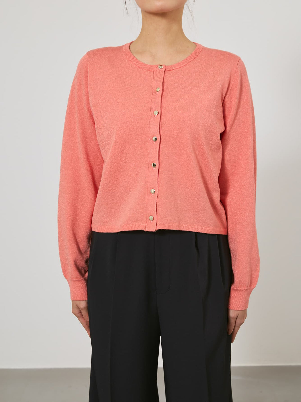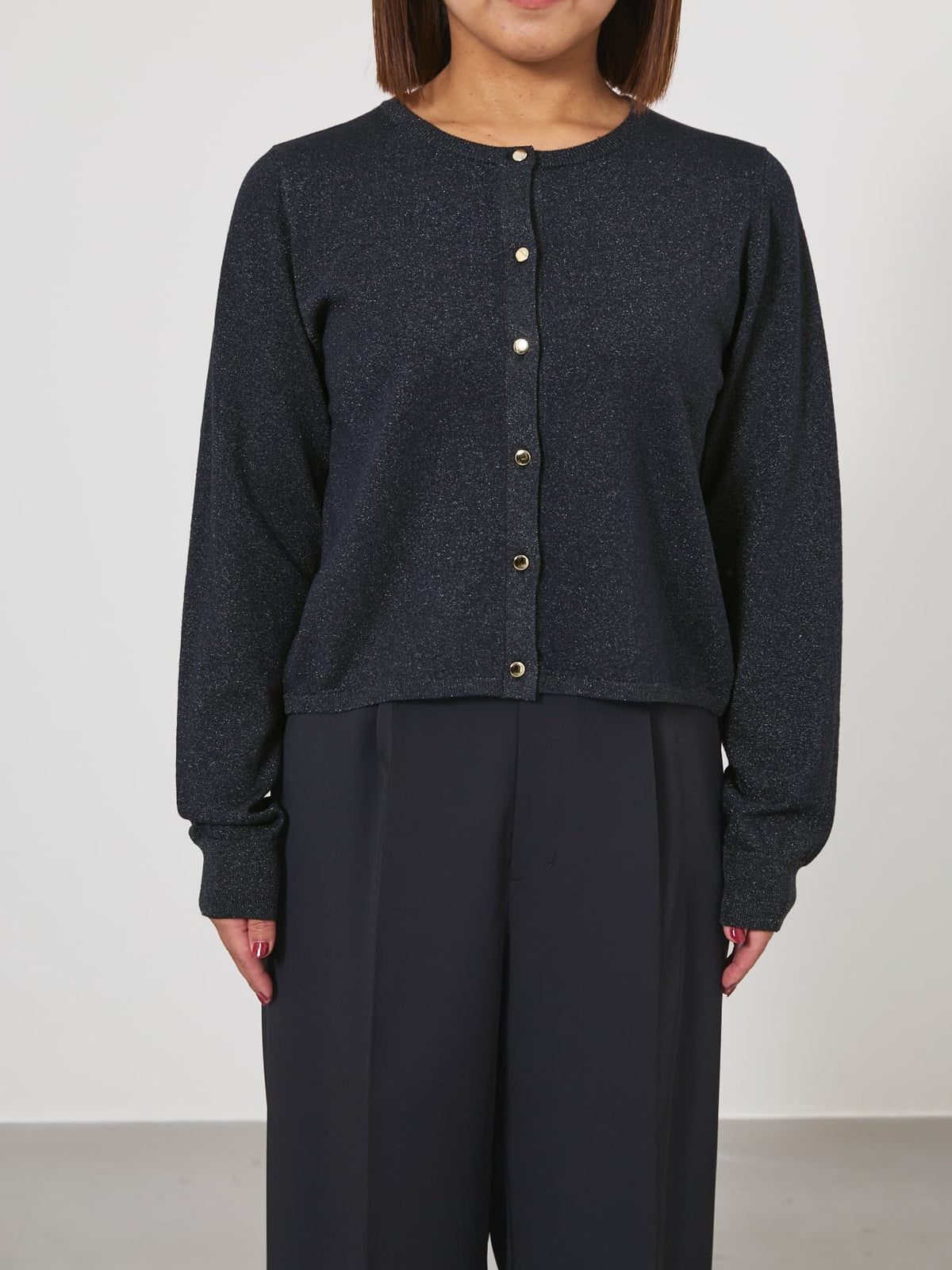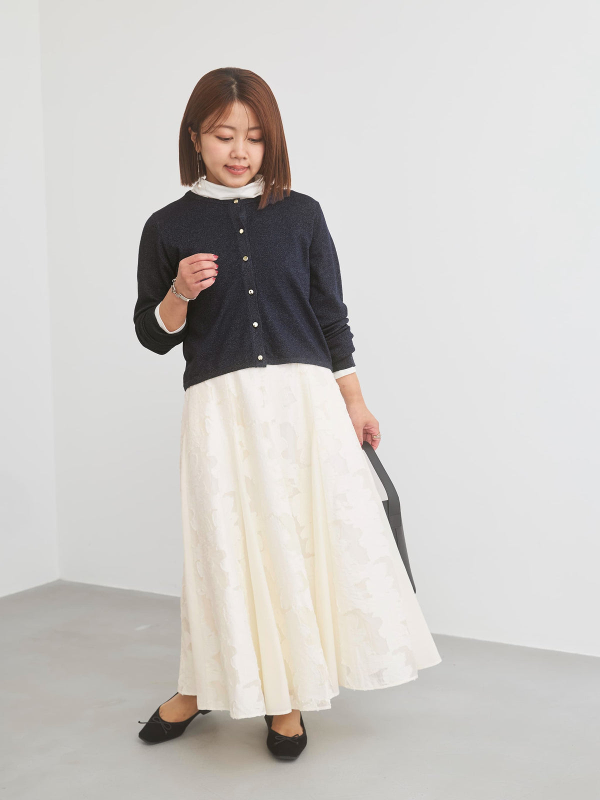 きちんと感と女性らしさを引き立てる上品なきらめきをまとったニットカーディガン。