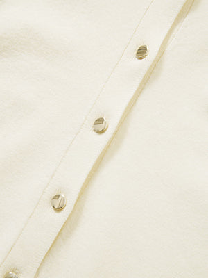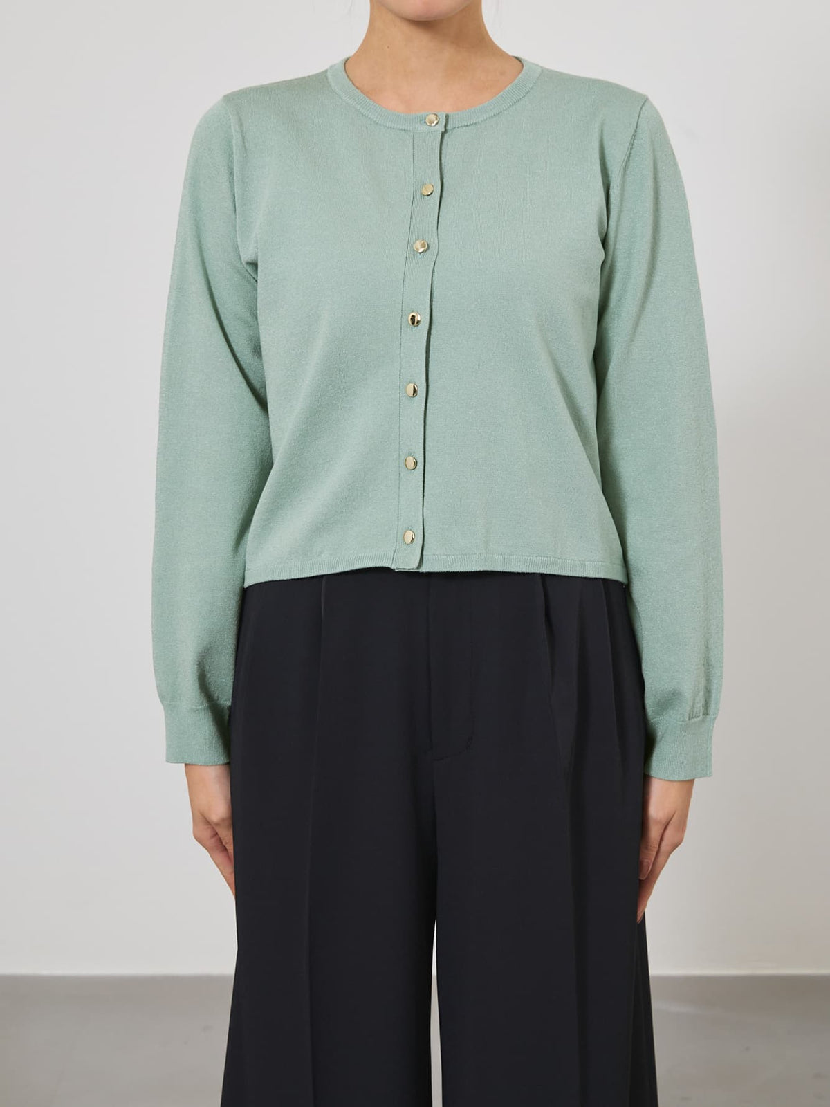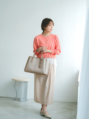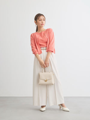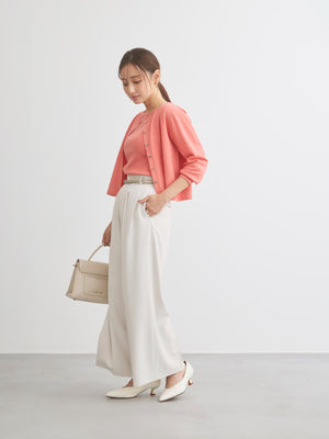 オフィススタイルからデイリー使いまで幅広いシーンに寄り添う万能アイテムです。同素材のグロッシー2wayゴールドボタンリブニットとセットでの着用も◎