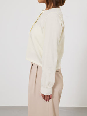 襟元はクルーネックですっきりと。コンパクトながらもボックスシルエットの程よいサイズ感で、ベーシックにバランス良く着こなせる1枚に仕上げました。