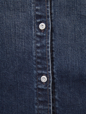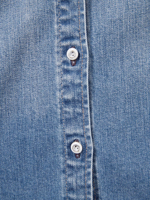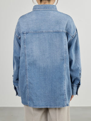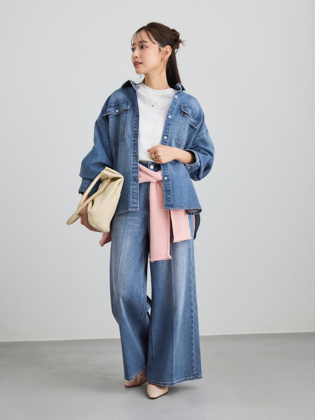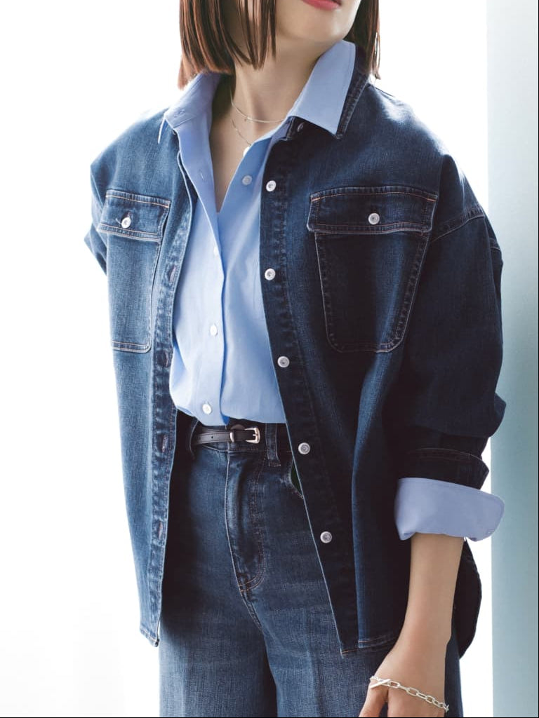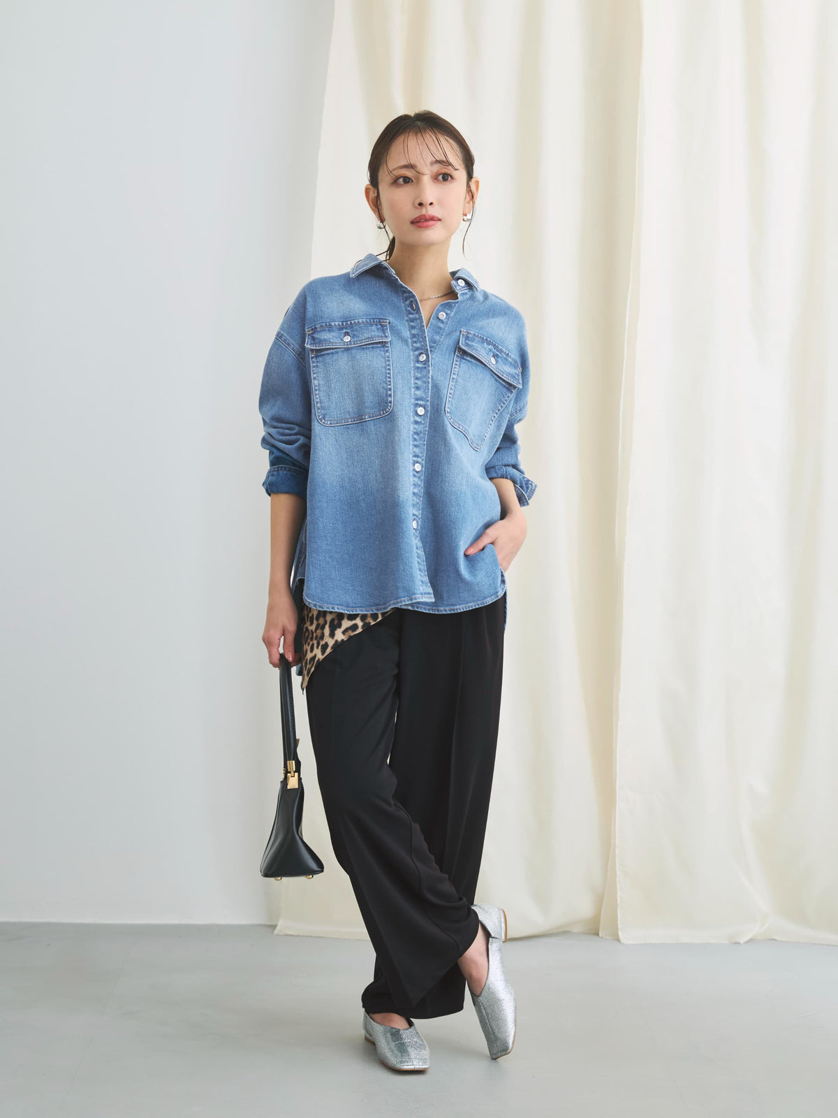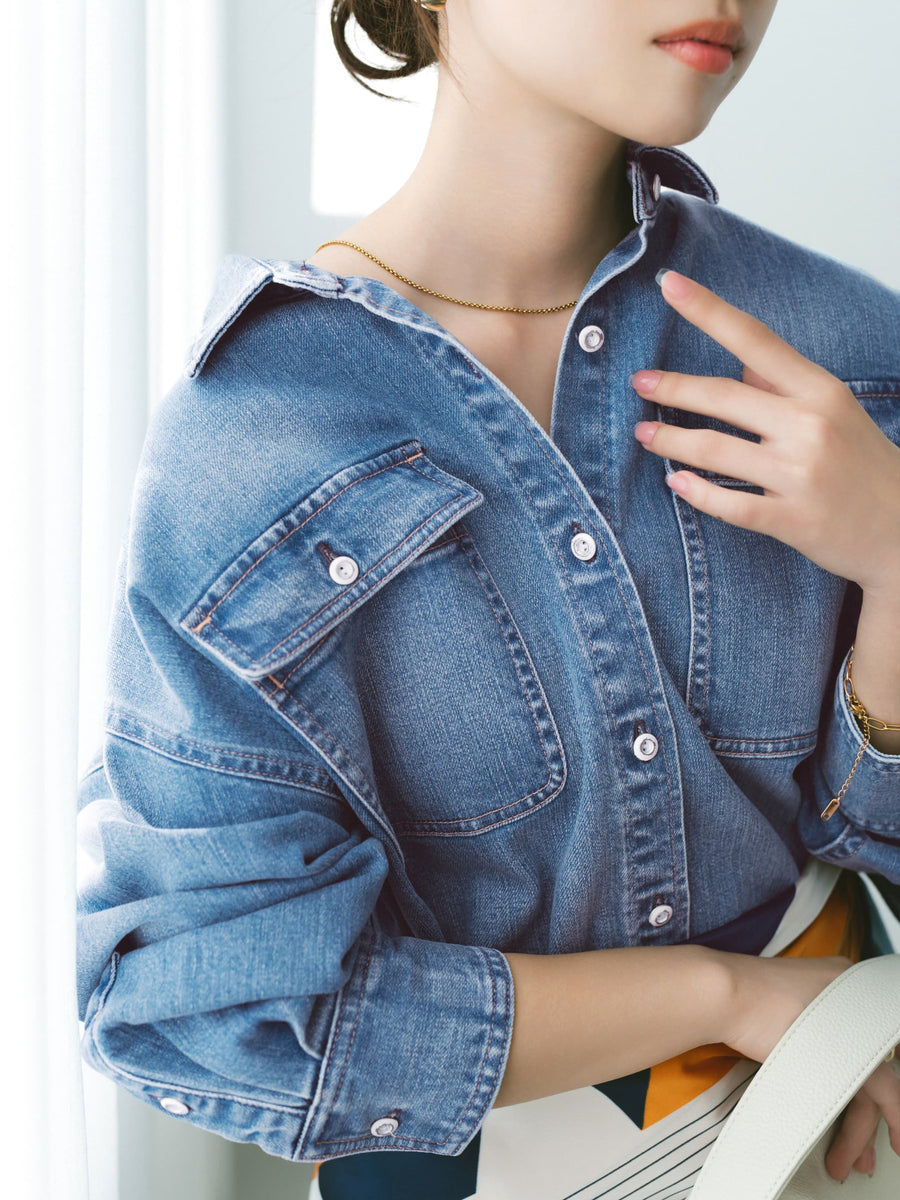 素材に落ち感があり、ほんのりとフェミニンさが漂うデザインなので、通常のデニムシャツよりもカジュアルになりすぎず、どんなアイテムとも橋渡しをして、コーディネートを品よくしてくれます。