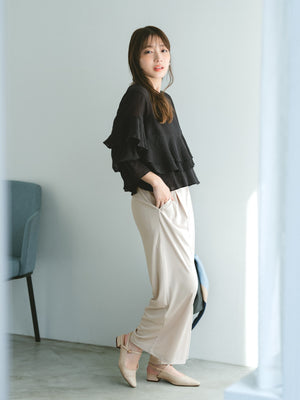 ウエストはオールゴム仕様でありながらもフロントはギャザーを寄せていないので、トップスをインしてもすっきり見えが叶います。また、ウエスト裏はドロスト仕様なので好みのフィット感で着用できるのも嬉しいポイント。