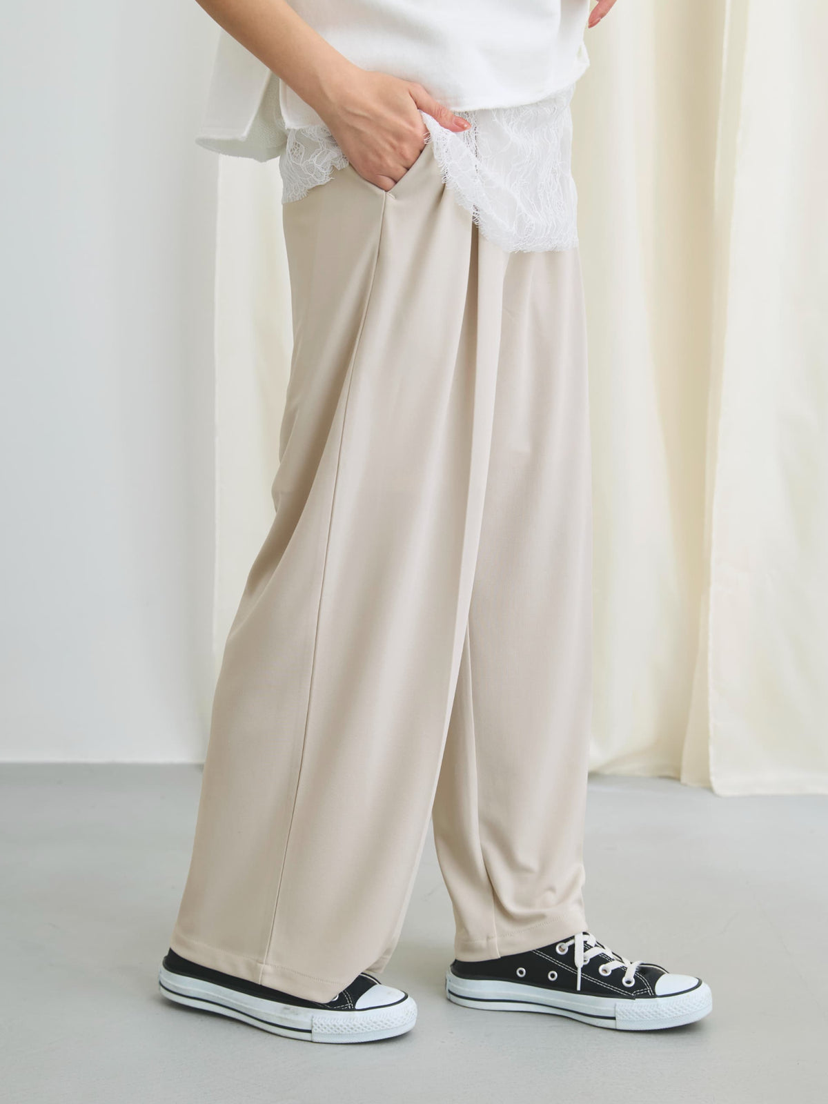 リラクシーなのに、綺麗めスタイルが叶う優れもの!ウエスト紐付き+ゴムの伸縮が良く、着心地もゆったり快適です♡