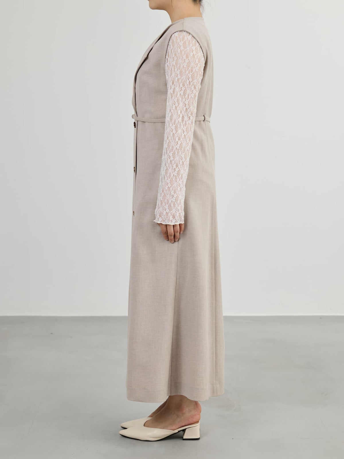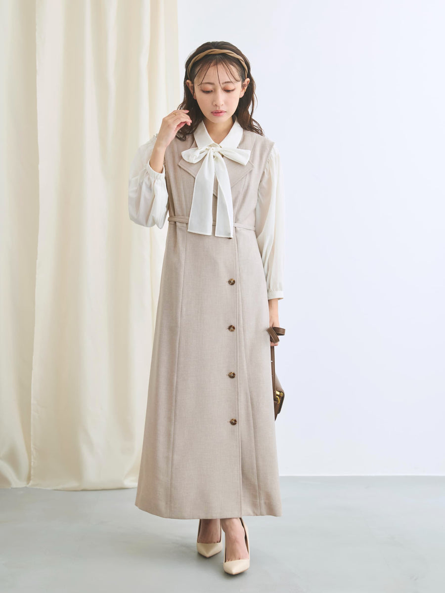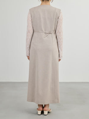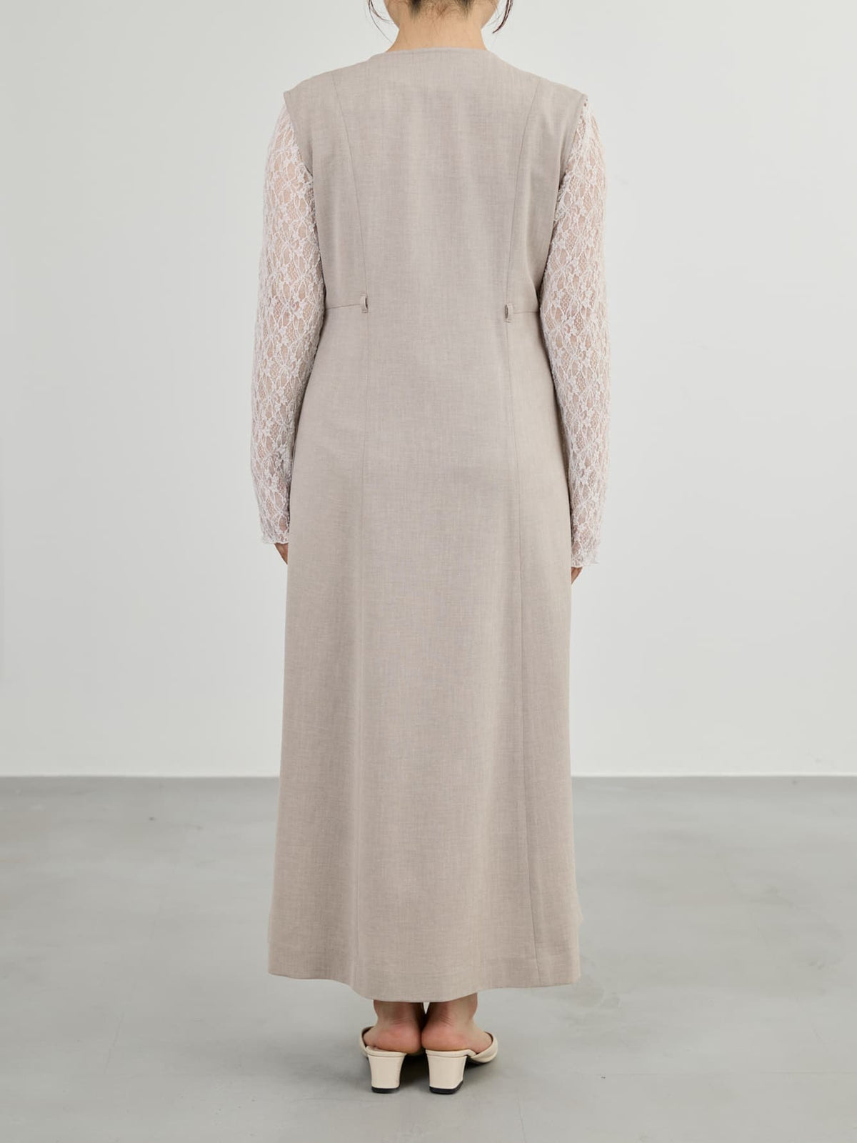 リネンのようなナチュラルな表情を持ちながらも、きちんと感のある上品な素材で仕立てたジレワンピース。