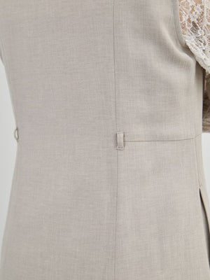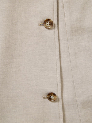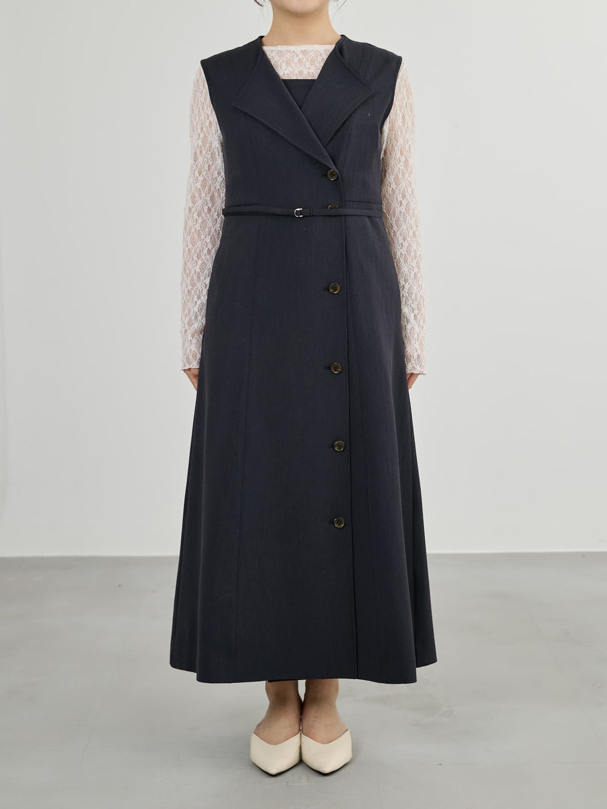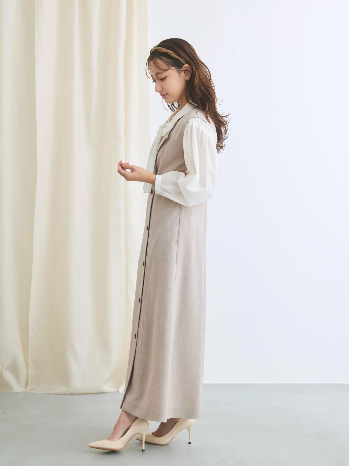リネンのようなナチュラルな表情を持ちながらも、きちんと感のある上品な素材で仕立てたジレワンピース。
