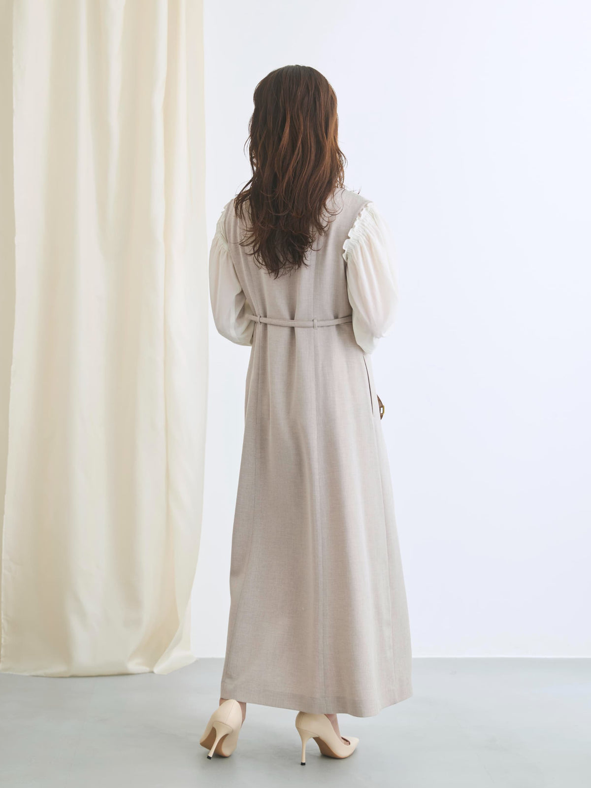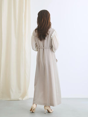 結び方次第でシルエットのアレンジが可能な共布の細リボンベルト付きで自然なくびれを演出します。