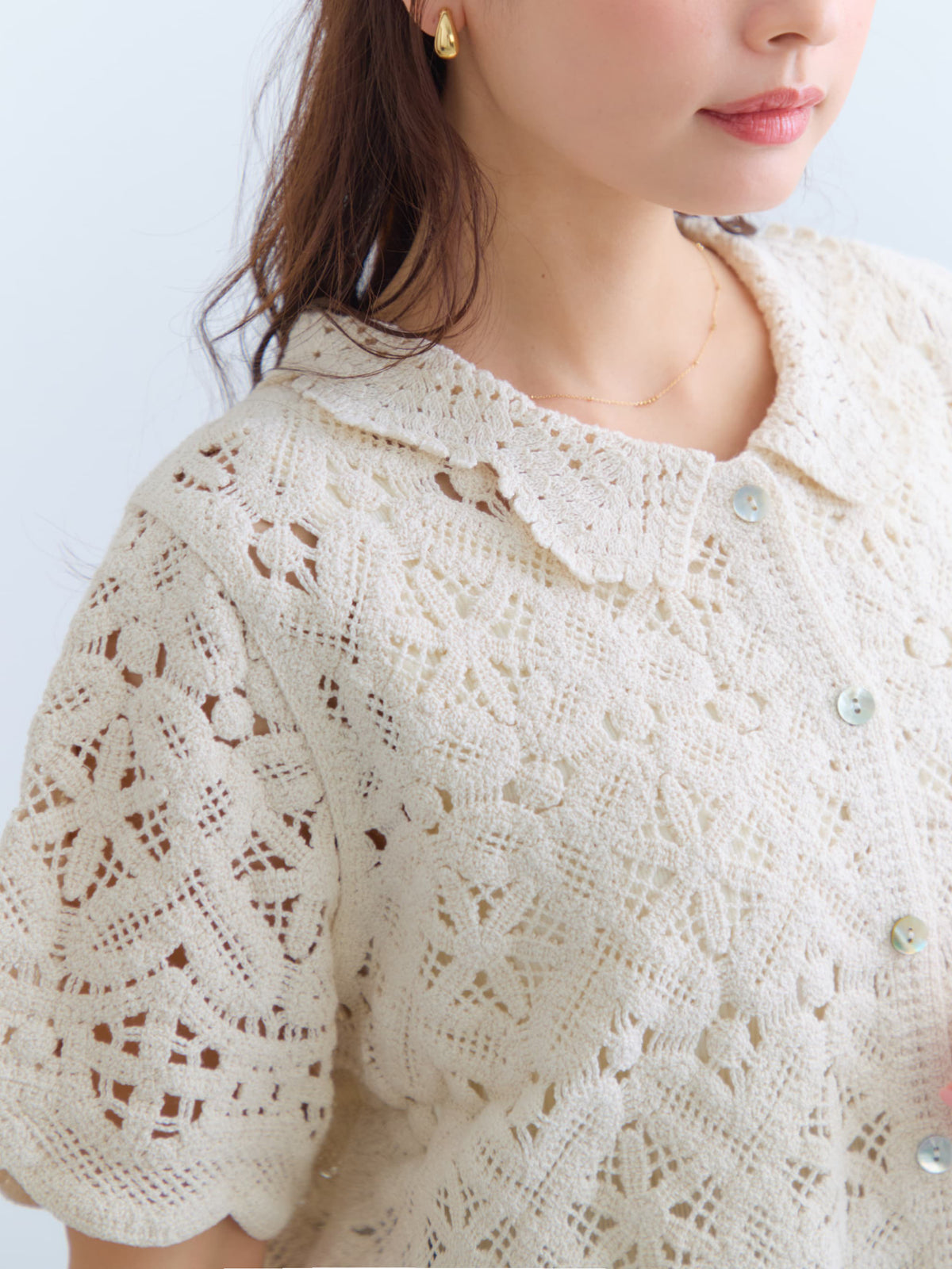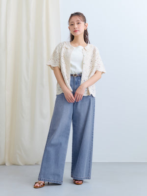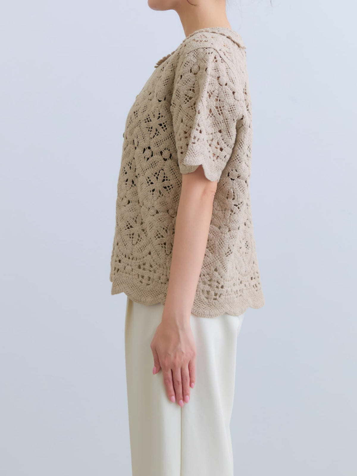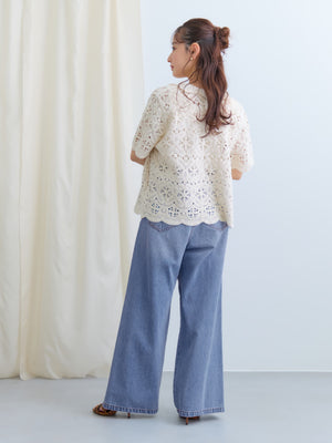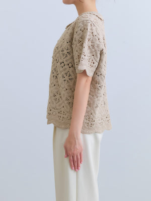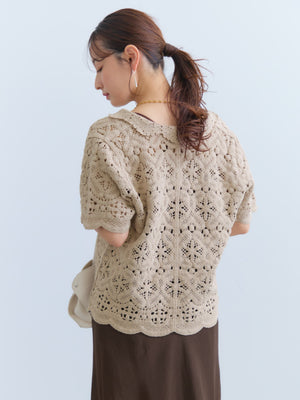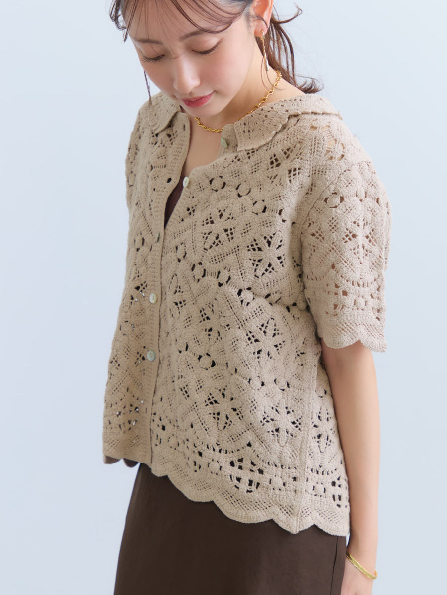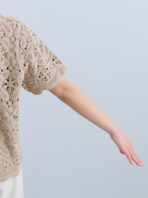 繊細なクロシェ編みが目を惹くナチュラルな雰囲気のトップス。やさしいカラーがコーデに柔らかさをプラスし、軽やかで女性らしい印象に。