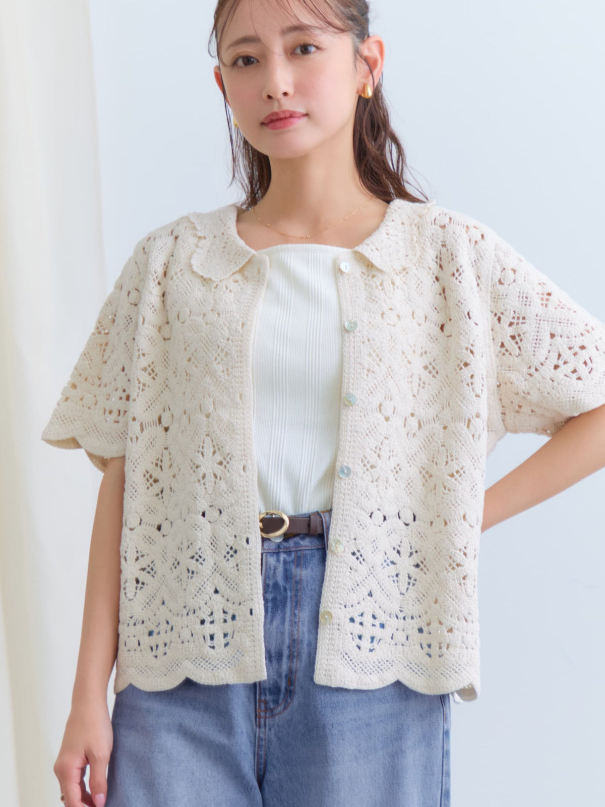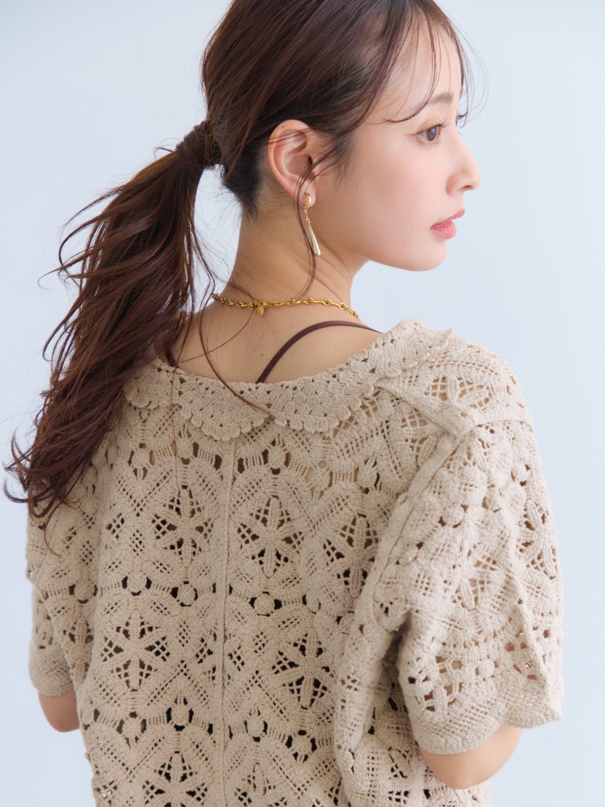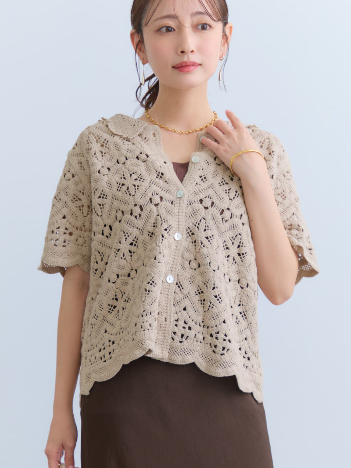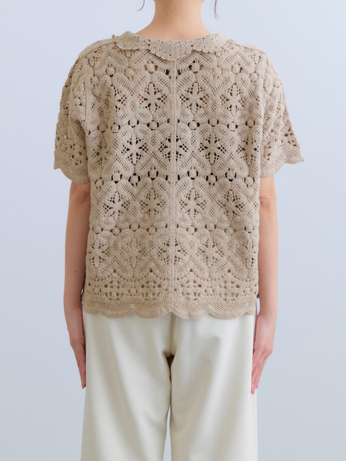 繊細なクロシェ編みが目を惹くナチュラルな雰囲気のトップス。やさしいカラーがコーデに柔らかさをプラスし、軽やかで女性らしい印象に。