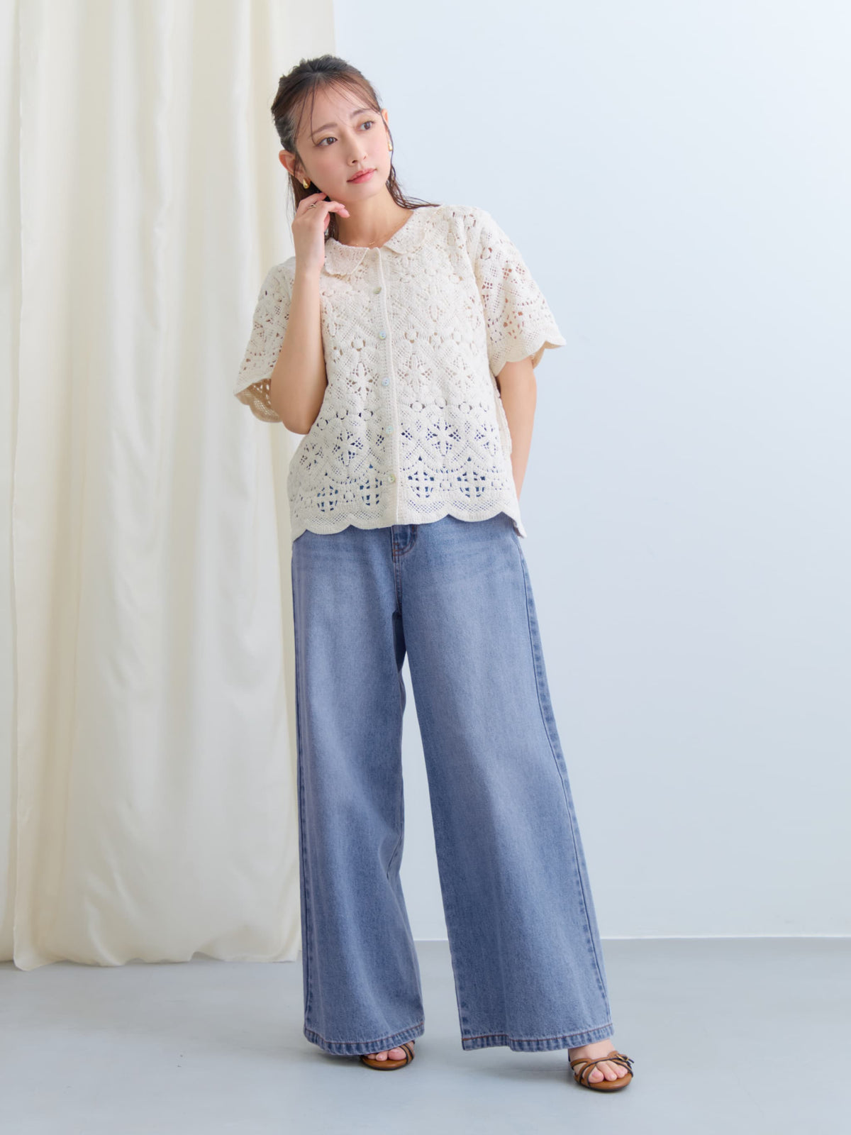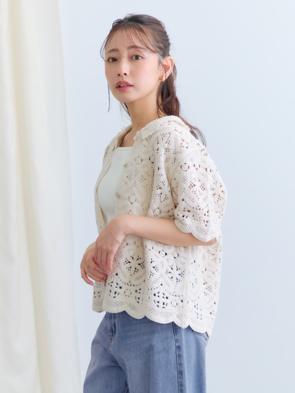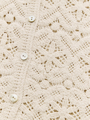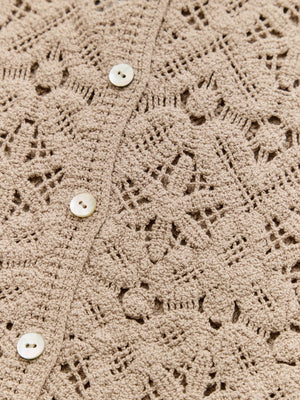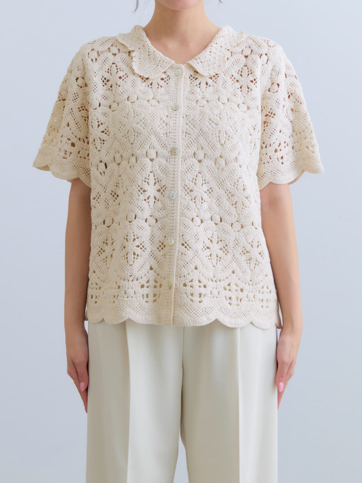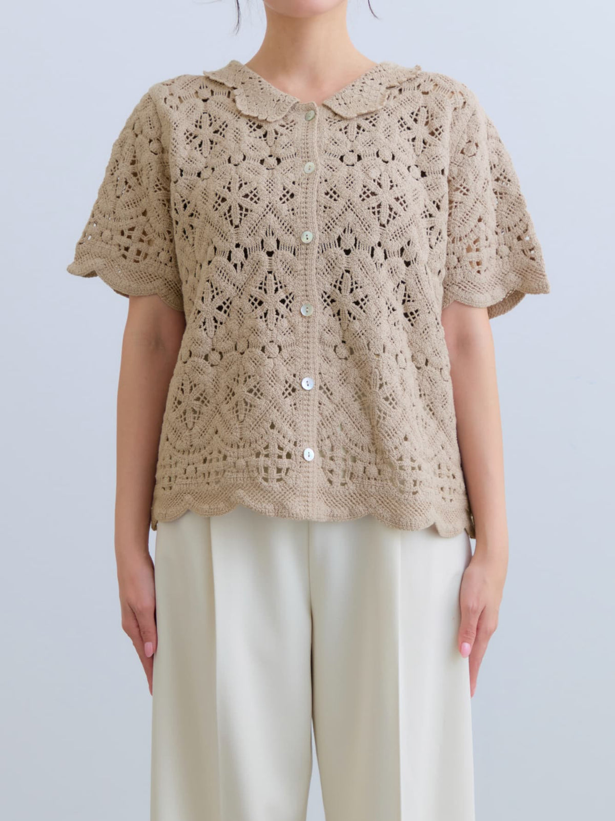 繊細なクロシェ編みが目を惹くナチュラルな雰囲気のトップス。やさしいカラーがコーデに柔らかさをプラスし、軽やかで女性らしい印象に。