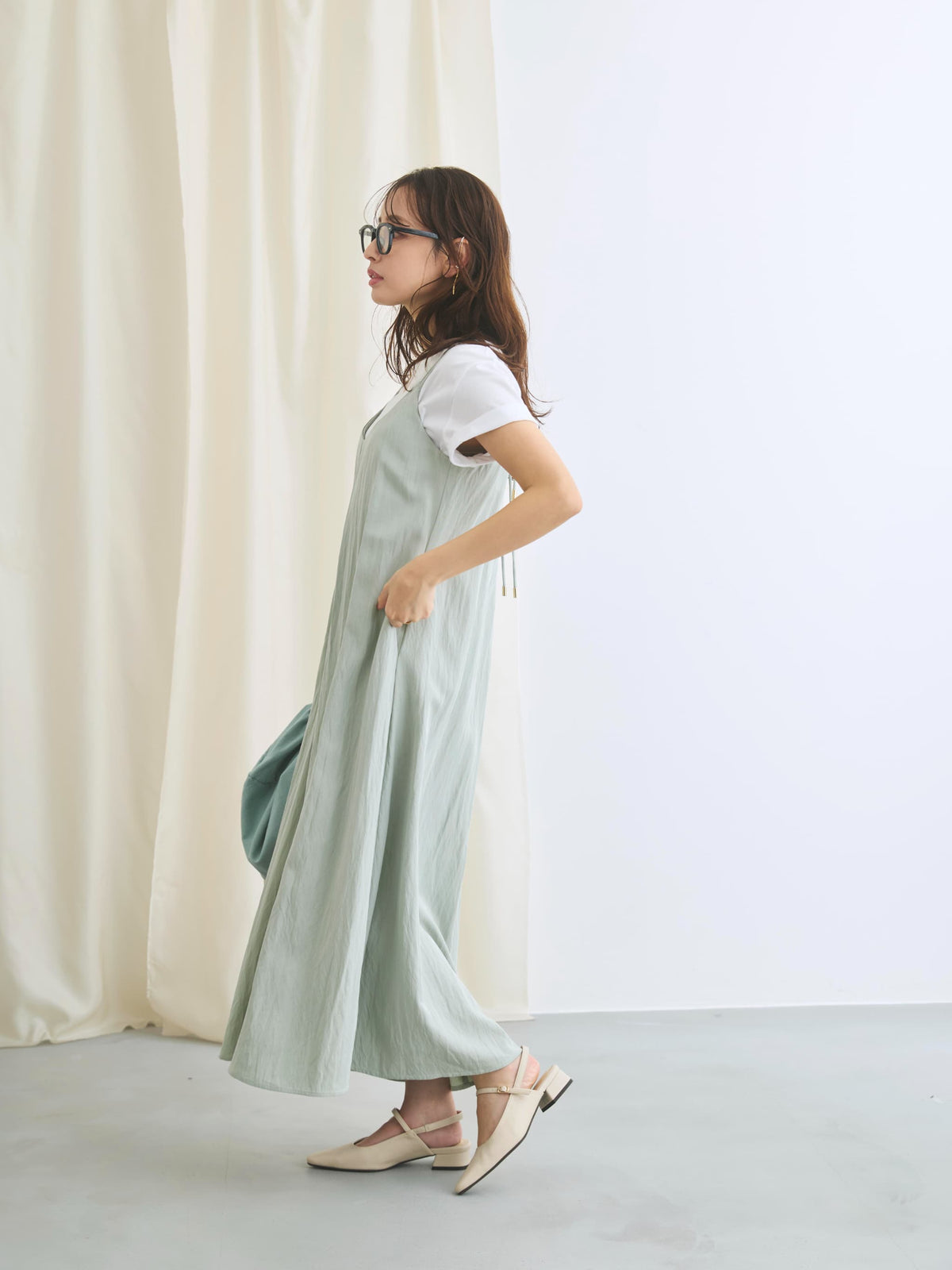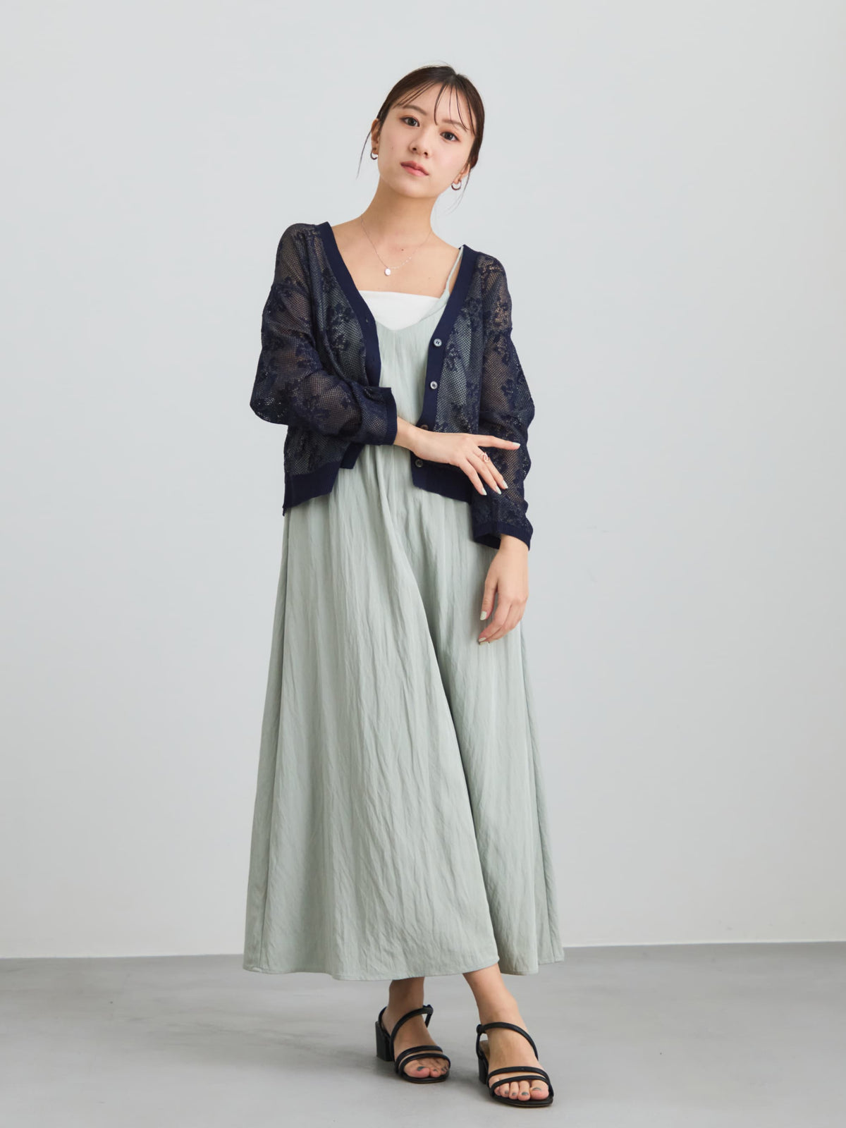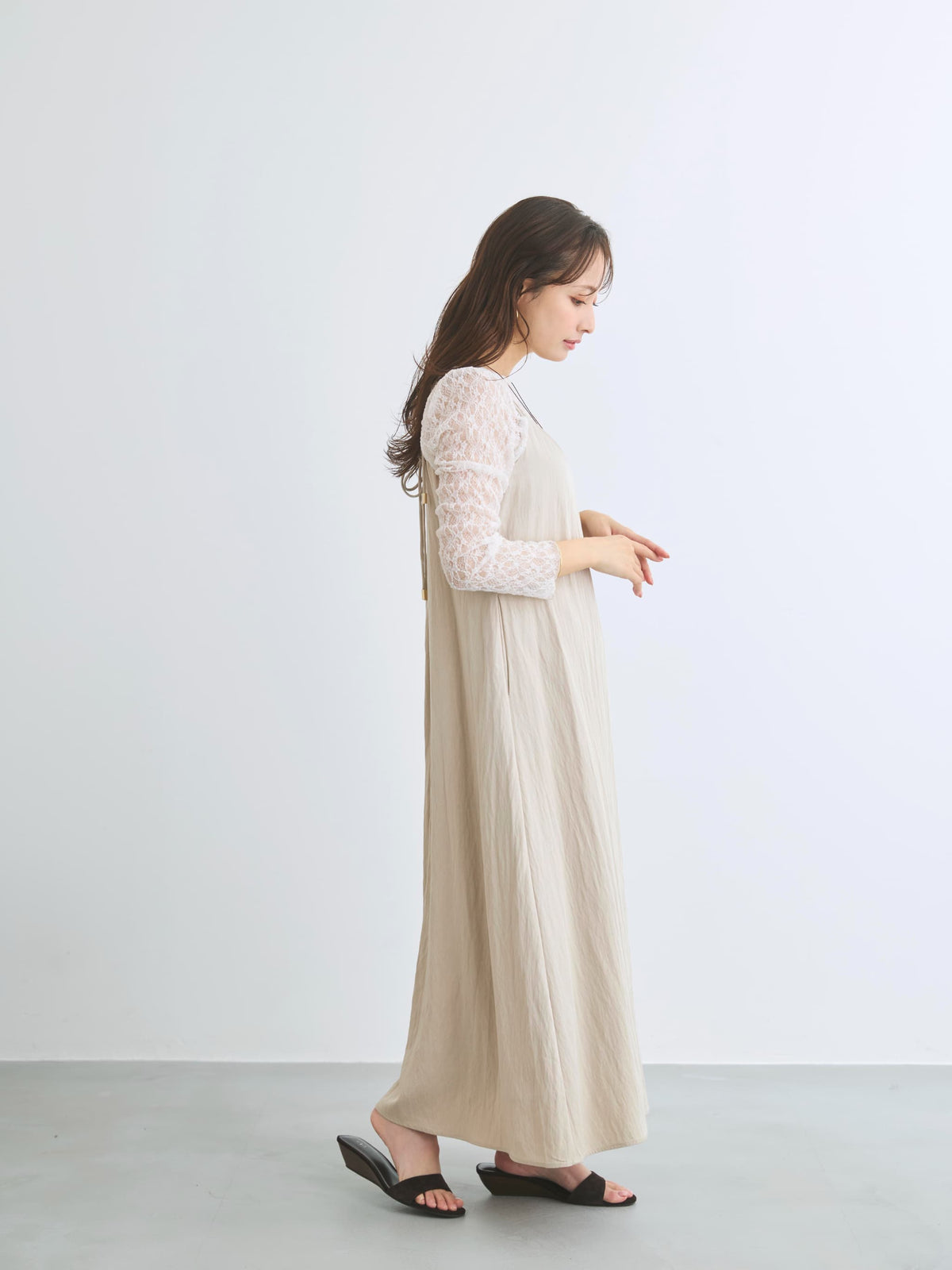 足元はサンダルやフラットシューズで軽やかにまとめるのがおすすめ。インナー次第で雰囲気を変えられる、きれいめにもカジュアルにも着回せる万能ワンピースです。