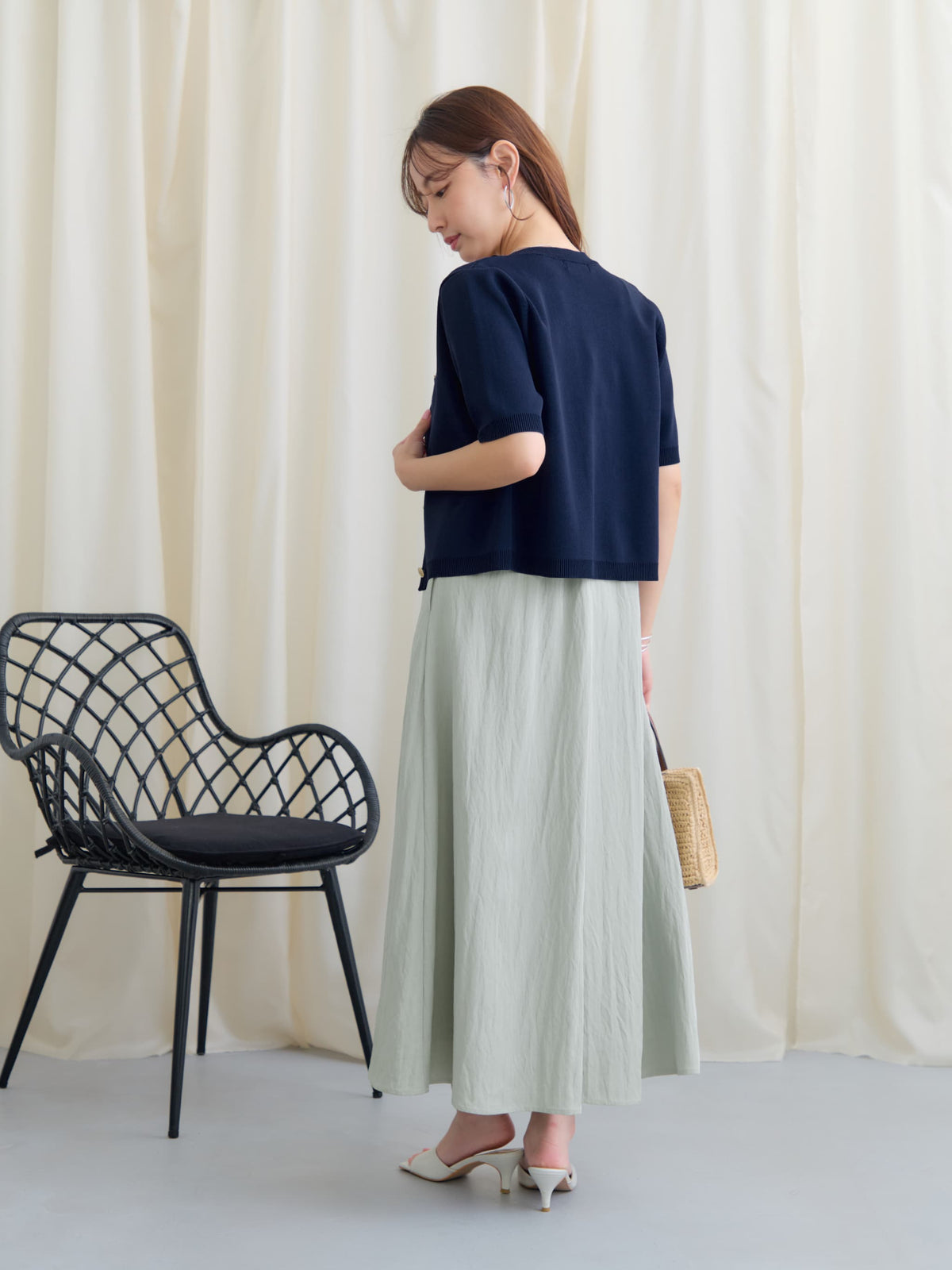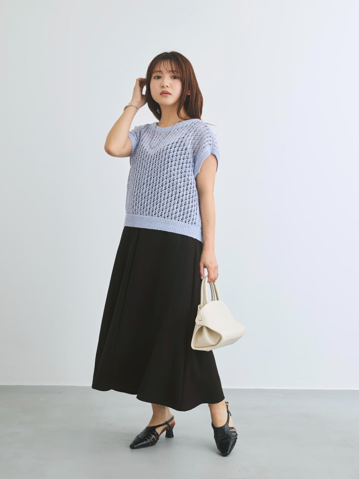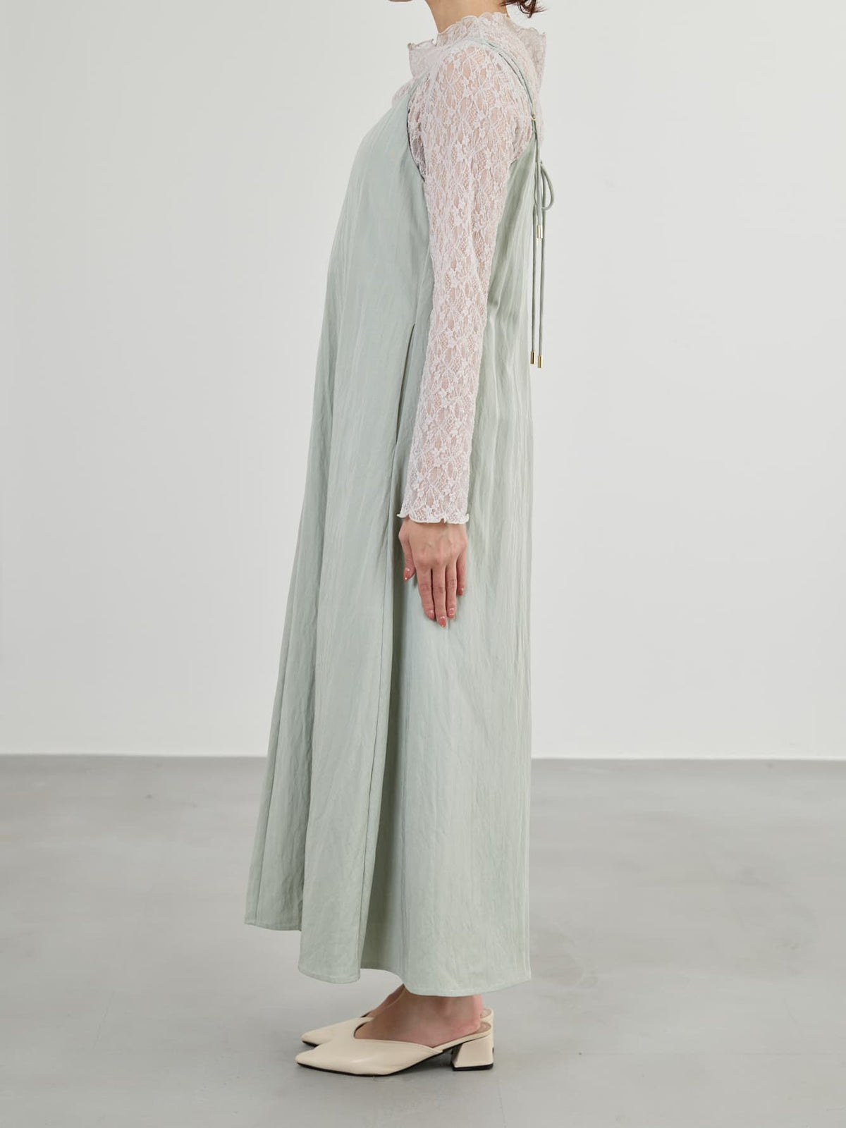 足元はサンダルやフラットシューズで軽やかにまとめるのがおすすめ。インナー次第で雰囲気を変えられる、きれいめにもカジュアルにも着回せる万能ワンピースです。