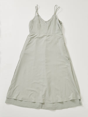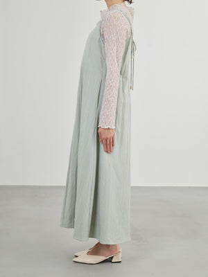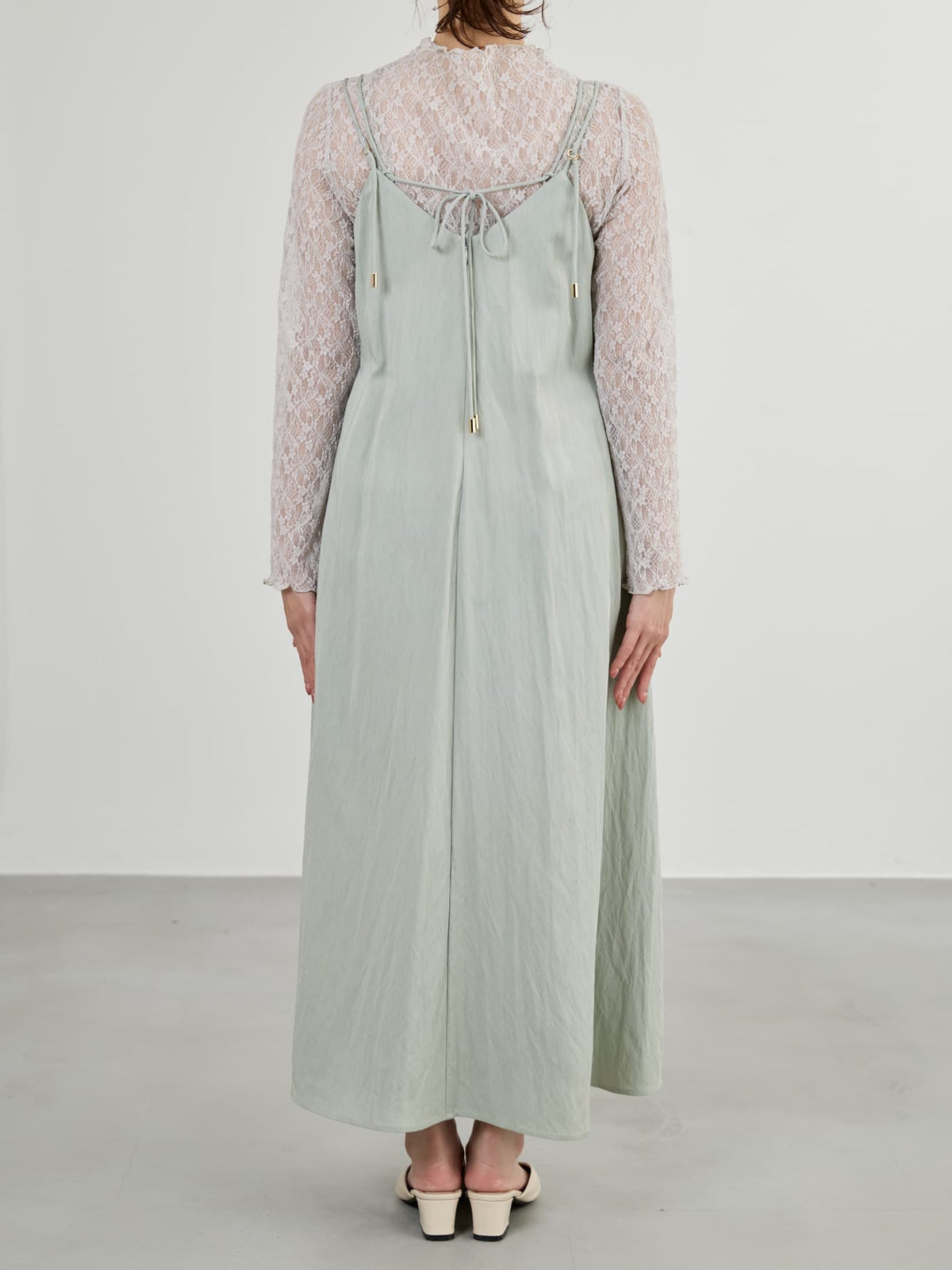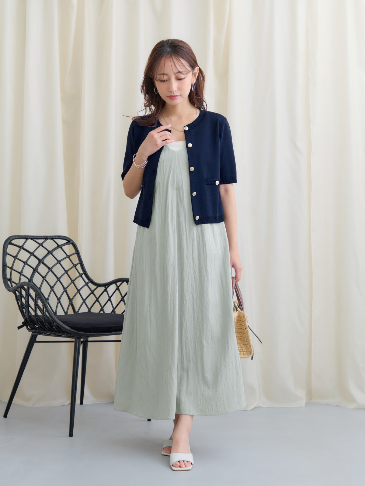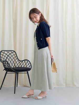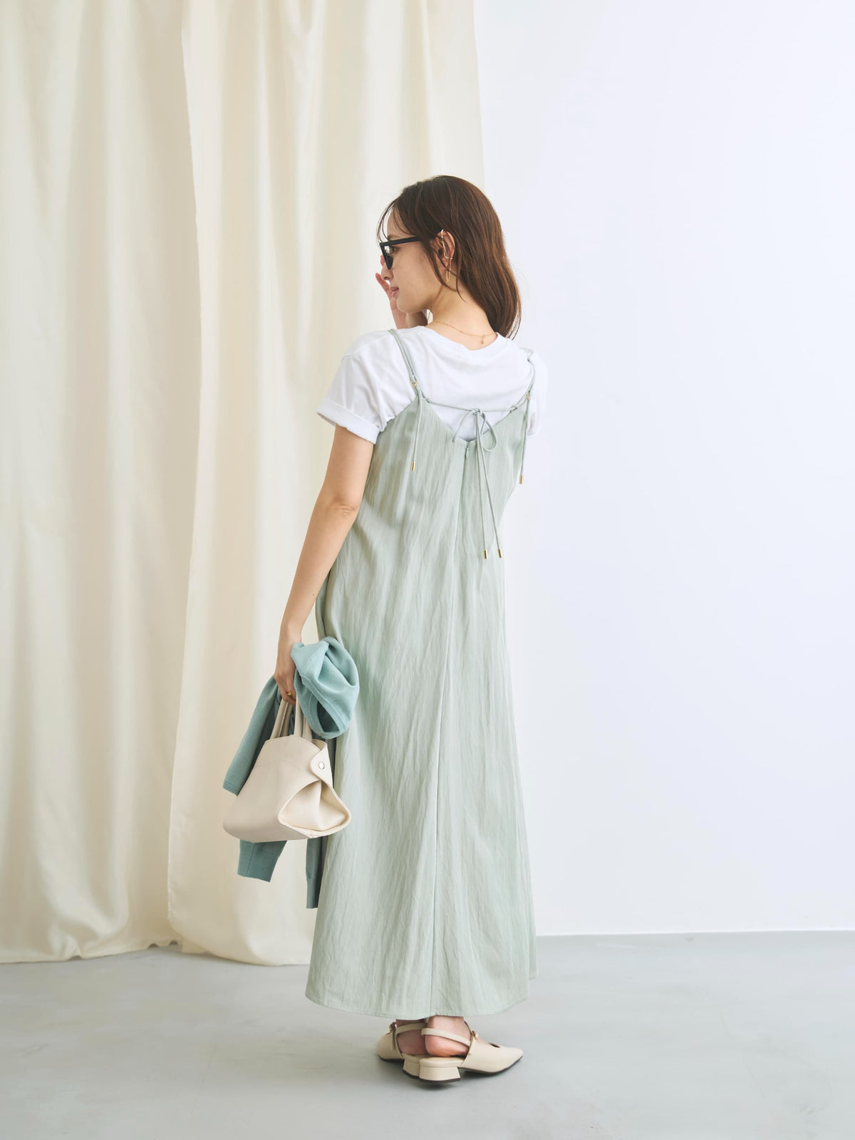 フロントが重なったレイヤードデザインが印象的なキャミワンピース。立体感のあるディテールがシンプルながらも着映えし、奥行きのあるスタイルを演出してくれます。ウエストまわりはすっきりと見せつつ、裾に向かってふんわり広がる女性らしいシルエットに。小柄さんがバランスよく着られるよう、COHINAならではの丈感とパターンにこだわりました。華奢なストラップは後ろでリボン結びができる仕様。先端にはさりげなく光るチャームをあしらい、バックスタイルまで抜かりなく仕上げています。