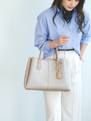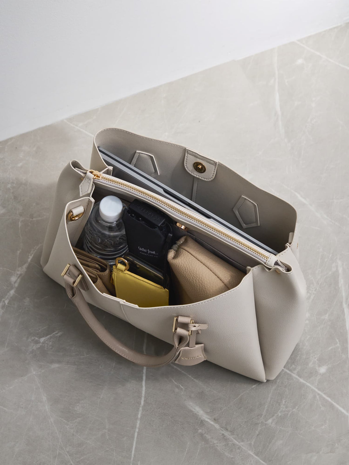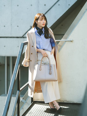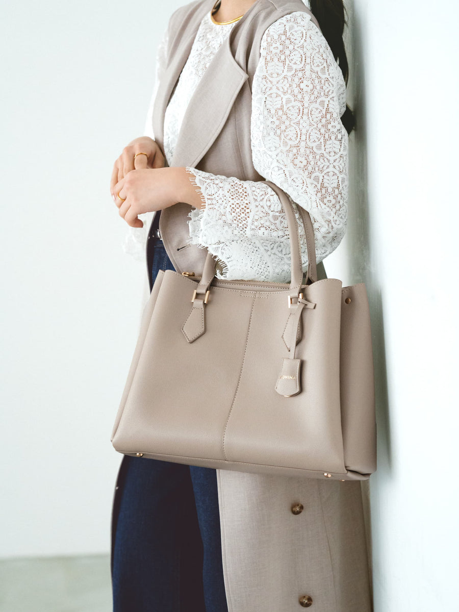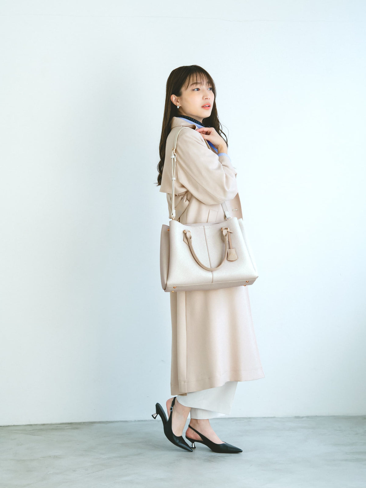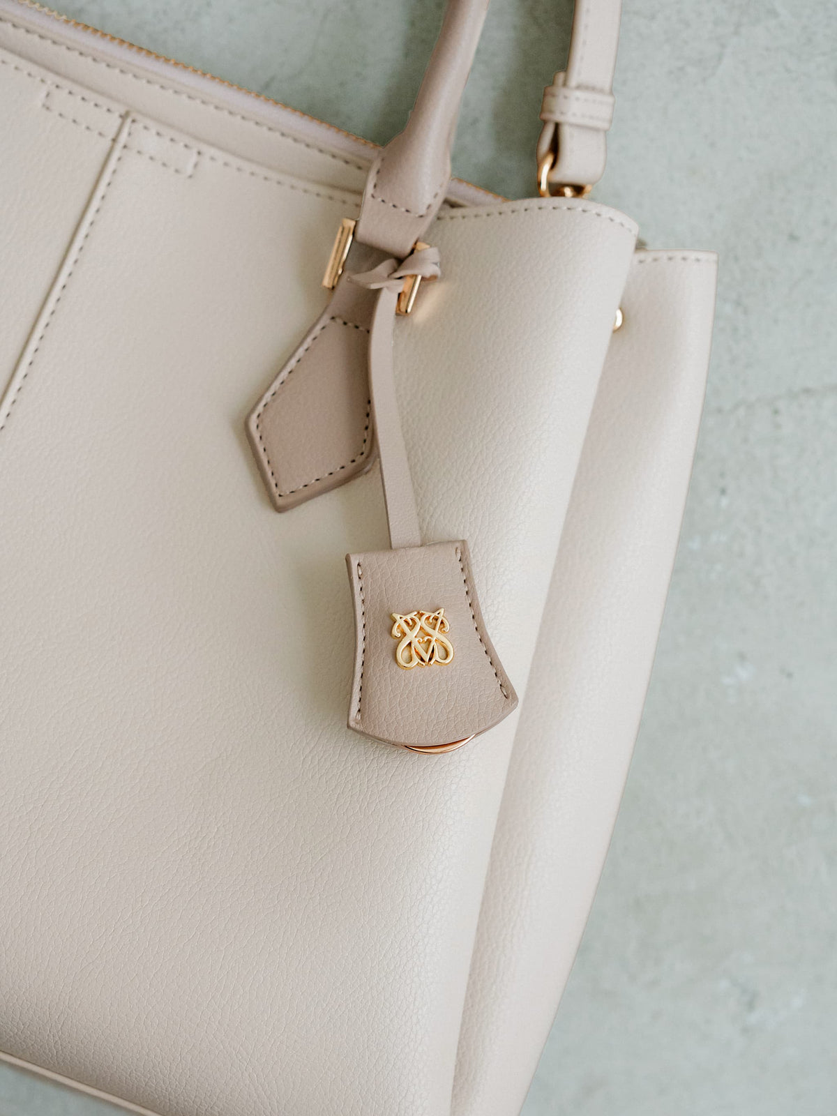 A4書類や13インチPCが収まる実用性を備えながら、大きく見えすぎない小柄設計、そして本体約625g(ショルダー込み約725g)の軽量仕様で、三層構造・口元ファスナー付き。取り外し可能なショルダーベルトを備えた2WAY仕様で、きちんと自立する上品なフォルムが特長。前後で異なるデザインを楽しめるキーチャームは取り外し可能。装いやシーンに合わせて印象を変えられます。