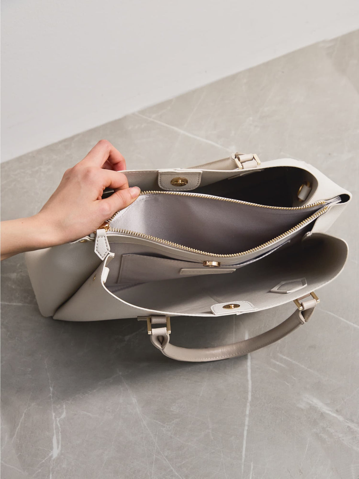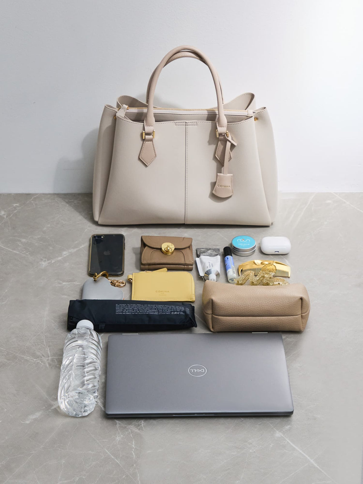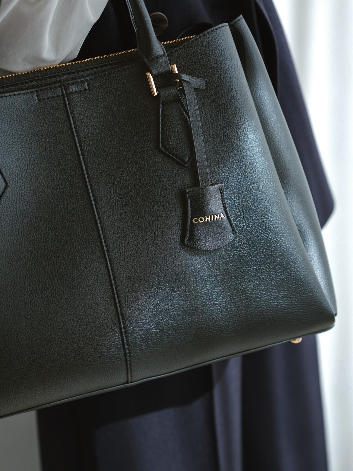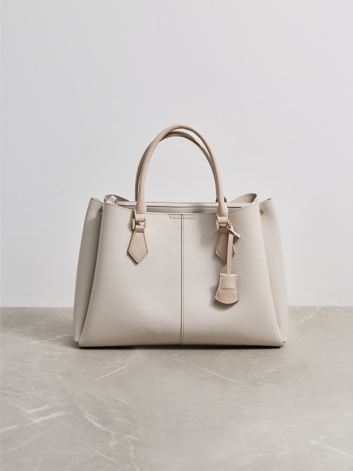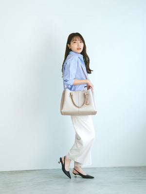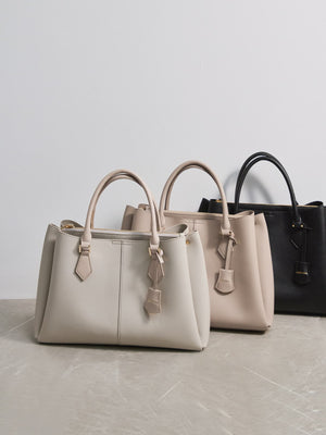 A4書類や13インチPCが収まる実用性を備えながら、大きく見えすぎない小柄設計、そして本体約625g(ショルダー込み約725g)の軽量仕様で、三層構造・口元ファスナー付き。取り外し可能なショルダーベルトを備えた2WAY仕様で、きちんと自立する上品なフォルムが特長。前後で異なるデザインを楽しめるキーチャームは取り外し可能。装いやシーンに合わせて印象を変えられます。