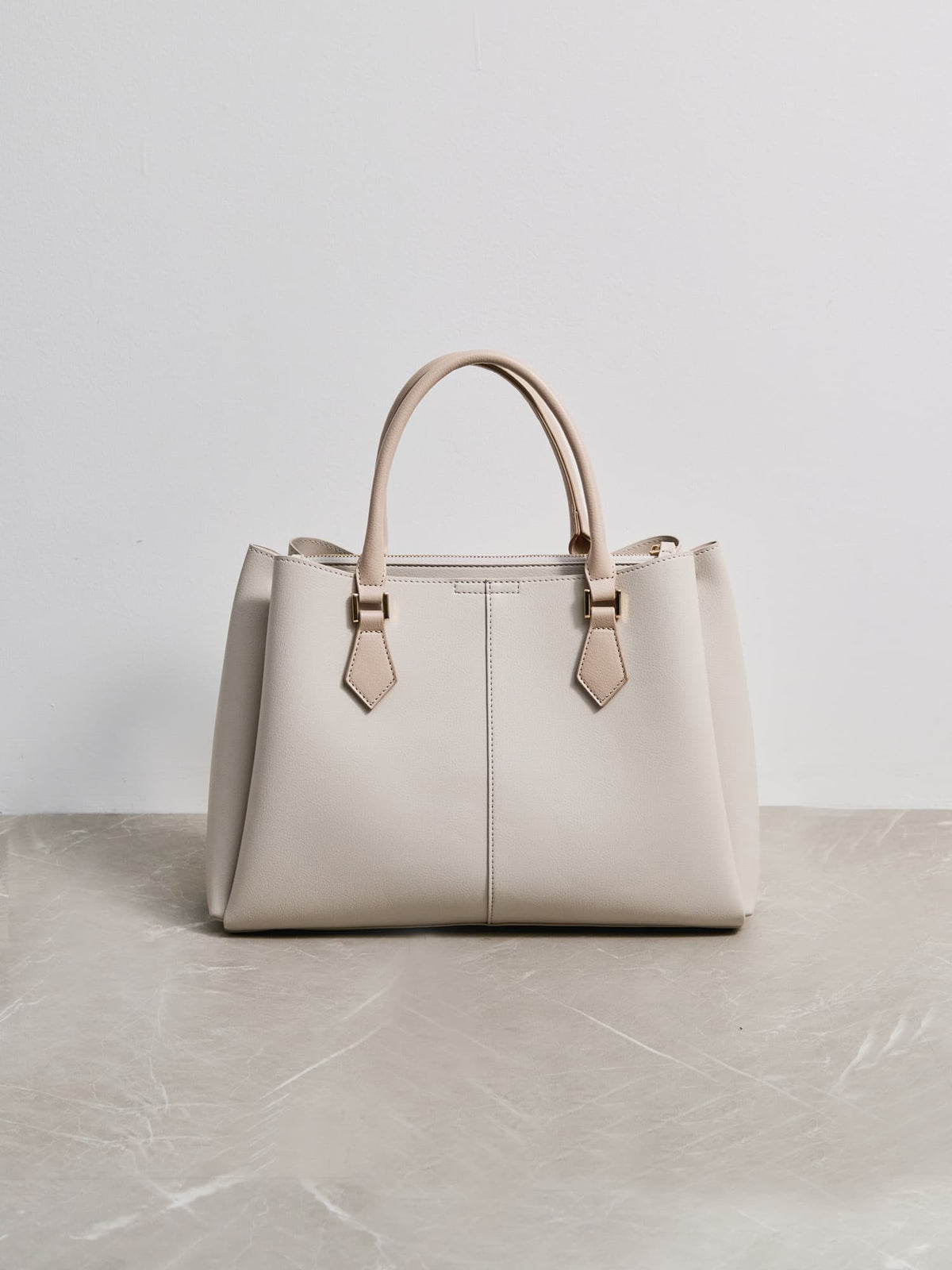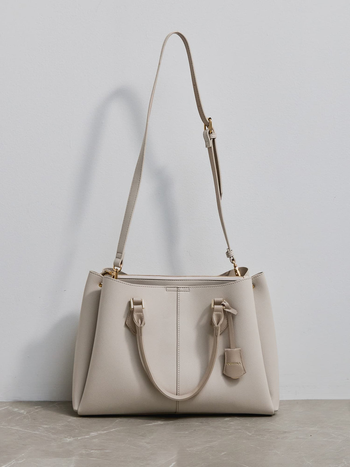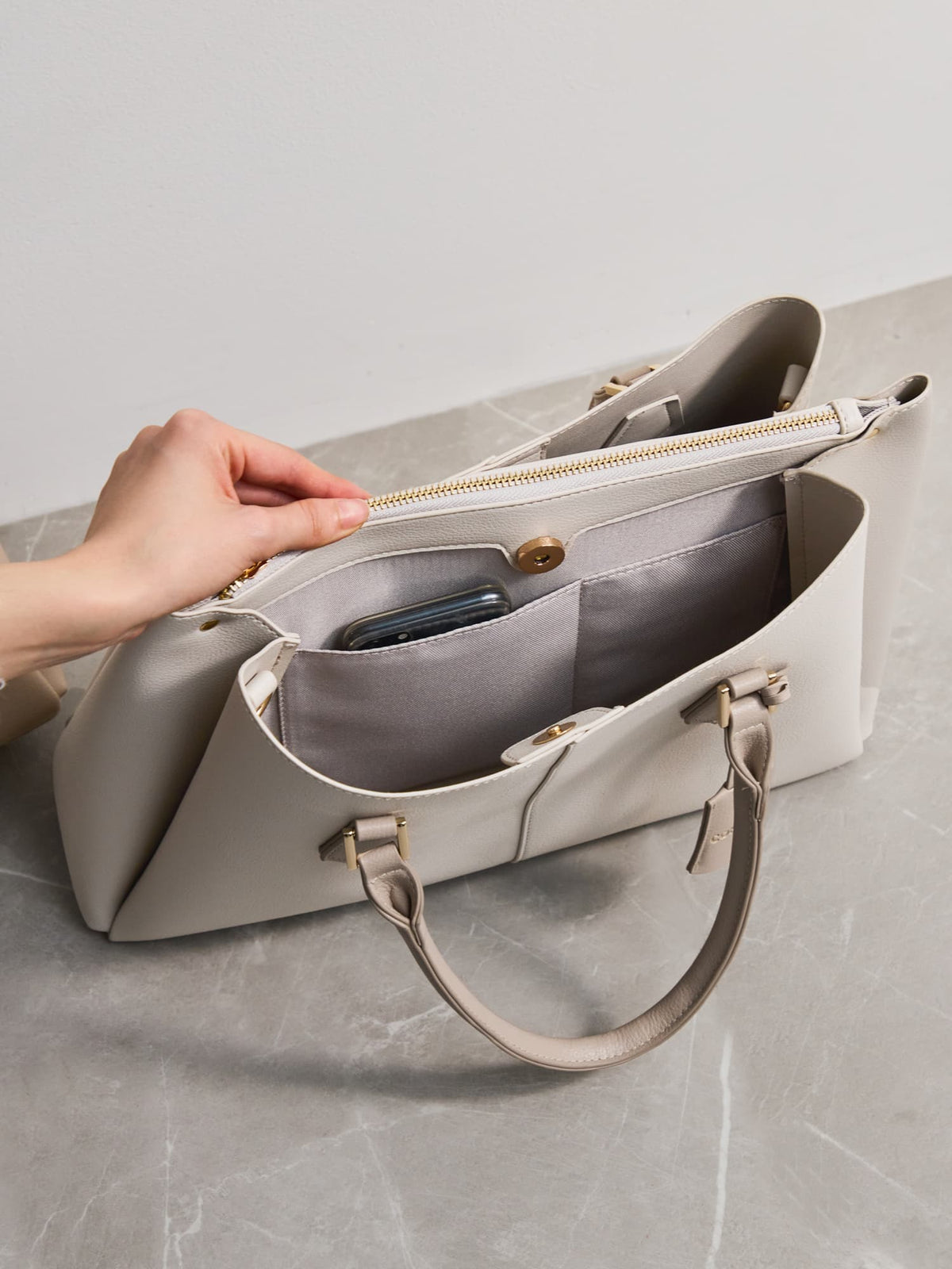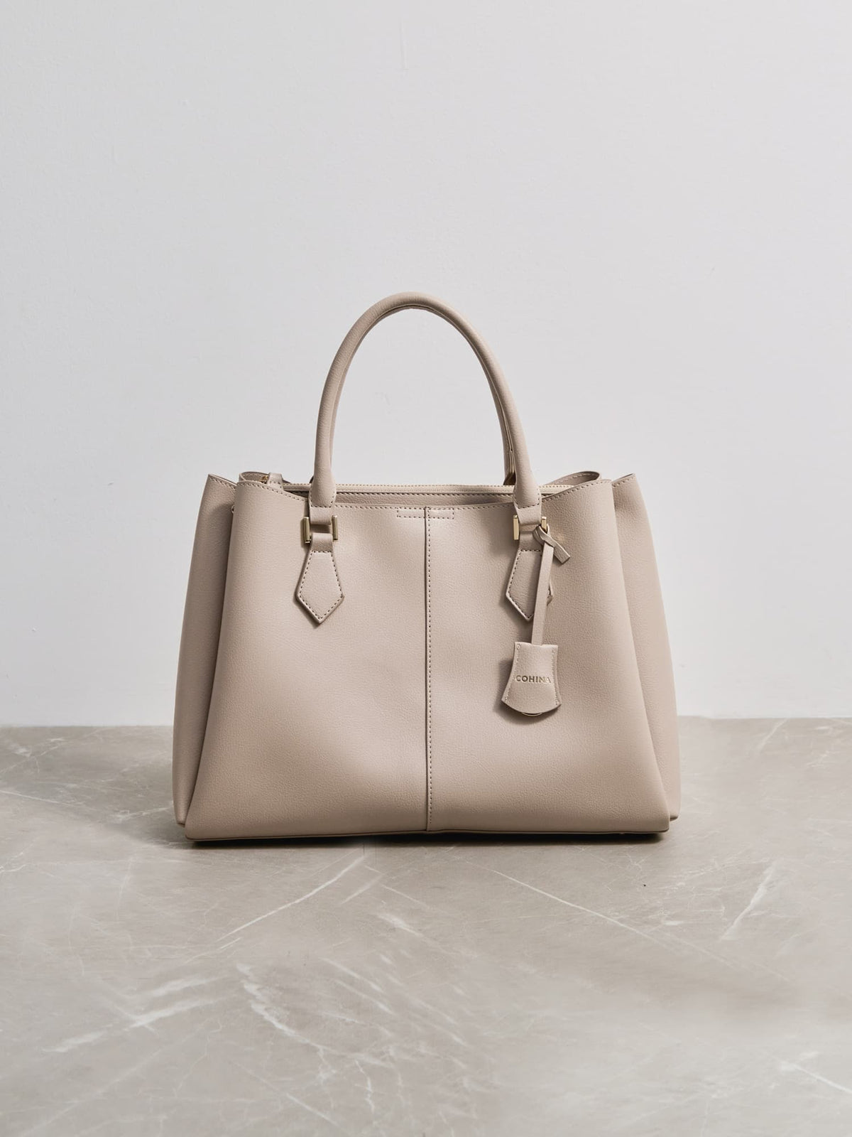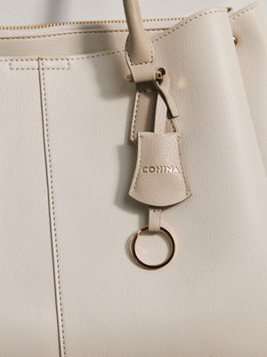A4書類や13インチPCが収まる実用性を備えながら、大きく見えすぎない小柄設計、そして本体約625g(ショルダー込み約725g)の軽量仕様で、三層構造・口元ファスナー付き。取り外し可能なショルダーベルトを備えた2WAY仕様で、きちんと自立する上品なフォルムが特長。前後で異なるデザインを楽しめるキーチャームは取り外し可能。装いやシーンに合わせて印象を変えられます。