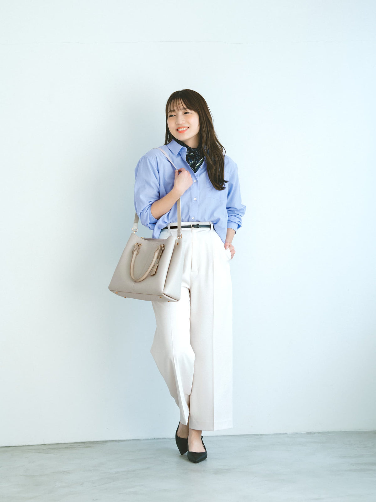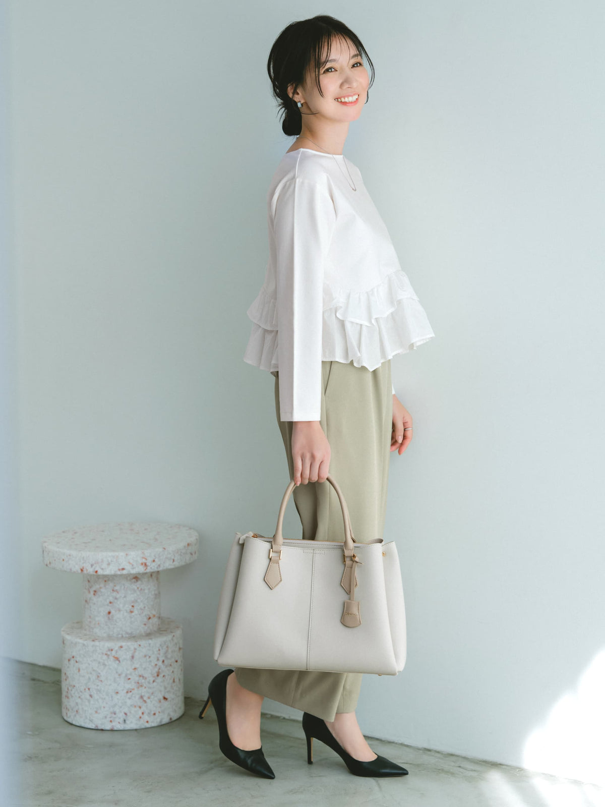 カジュアルシーンでは、小柄さんのために長さや仕様を整えたショルダーベルトを使用したコーディネートもおすすめです。