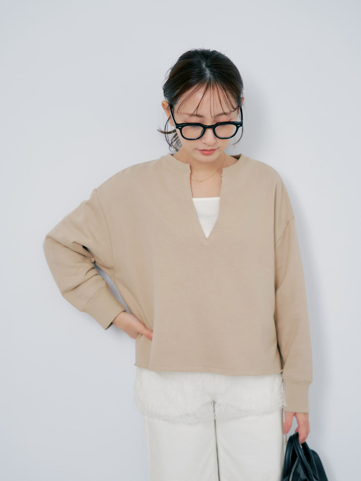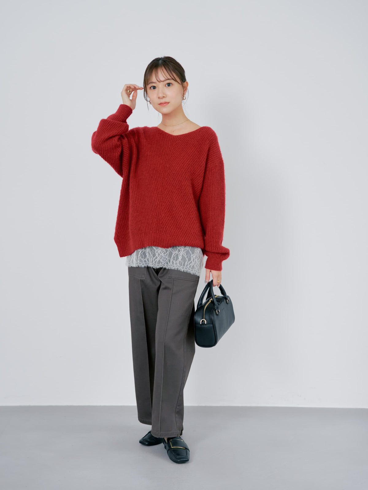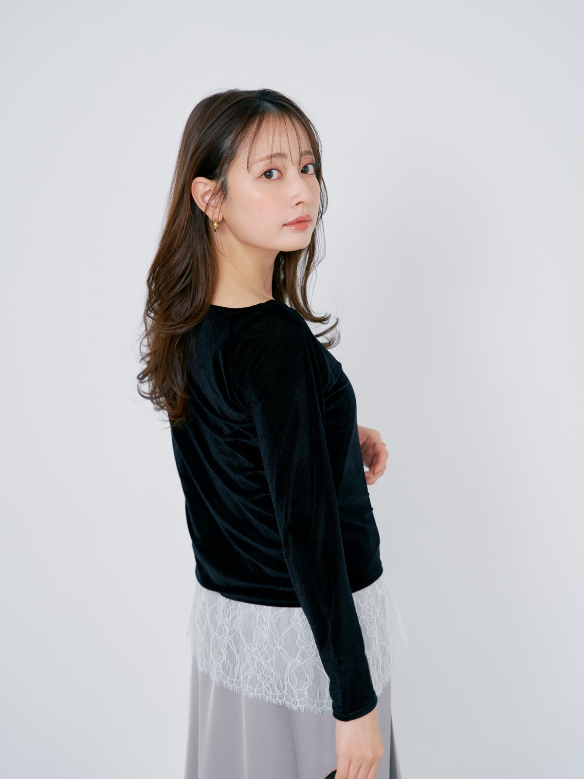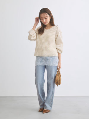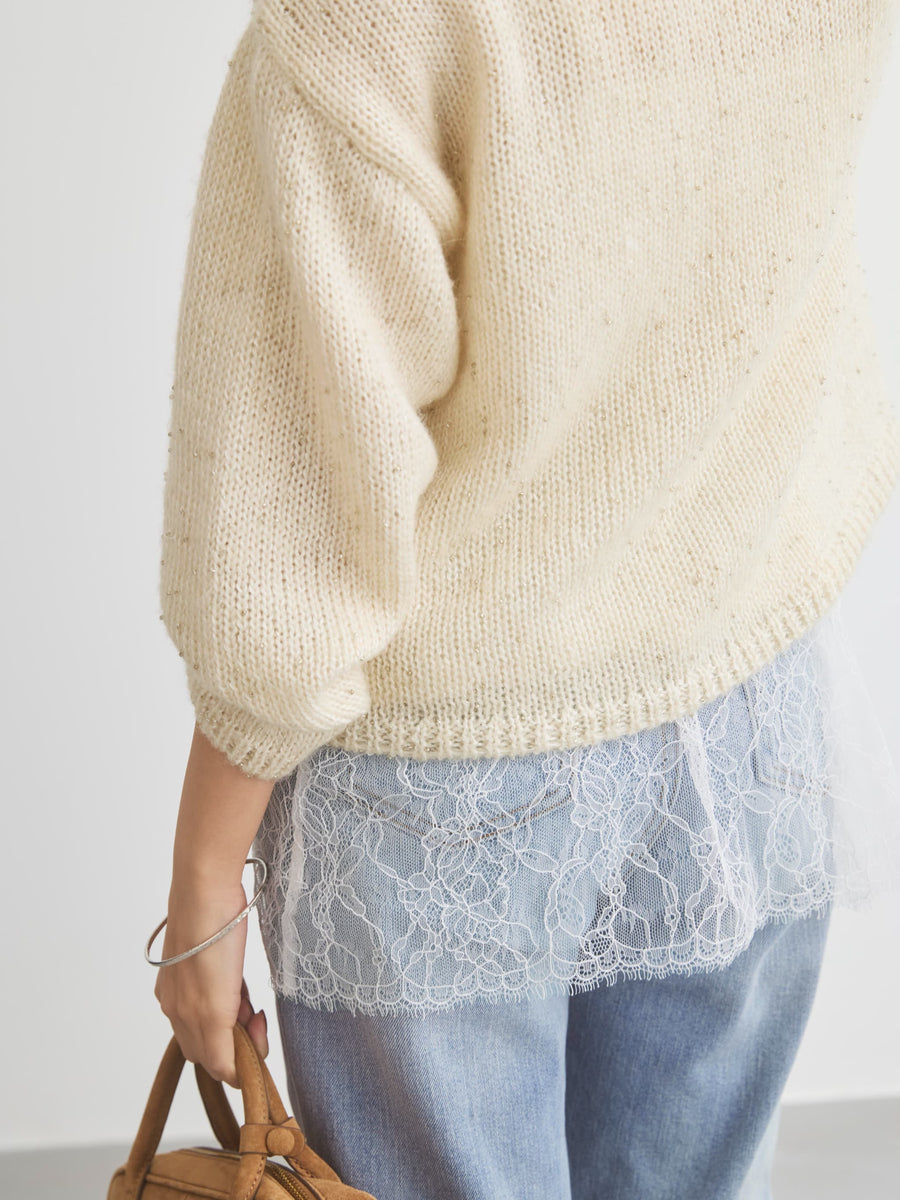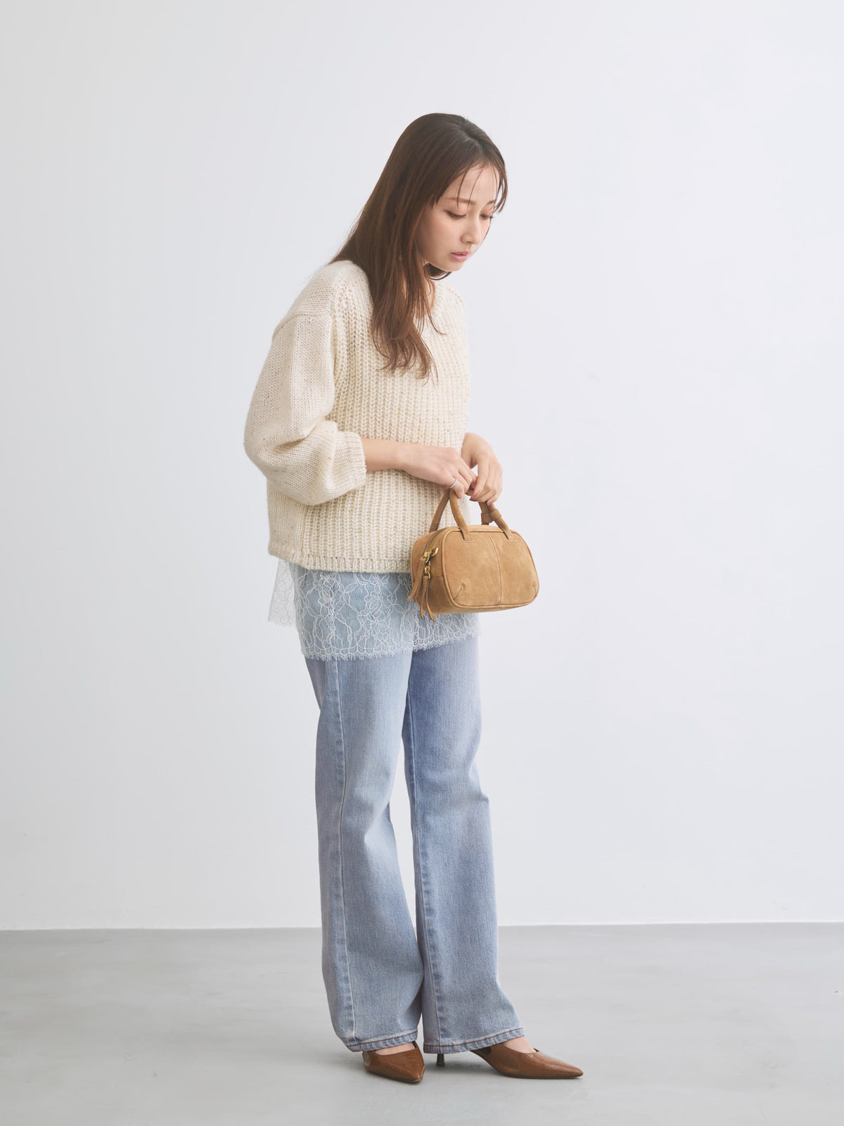 重ね着しても軽やかにまとまり、裾から覗くレースがぐっと女性らしい印象に。