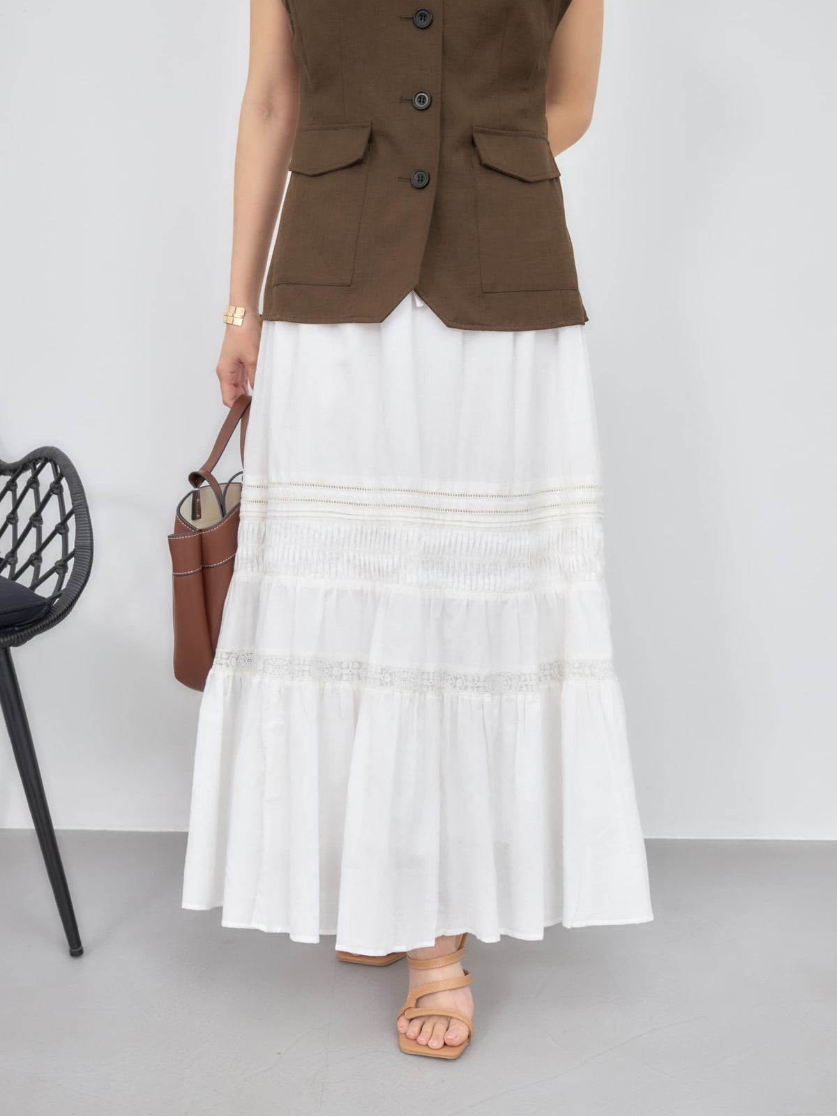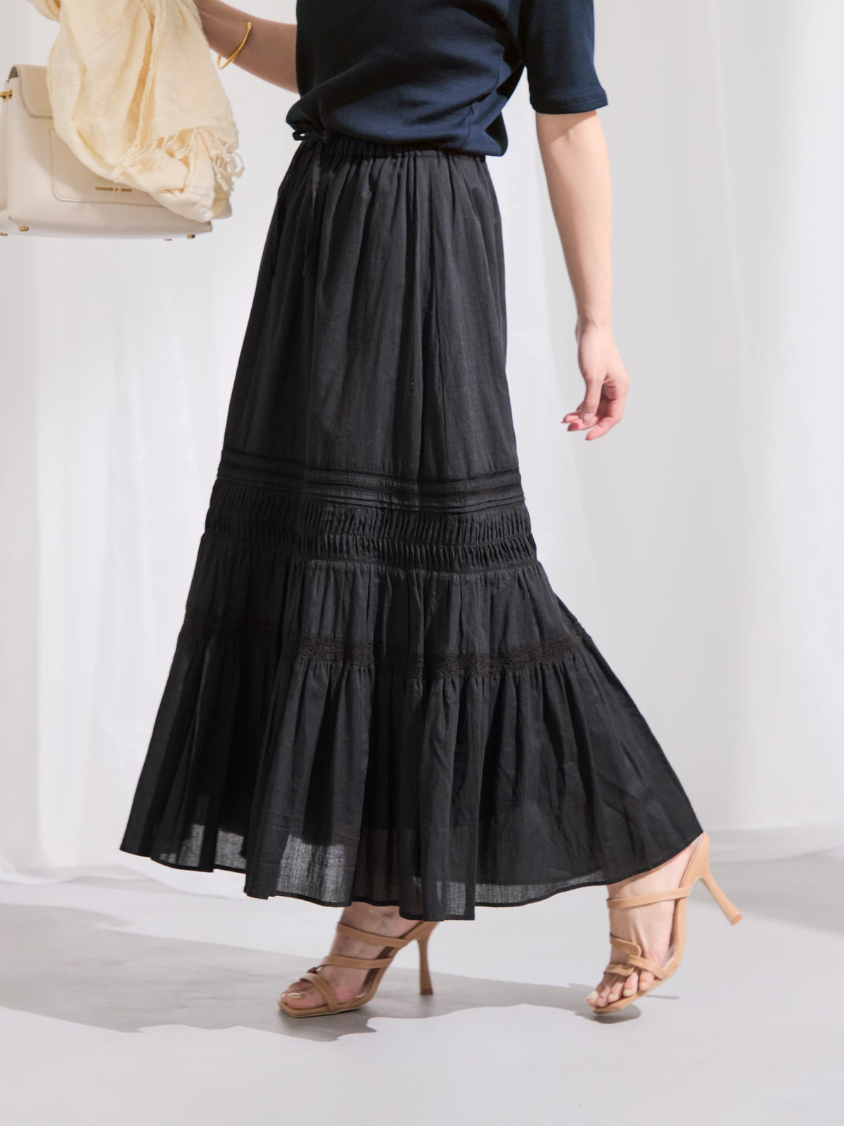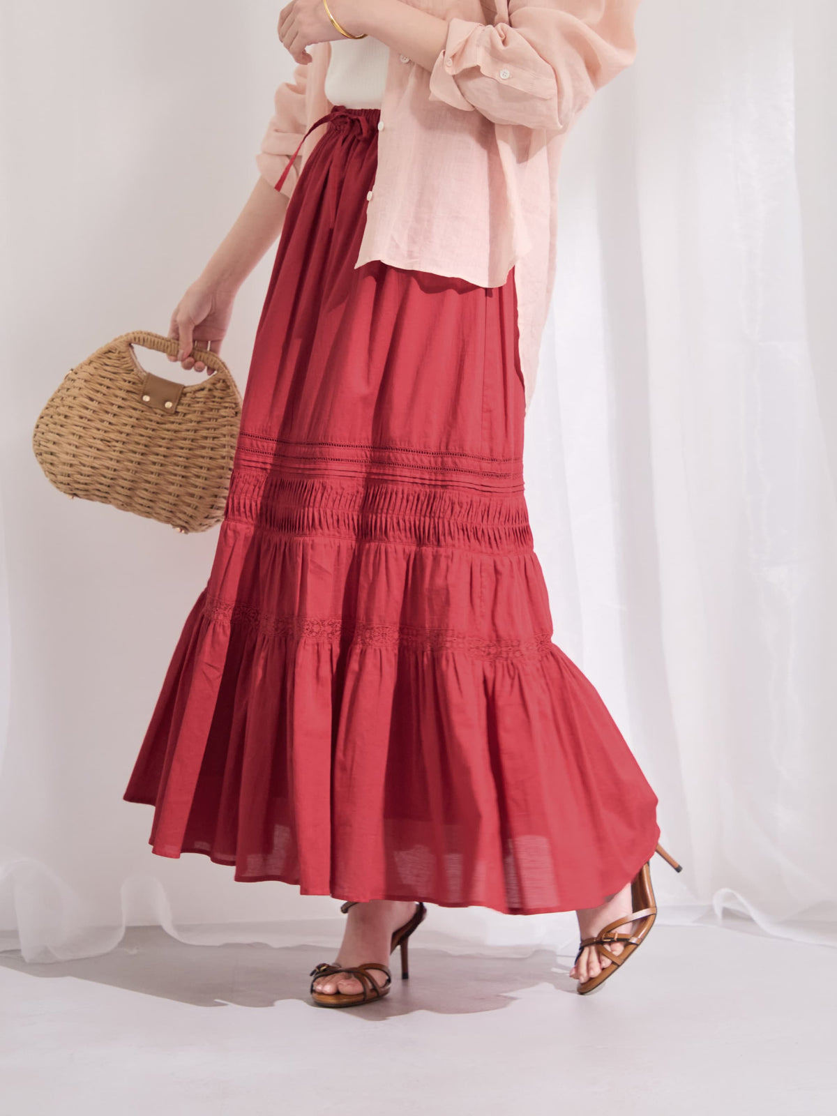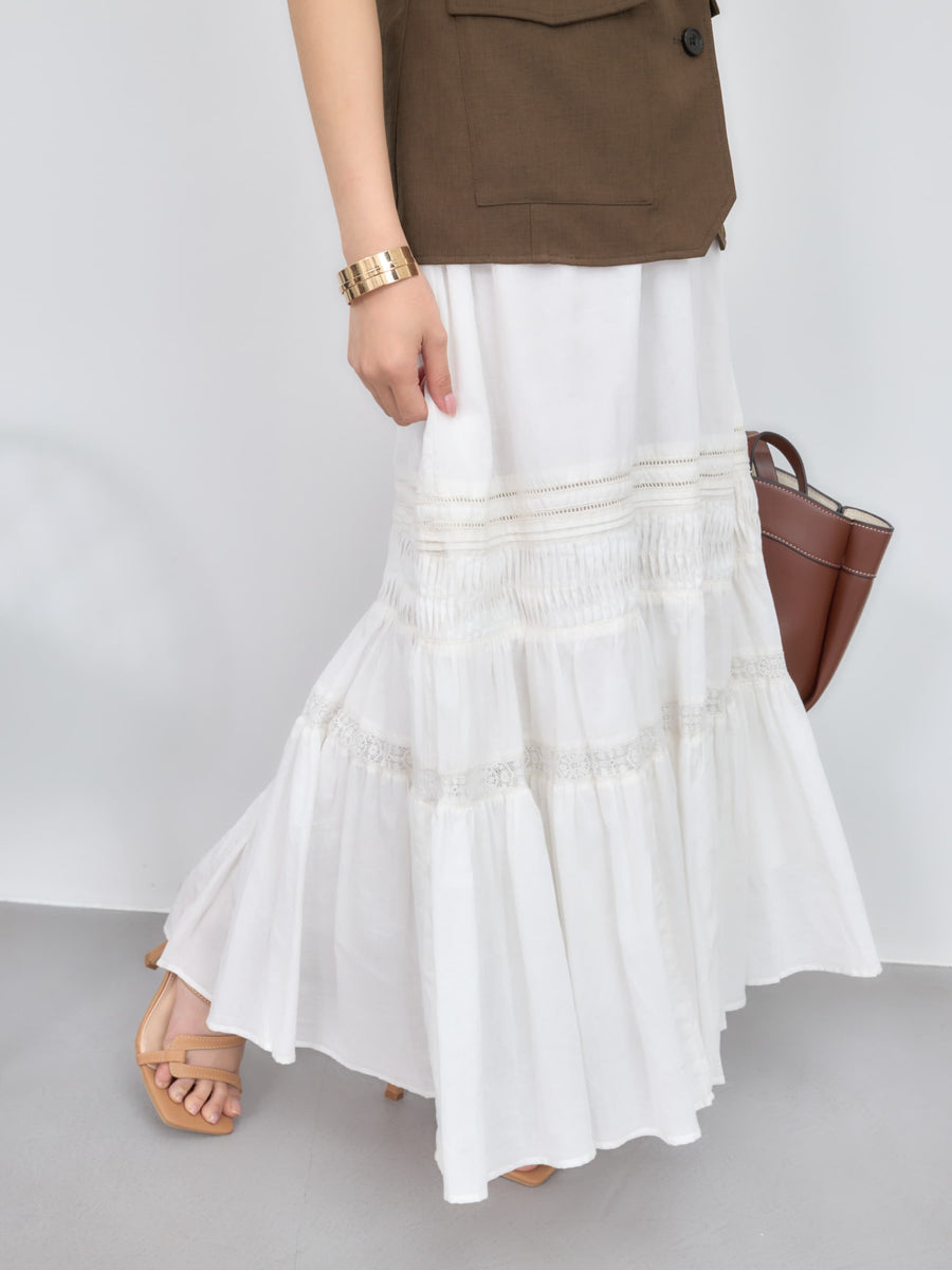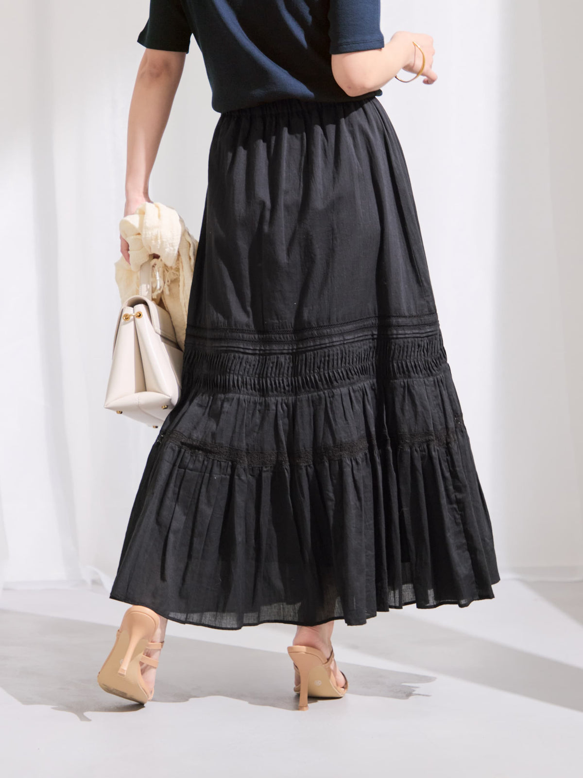 繊細なピンタックとレースディテールが目を惹く、クラフト感たっぷりのティアードスカート。ウエストまわりはすっきりと仕上げつつ、膝上からふんわりと広がるシルエットで、メリハリのある女性らしいバランスに。