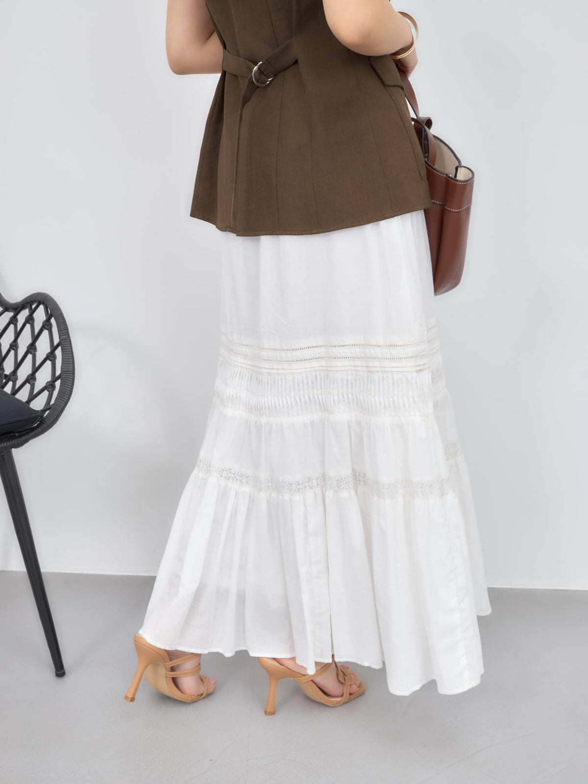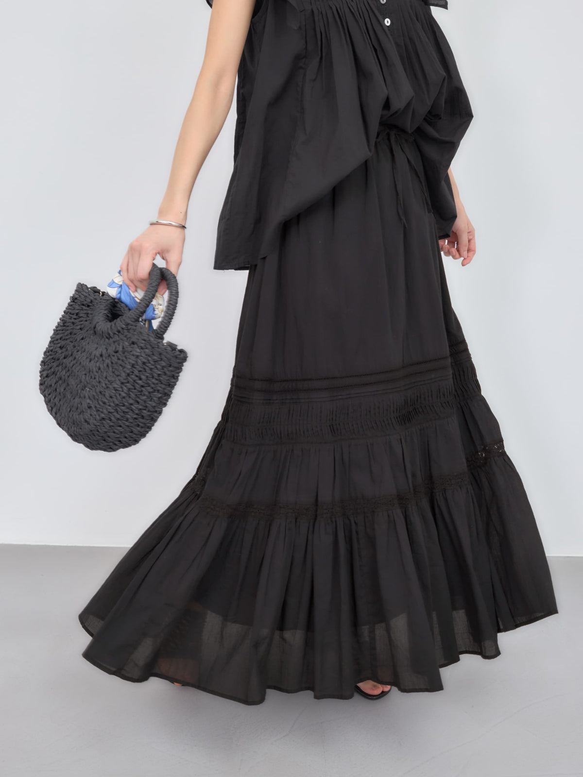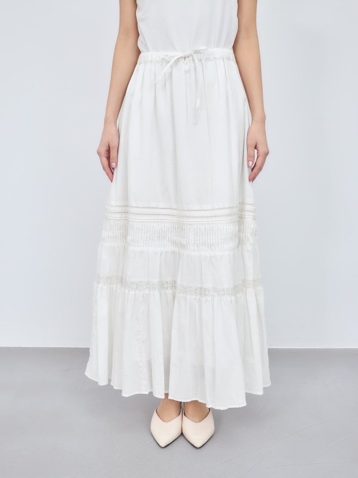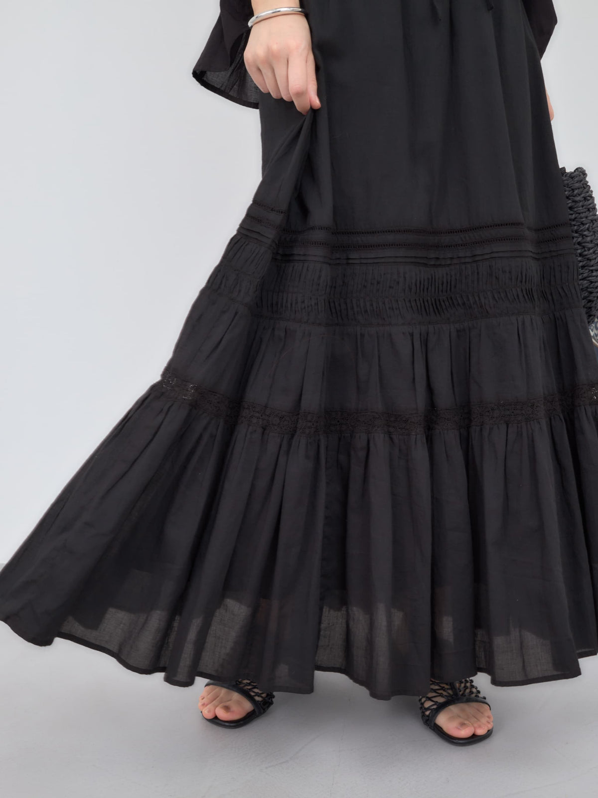 繊細なピンタックとレースディテールが目を惹く、クラフト感たっぷりのティアードスカート。ウエストまわりはすっきりと仕上げつつ、膝上からふんわりと広がるシルエットで、メリハリのある女性らしいバランスに。