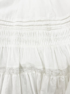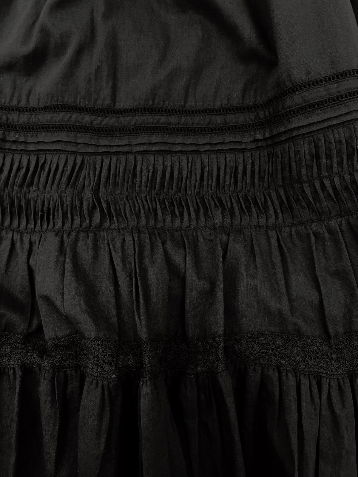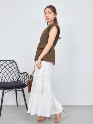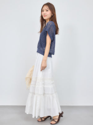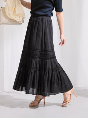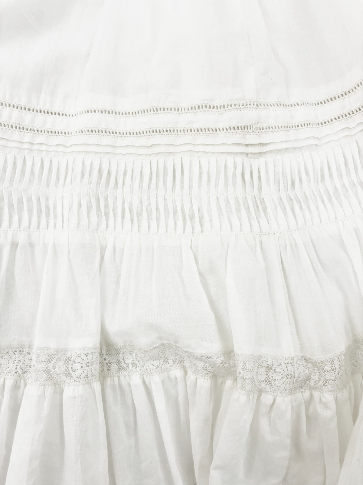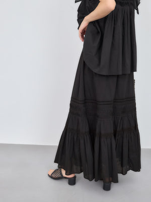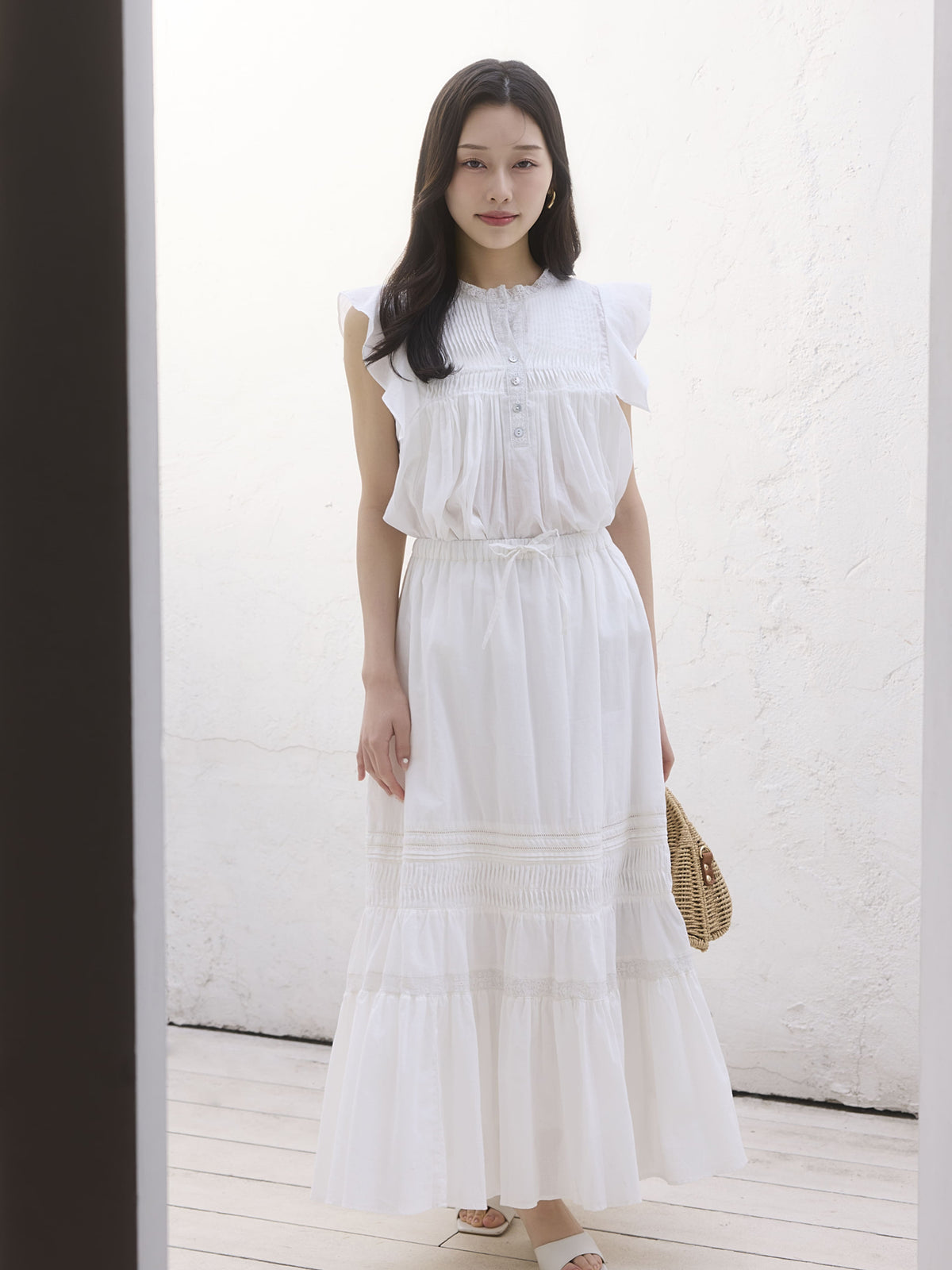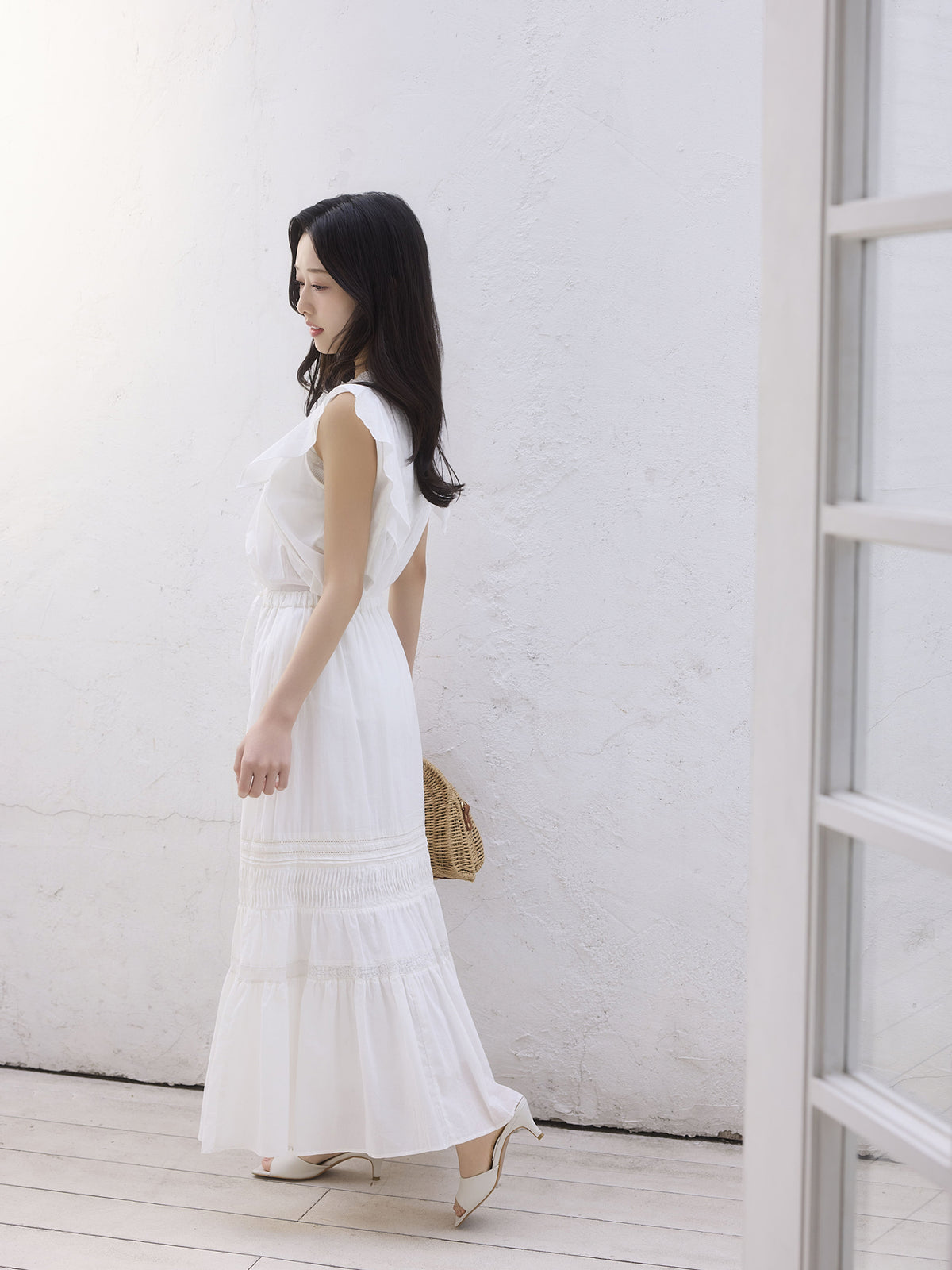 繊細なピンタックとレースディテールが目を惹く、クラフト感たっぷりのティアードスカート。ウエストまわりはすっきりと仕上げつつ、膝上からふんわりと広がるシルエットで、メリハリのある女性らしいバランスに。