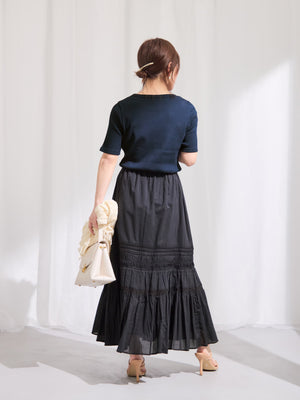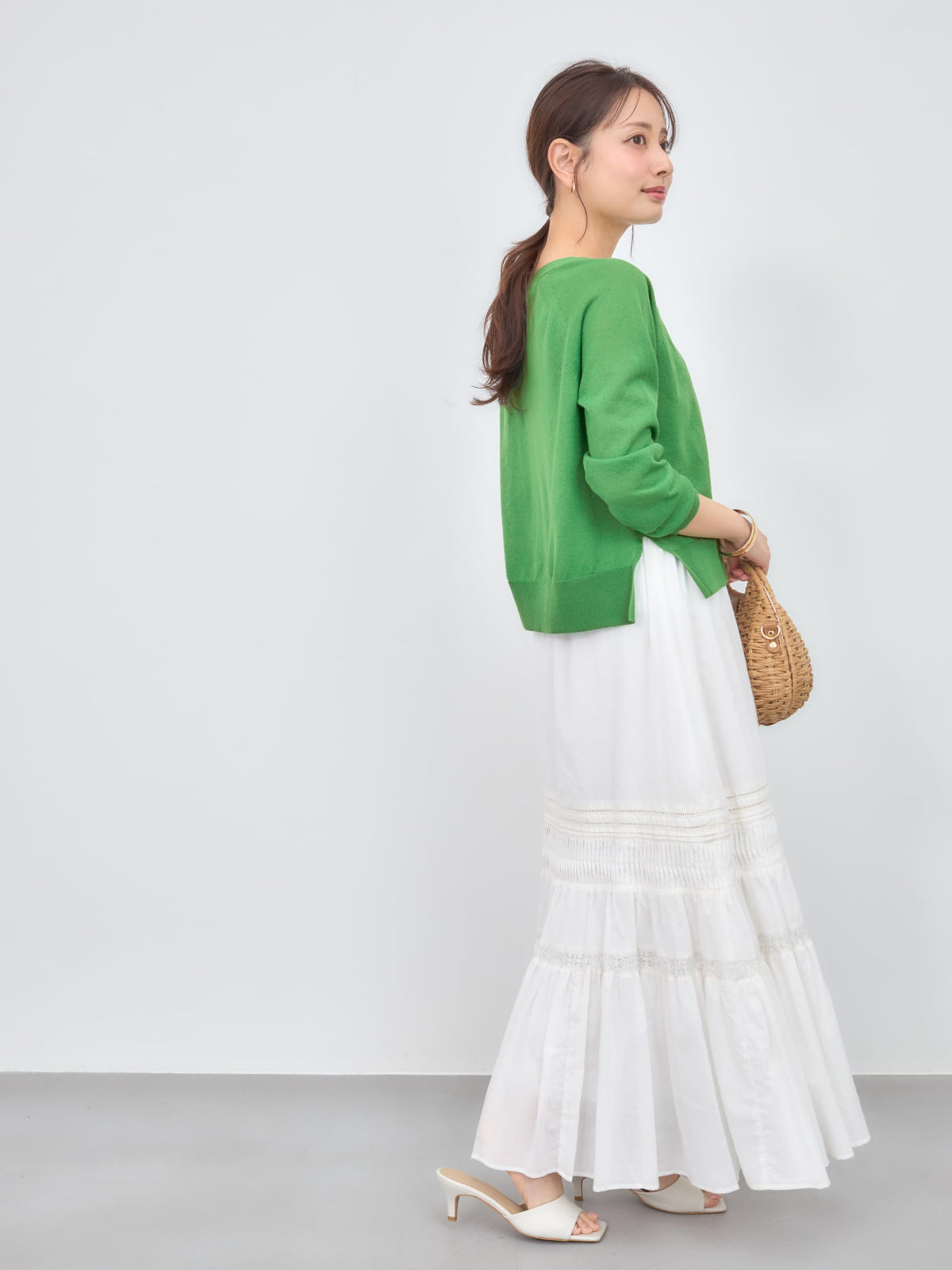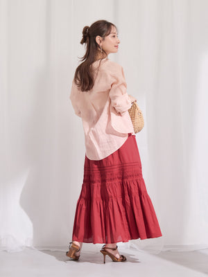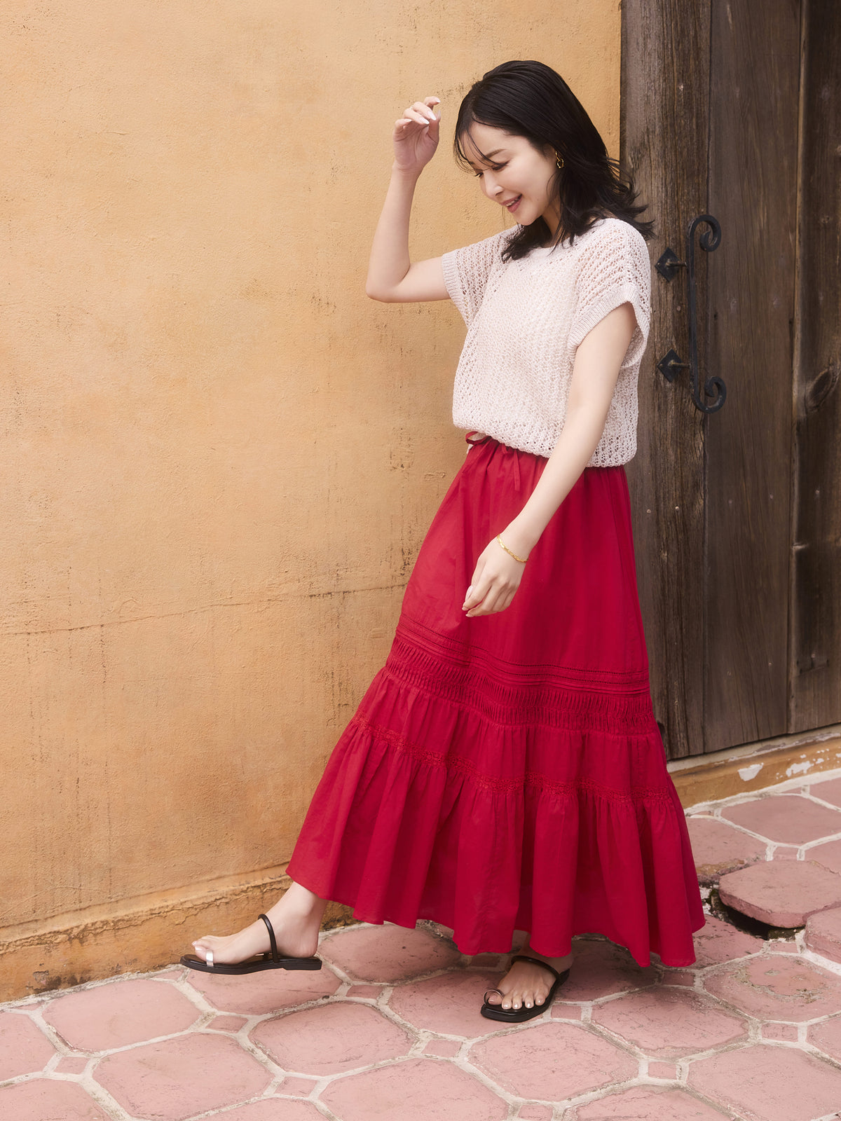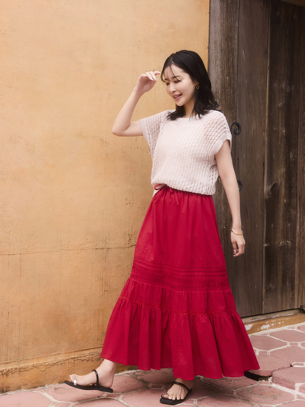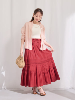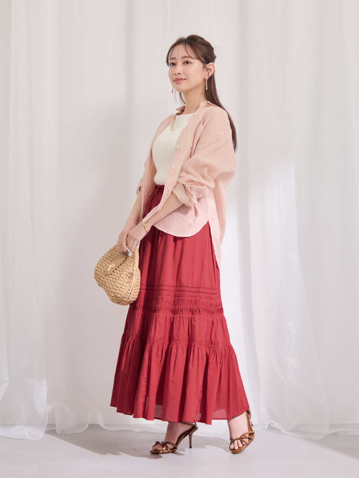 同素材の【Made in India】ピンタックエンブロイダリーブラウスと合わせたセットアップ風スタイルは、統一感がありおすすめ。シンプルなカットソーやコンパクトなニットを合わせて、スカートを主役にした着こなしも◎