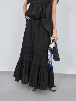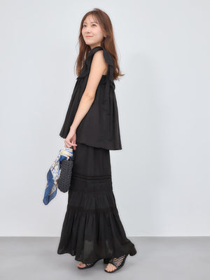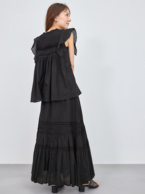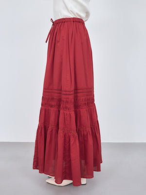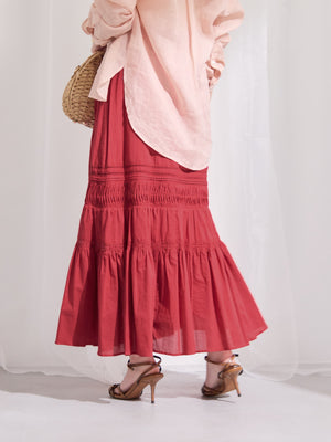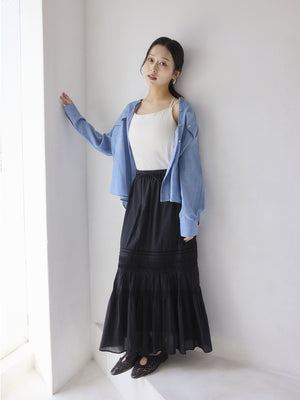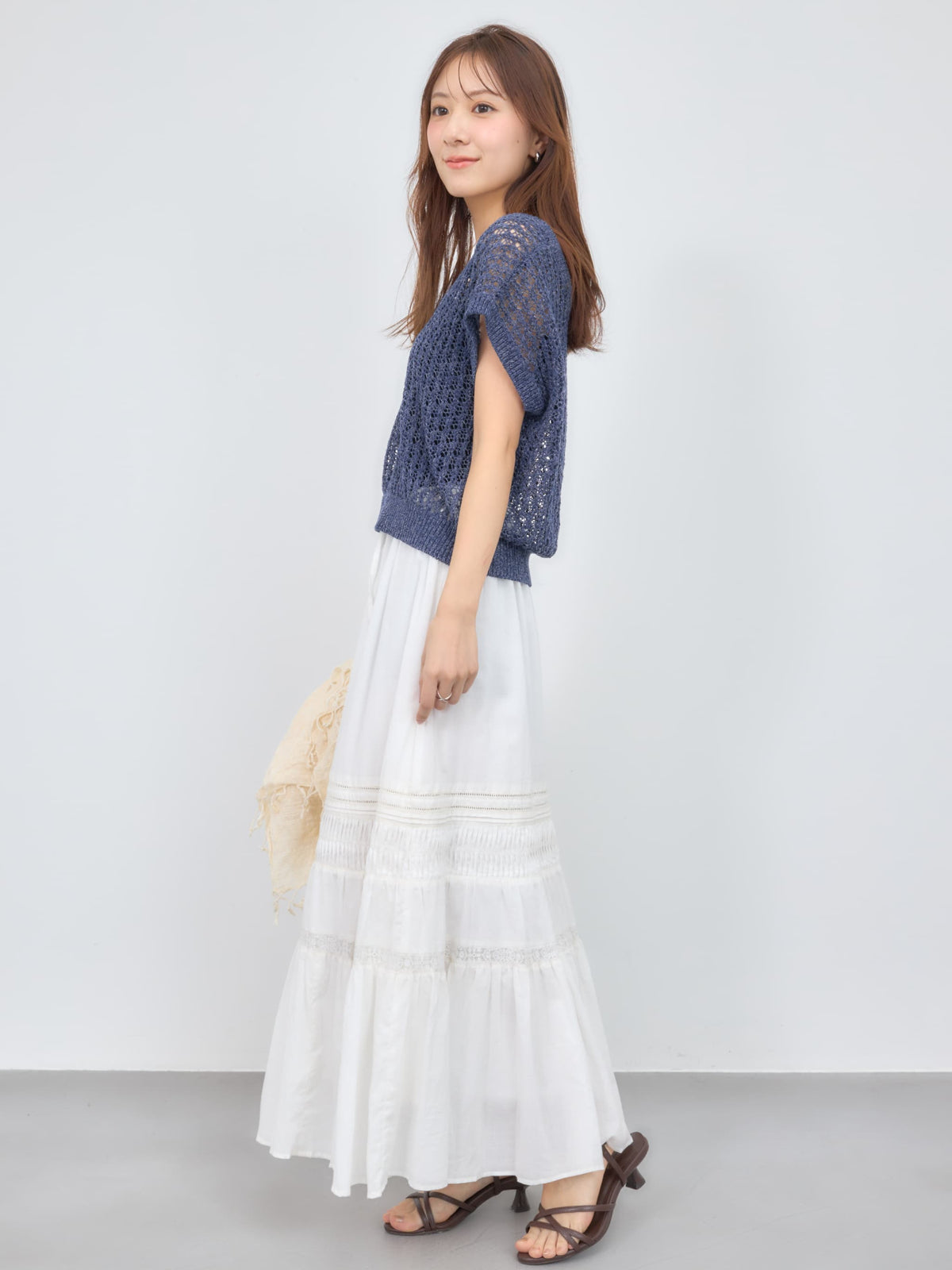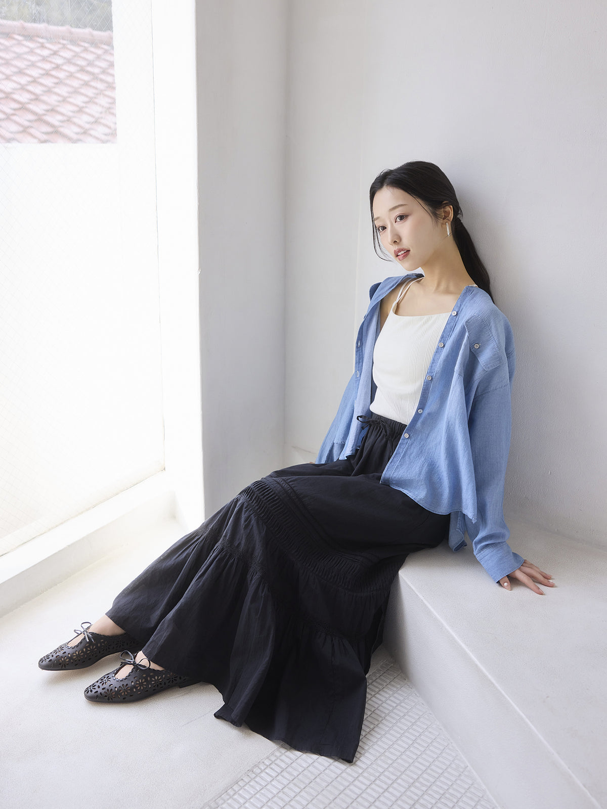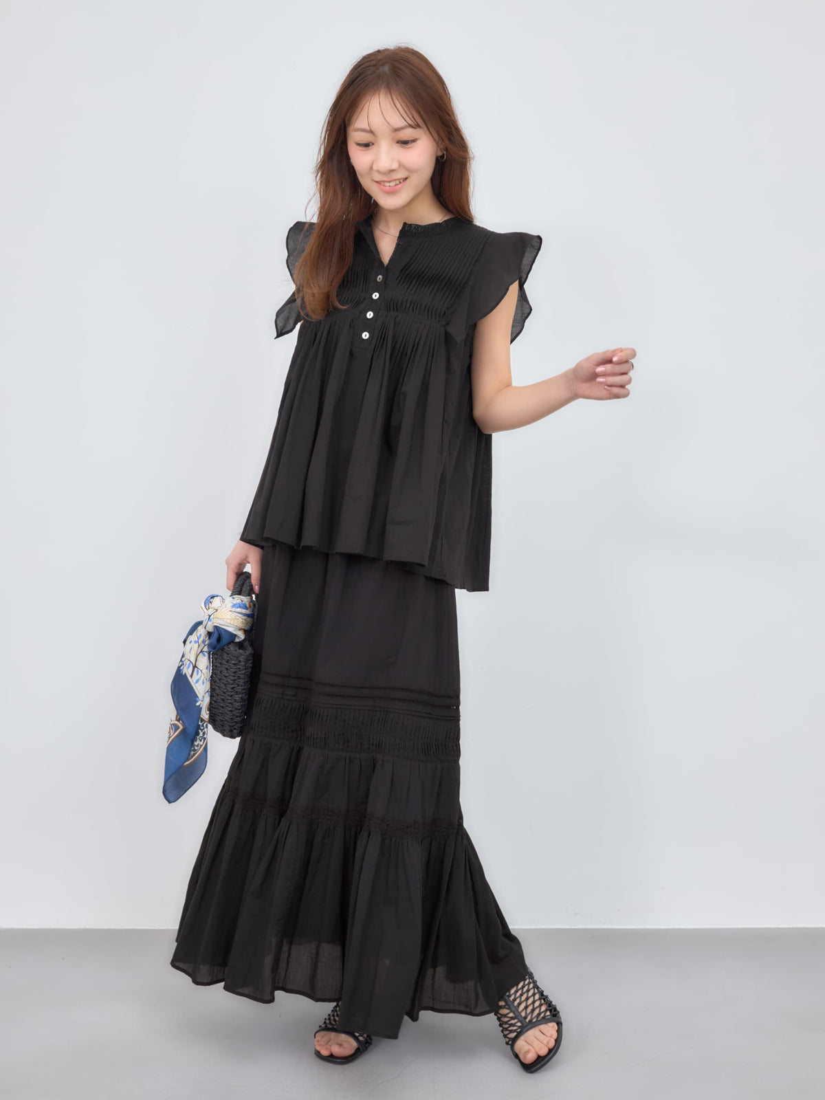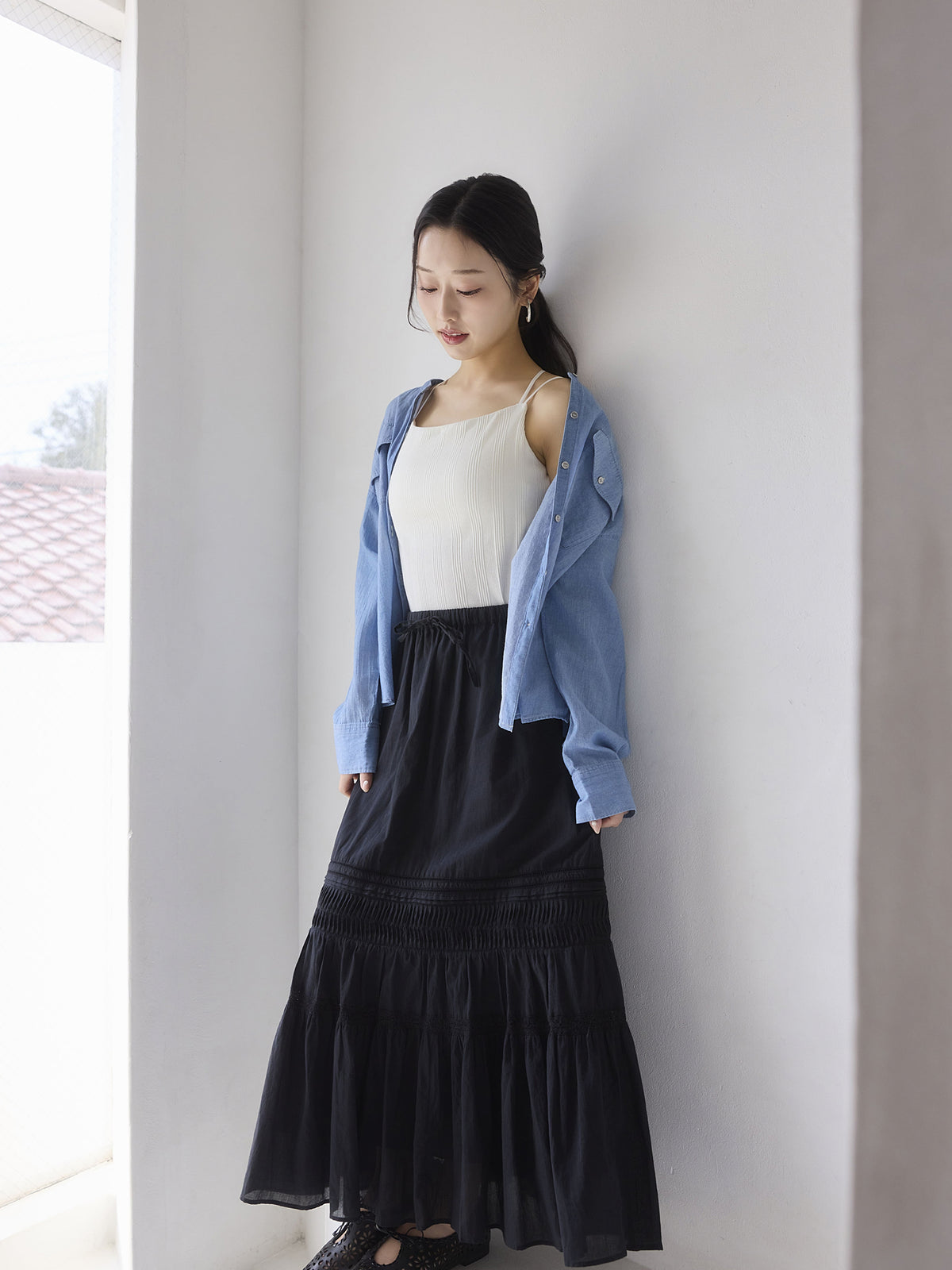 同素材の【Made in India】ピンタックエンブロイダリーブラウスと合わせたセットアップ風スタイルは、統一感がありおすすめ。シンプルなカットソーやコンパクトなニットを合わせて、スカートを主役にした着こなしも◎