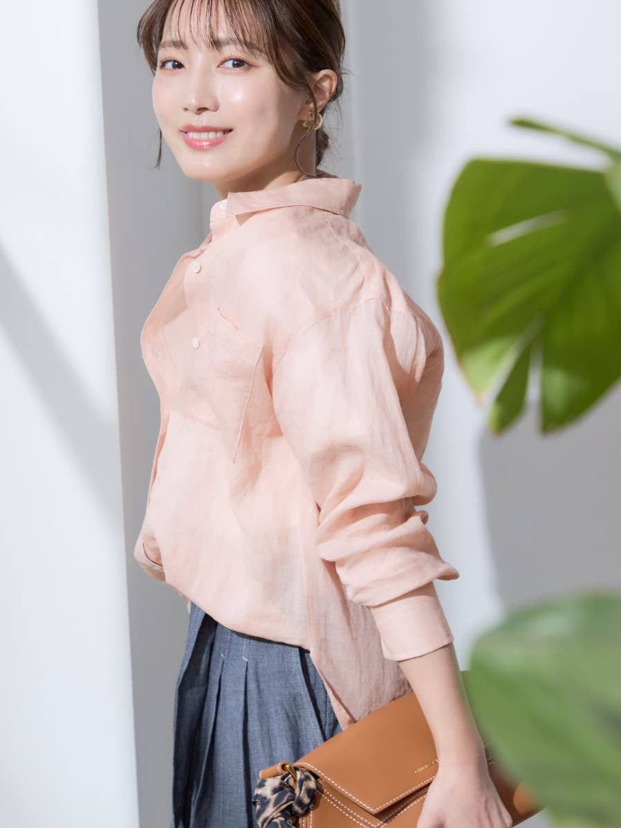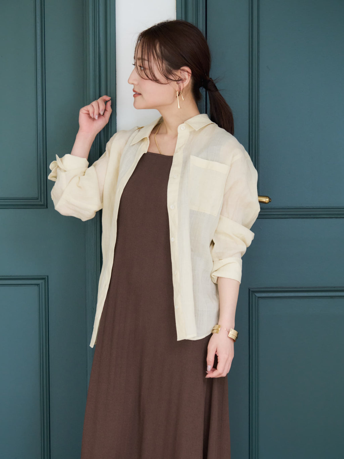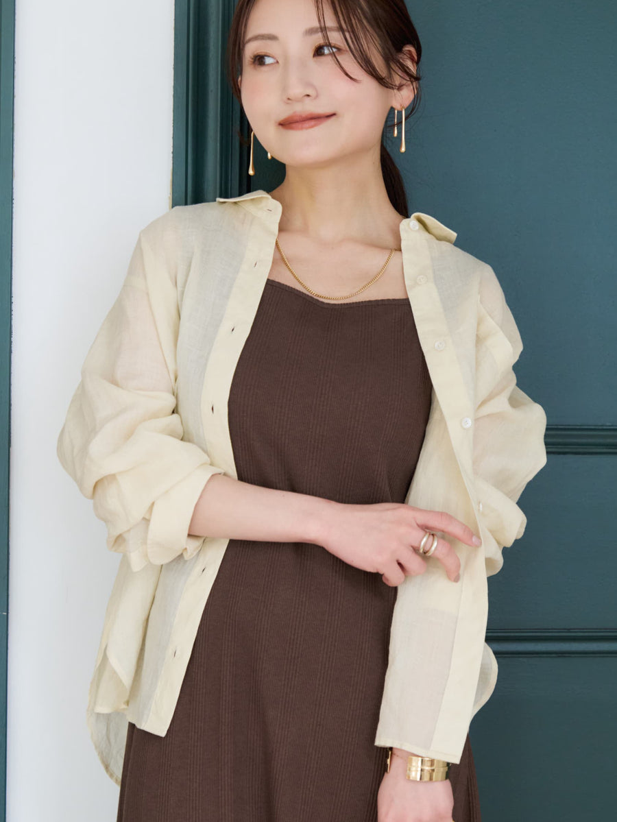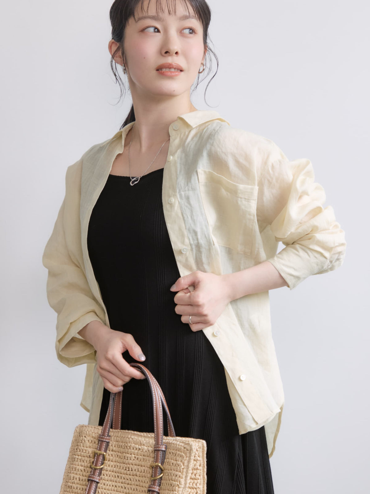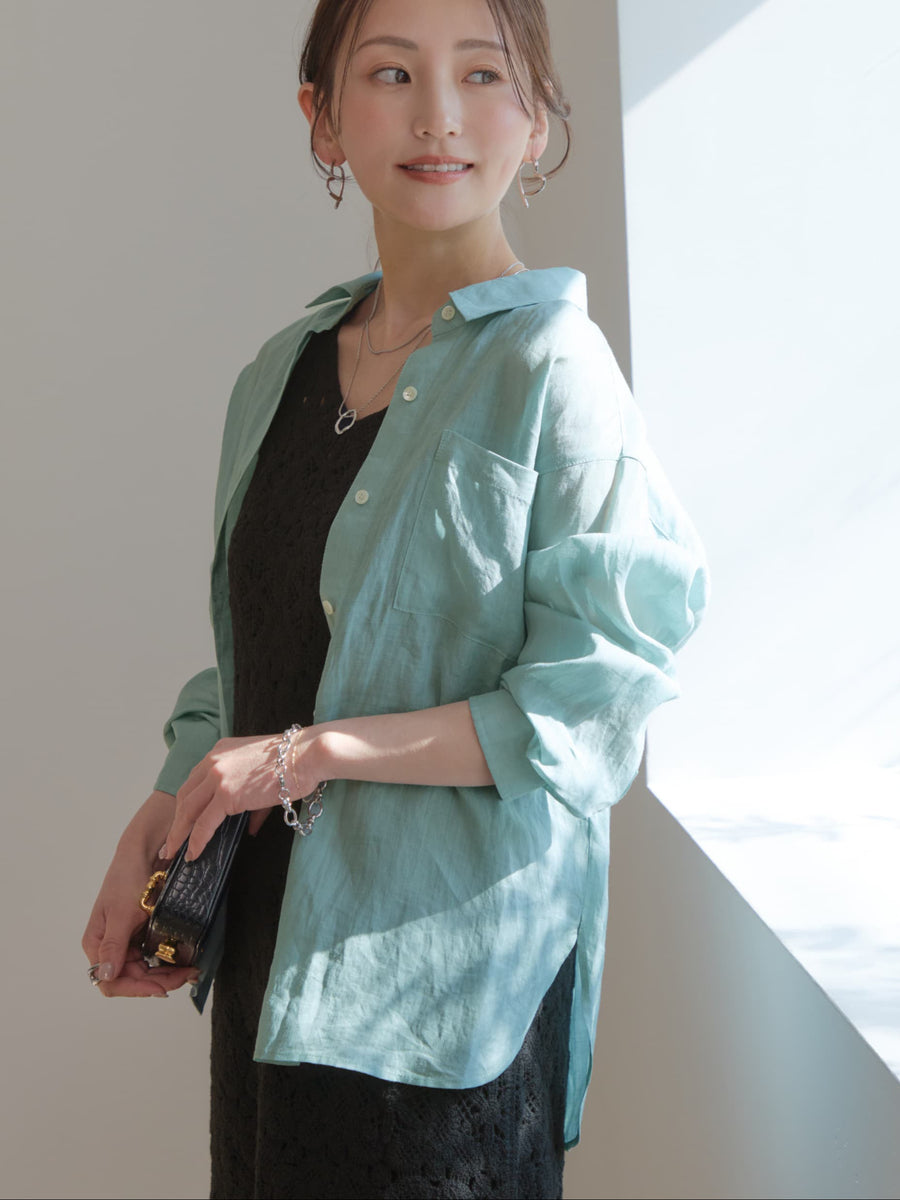 涼しげなラミー素材で、軽やかに着られます。色展開も初夏らしく爽やかでワンポイントとしてもおすすめ。程よいゆとりがあり、着丈はお尻が隠れるくらいなのでバランスよく着られ、ボトムを選ばず取り入れやすい1枚。前を閉じても羽織りでも使えるので着回し力も抜群です◎