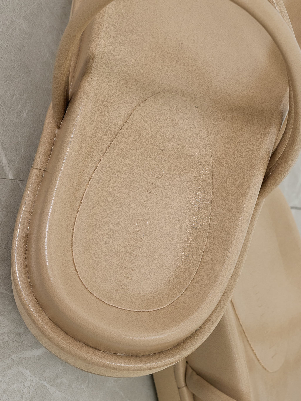 ツヤがですぎず、マットすぎない合成皮革素材でテイストを問わず合わせやすい質感です。返りのいいソールで歩きやすく斜めに走るストラップが足をホールドしながら足元をすっきりと見せてくれます。