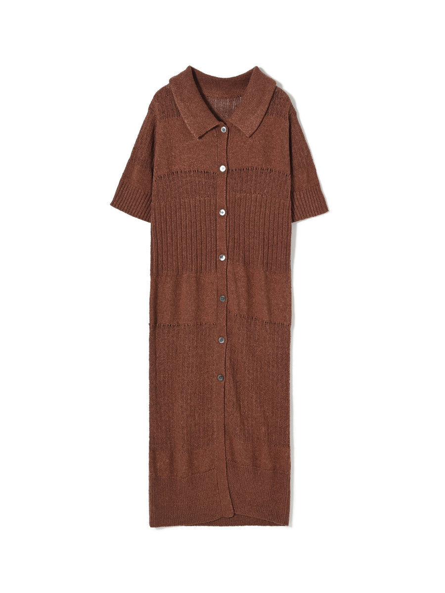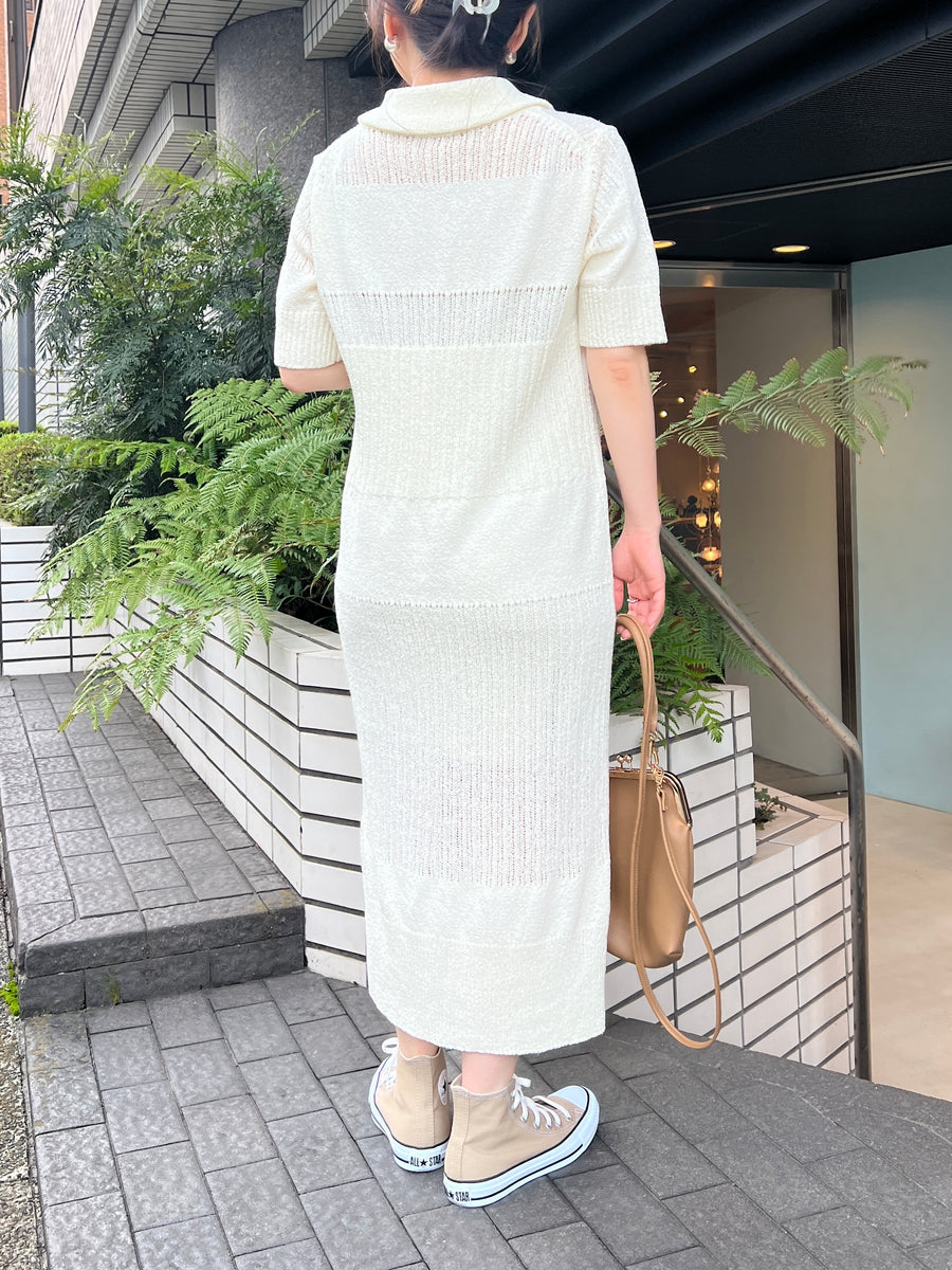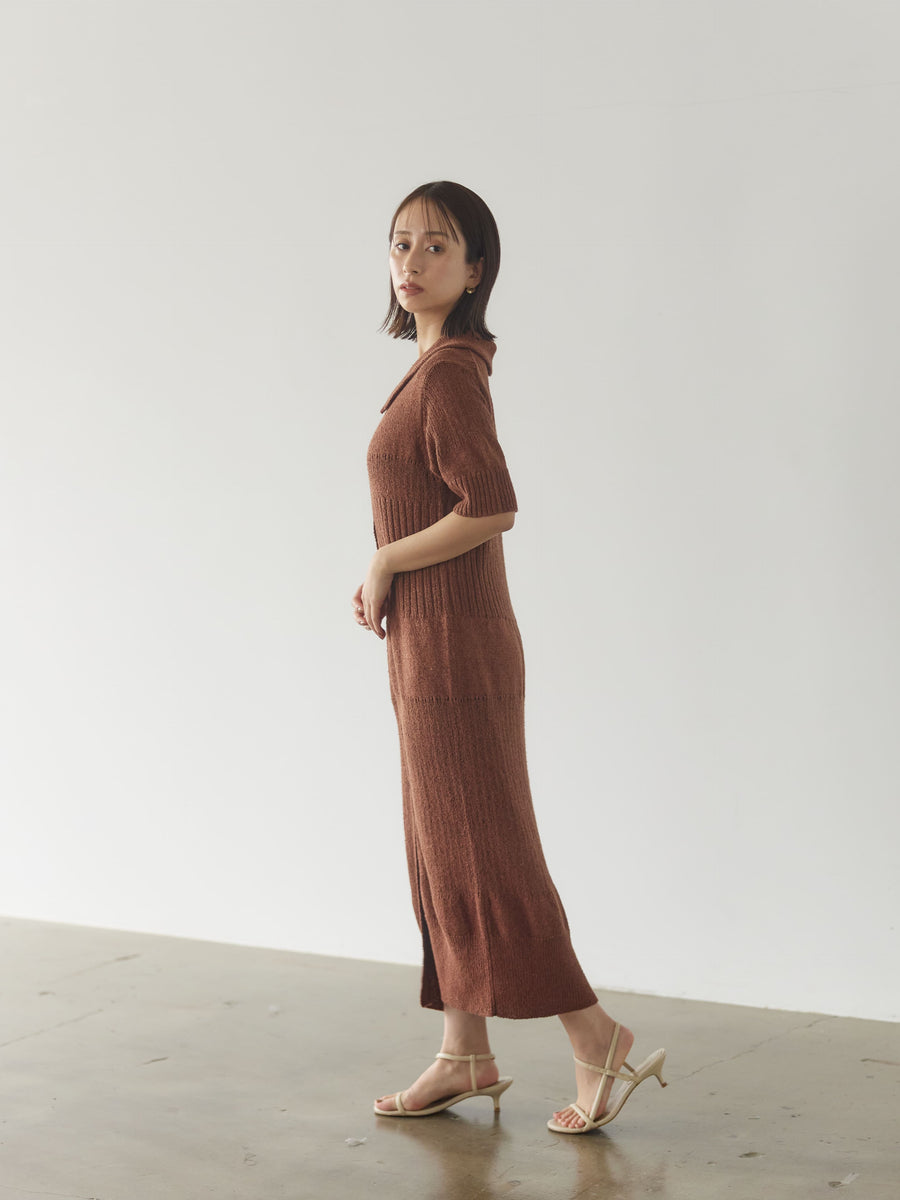 糸そのものに凹凸感があるコットン混の糸を使用し、編み地に変化をつけて編み上げたニットポロのワンピース。