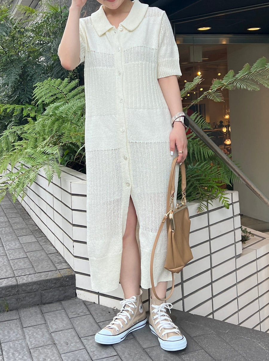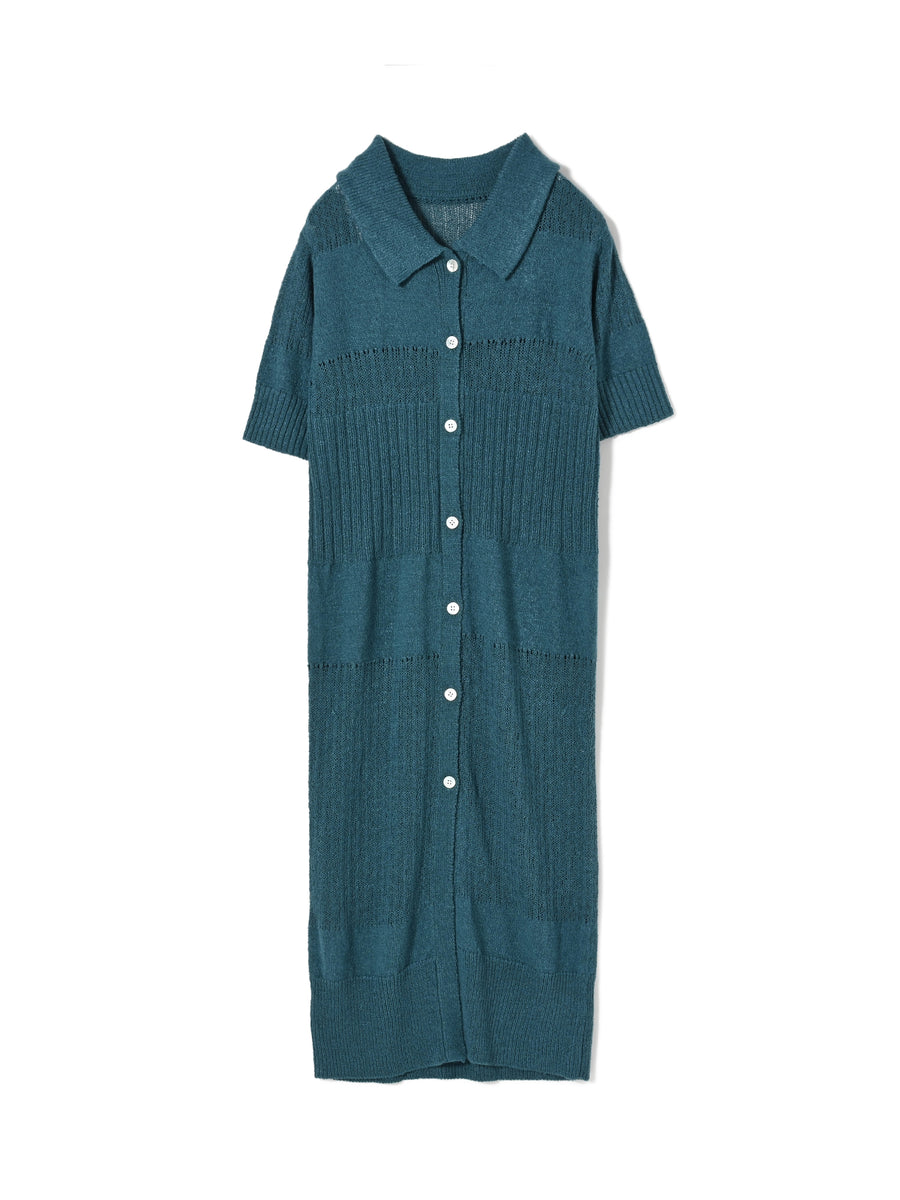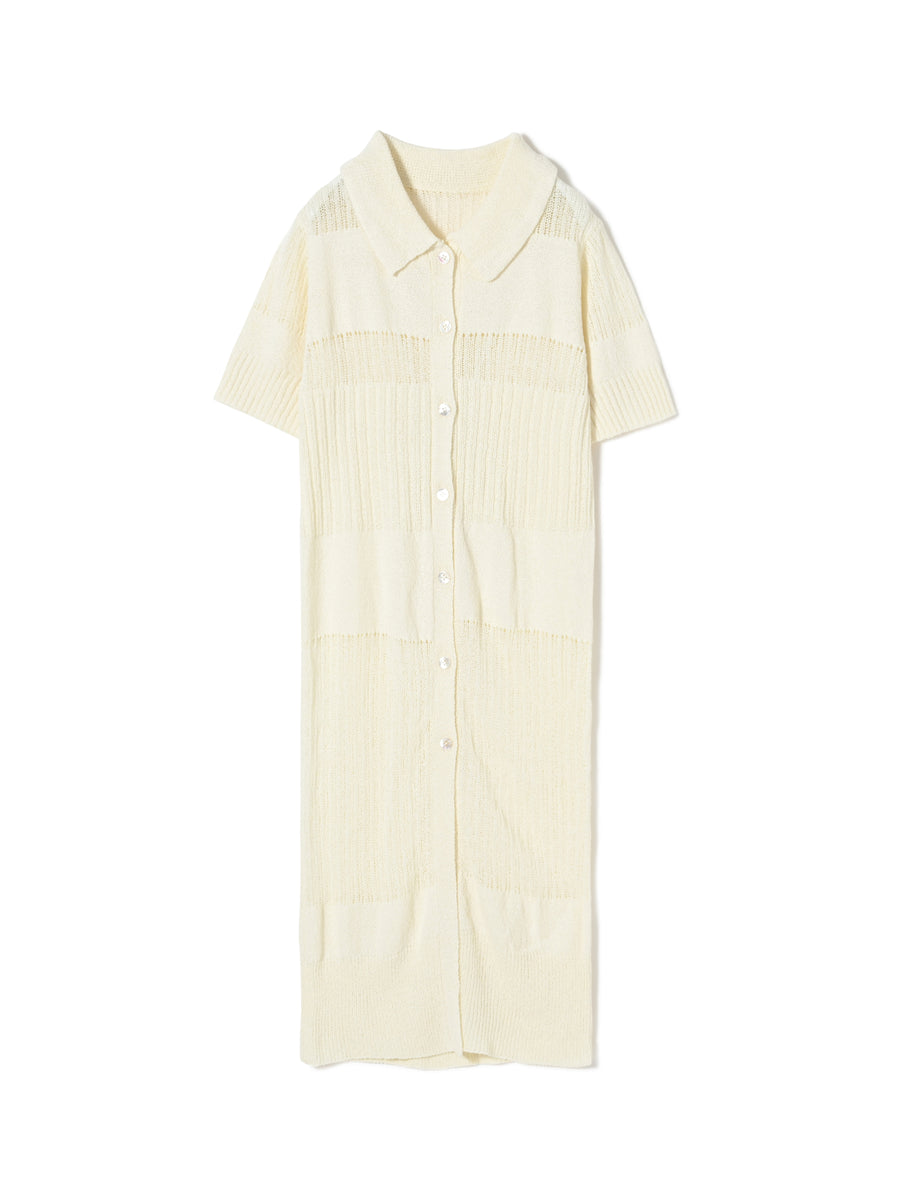 ざっくりと編み上げるメッシュ状の編み地とリブ組織などをミックスし、ゆとり感のある五部袖とその透け感やフロントでキラッと光るシェルボタンでも涼やかさをプラス、一枚で羽織としても優秀なワンピースに仕上げています。