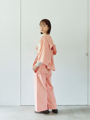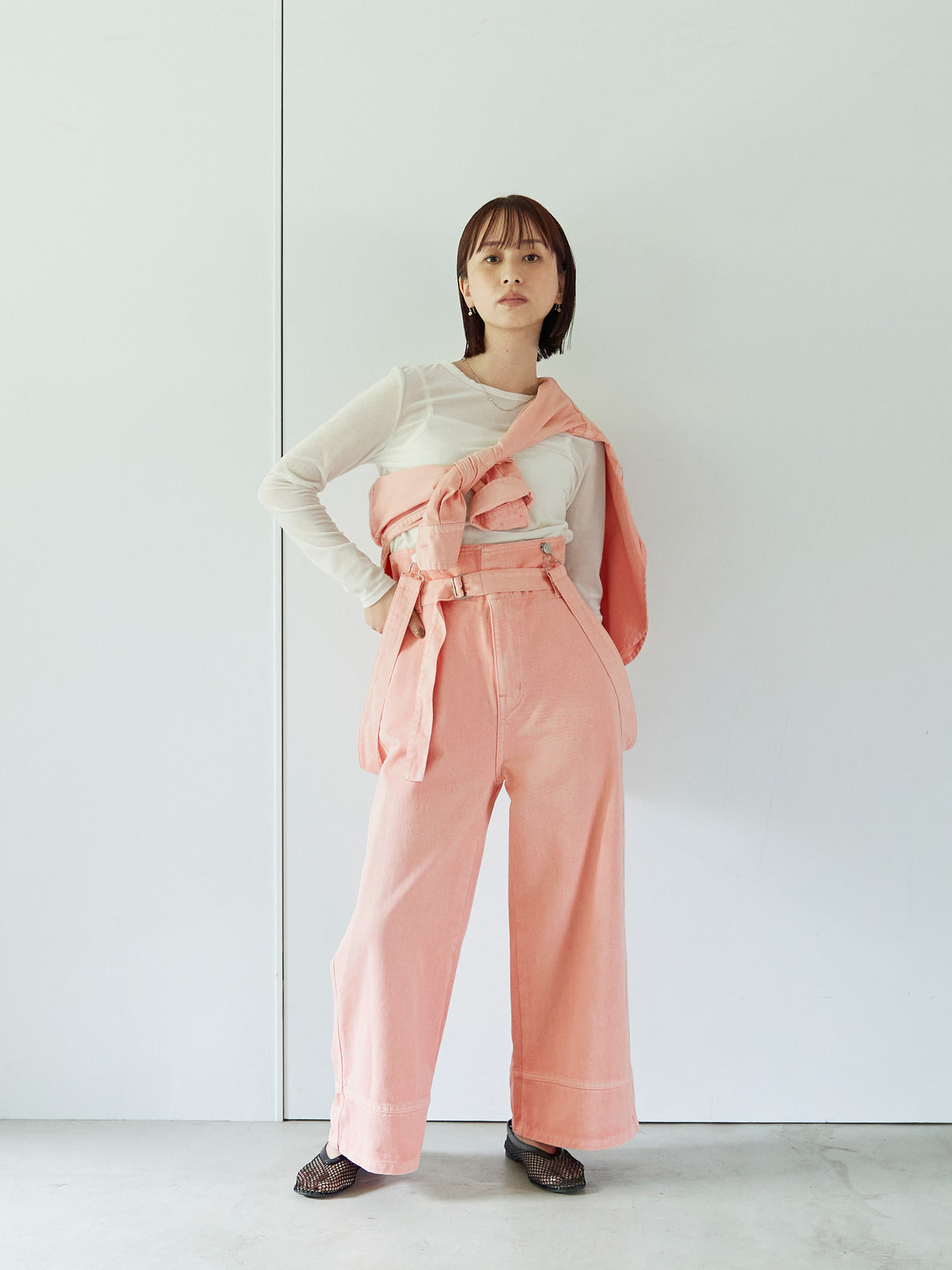 サロペットパンツとしてゆったりと着用したり、肩紐を取ってウエストのベルトをぎゅっと絞めればワイドパンツとしても着用可能です。