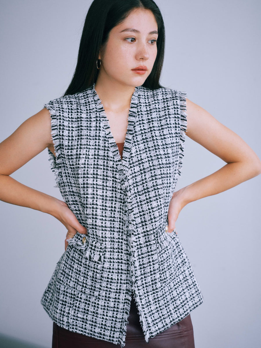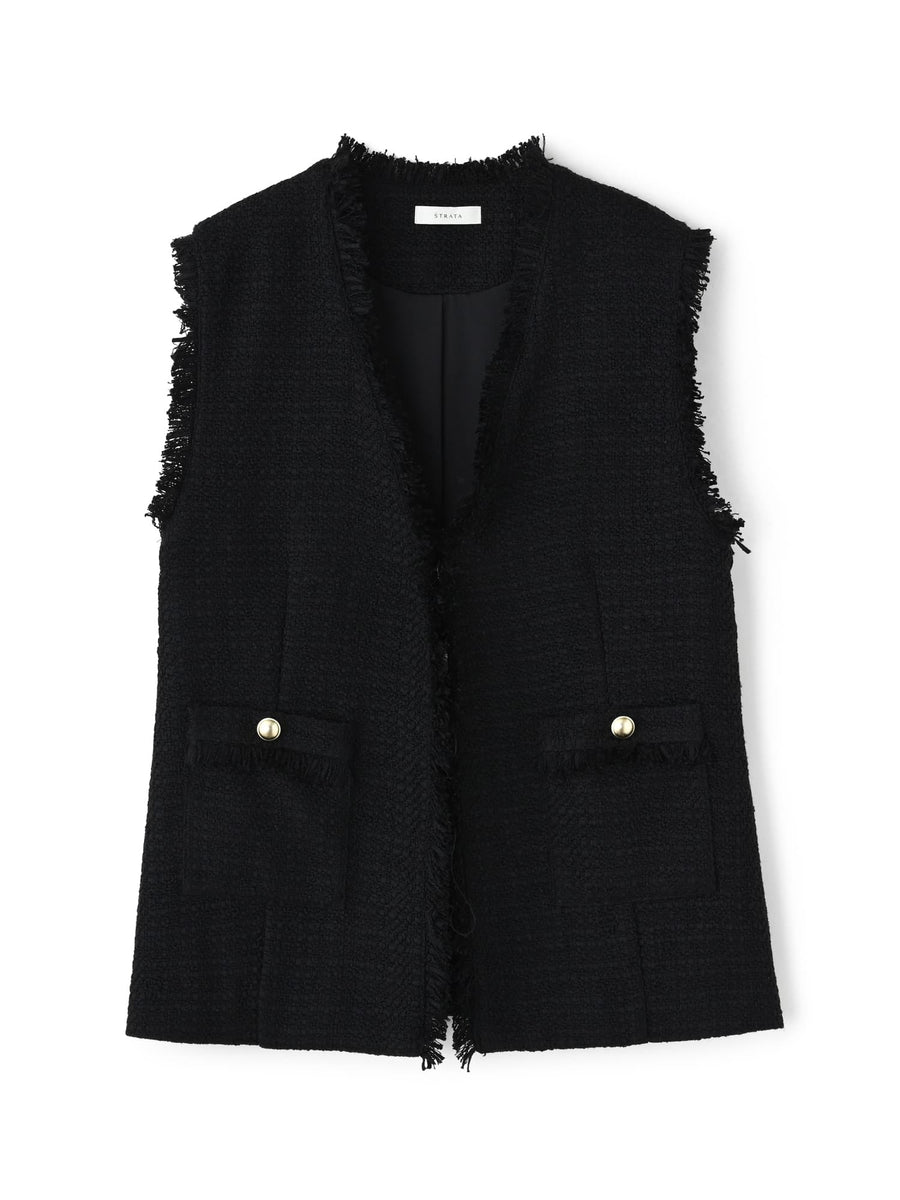 【上品なゴールドボタン×フリンジが魅力のツイードベスト】