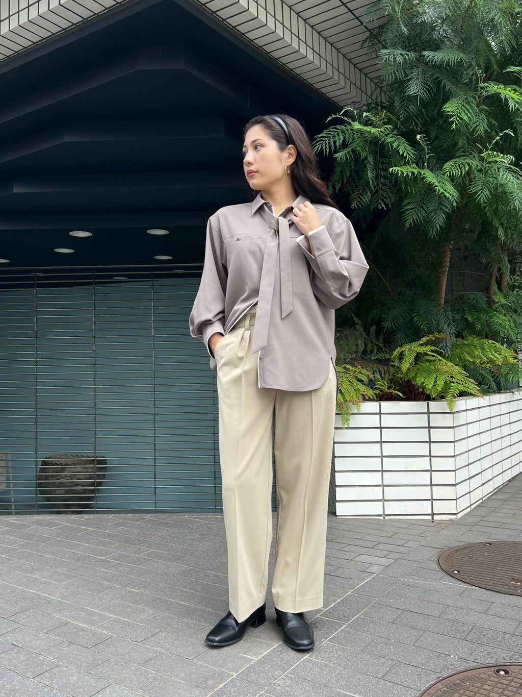 ・タイのアレンジ次第でマニッシュからフェミニンな雰囲気まで楽しめる1枚