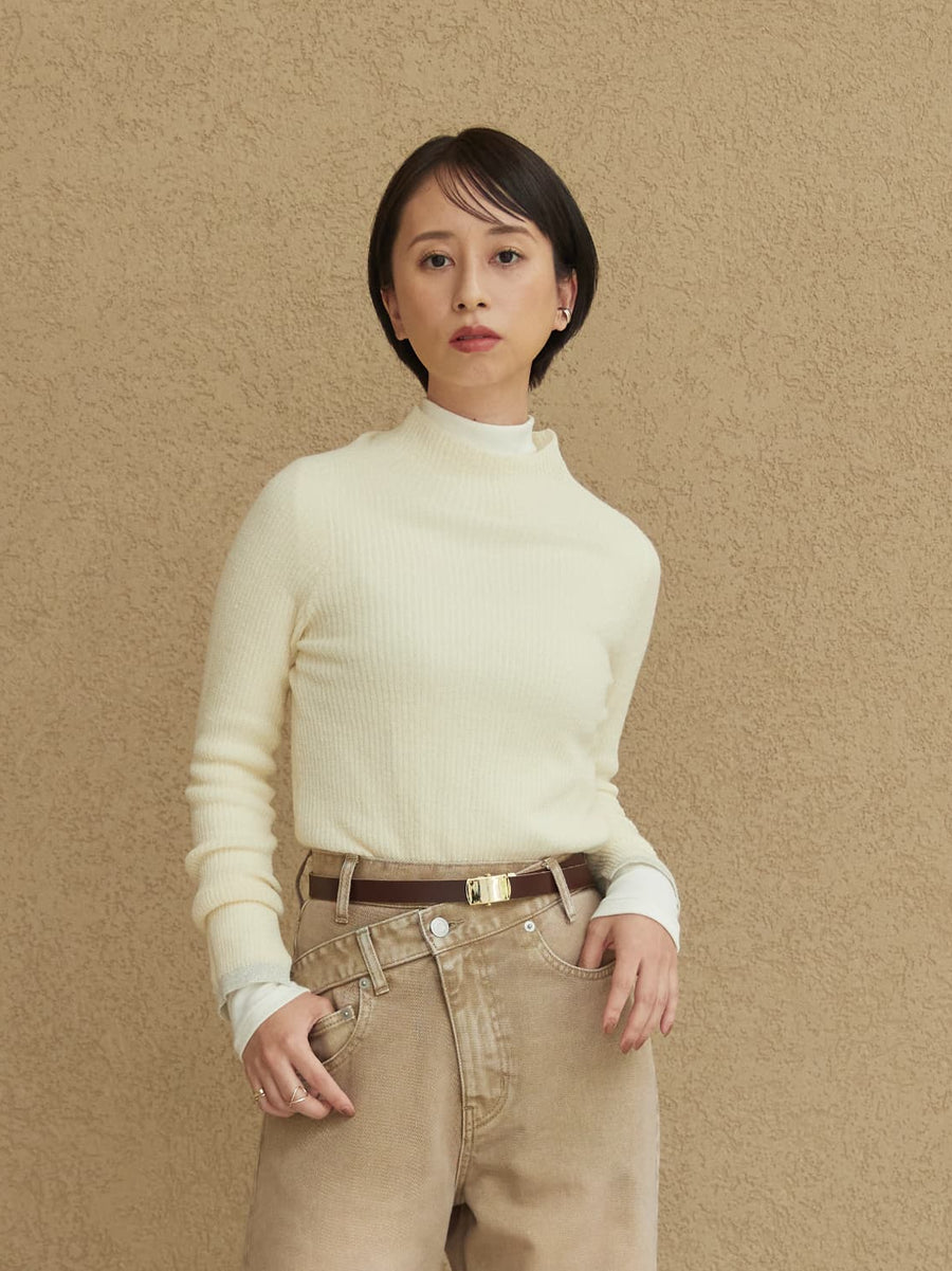 148cmでは骨盤にかかる丈感で、ボトムスインしてもアウトで着てもちょうどいい長さです。ハイネックは首の半分くらいの高さで小柄さんでも詰まることなく、かつ十分に暖かさを保ってくれます。薄手ながらウール混の素材で肌触りも柔らかく、インナーとしても1枚着としても幅広く活躍します。