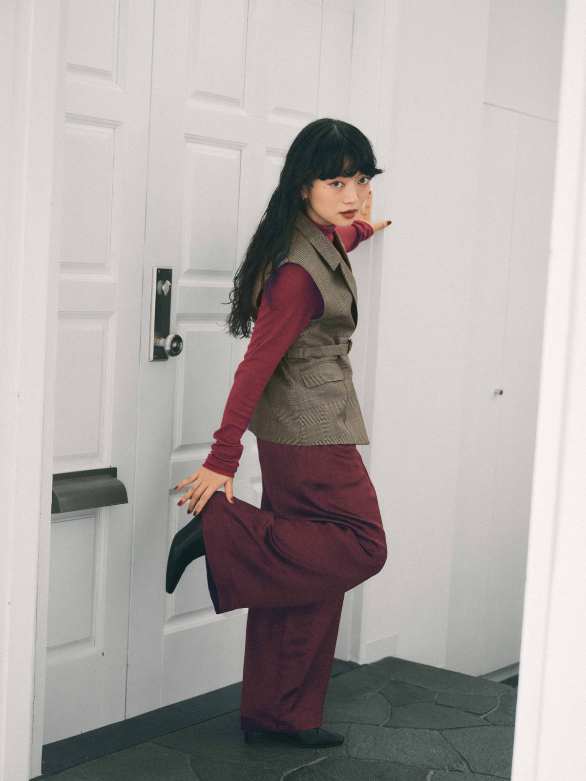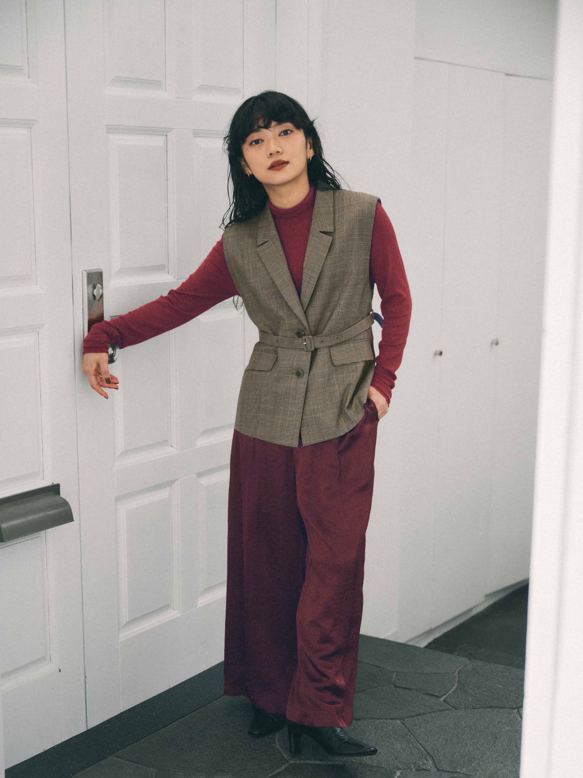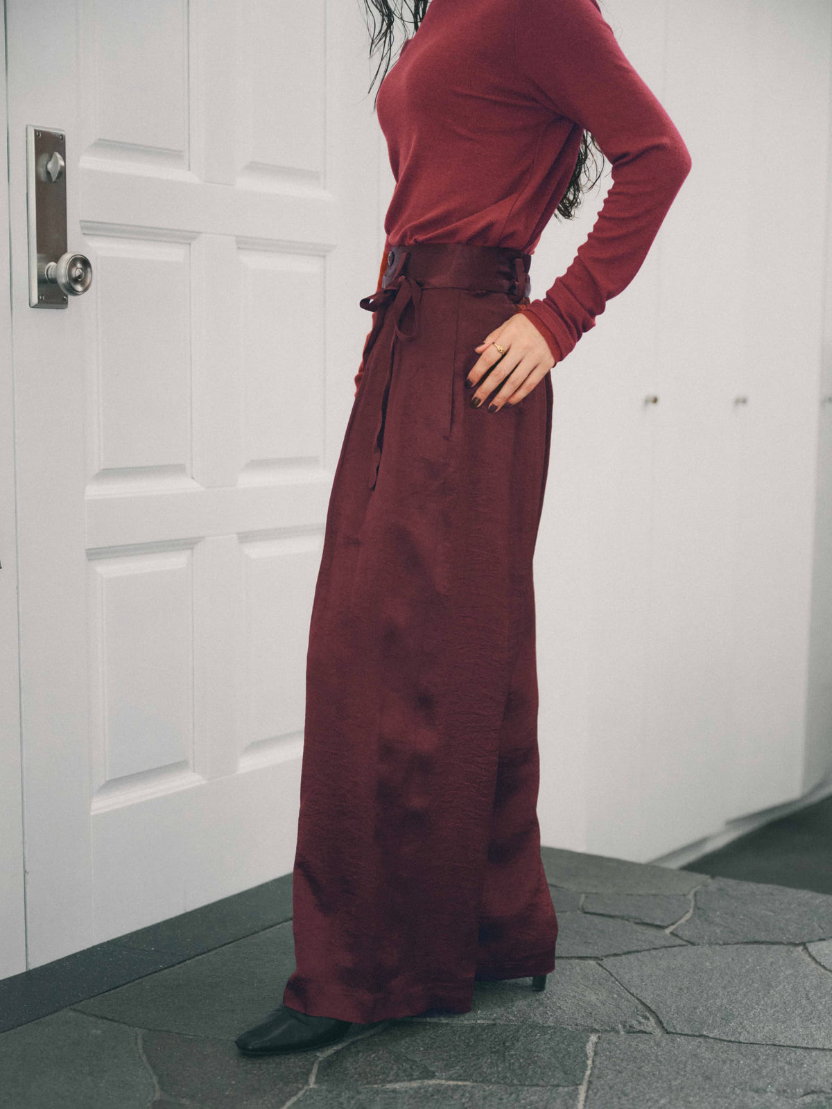 上品な光沢感と落ち感がリラクシーな雰囲気をプラスしつつ、ハイウエスト仕様で共布リボンが付いているのでしっかりとウエストマークもでき、スタイルアップも叶います。ベルトループは太さが2段階あるのでお手持ちのベルトと合わせることもできるのもポイントです。