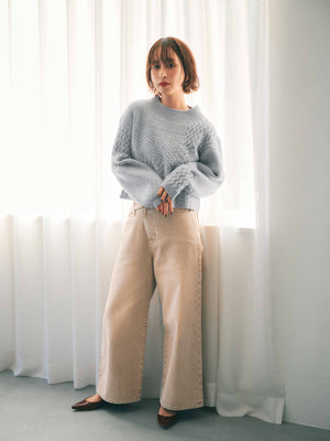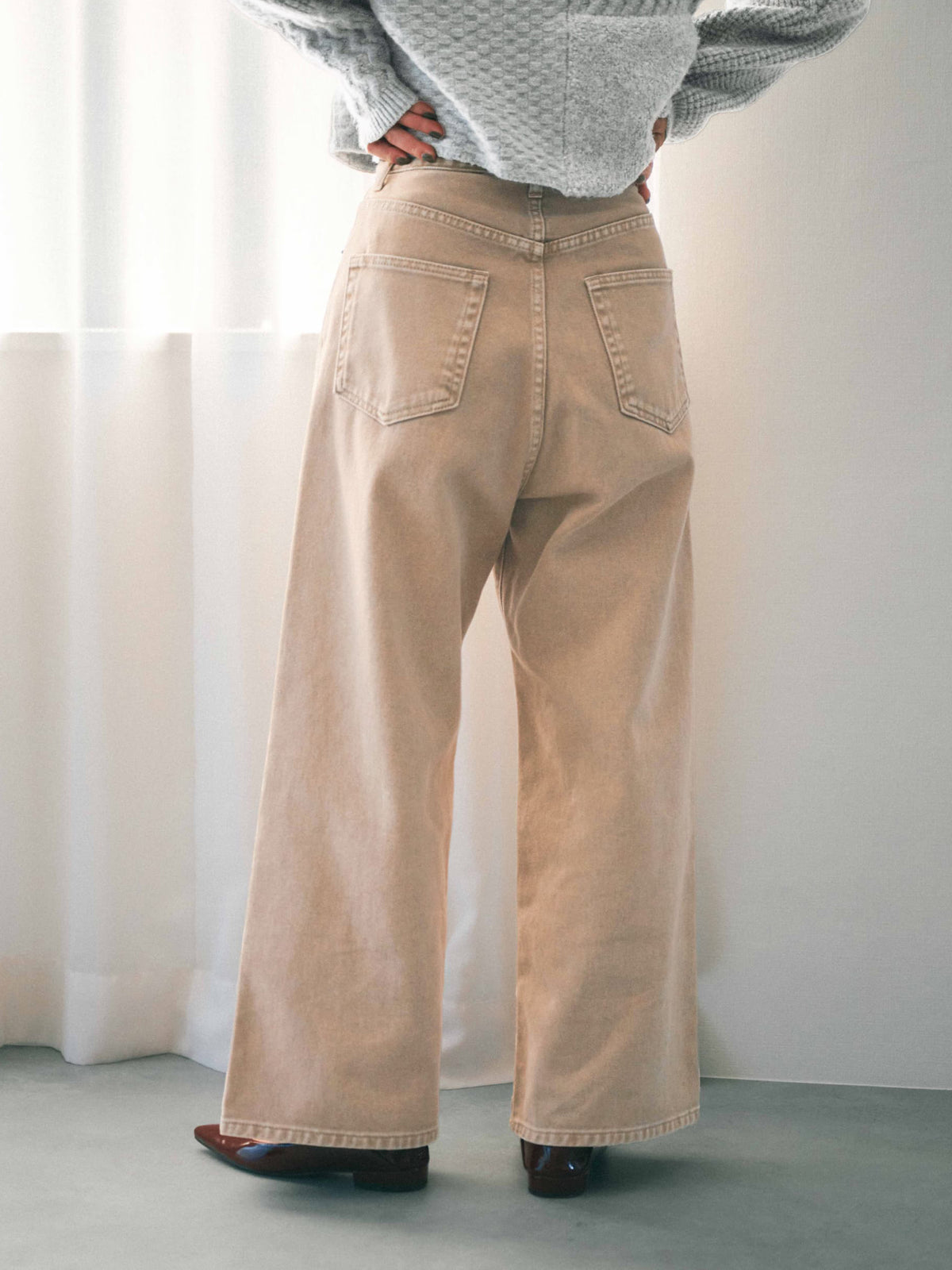 腰周りはすっきりと、ややワイドに見えるくらいのシルエットで、もも周りにほんのりとブラストを入れることで、カジュアルになりすぎず大人のこなれ感が楽しめるアイテムです。ベルトループはやや脇寄りに付いているので、お手持ちのベルトでウエストマークも叶います。
