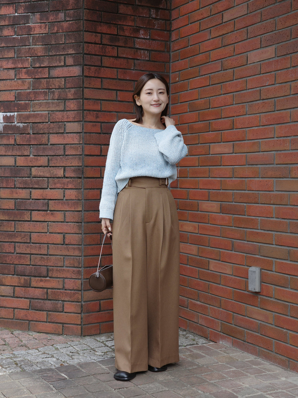148cmでは、short着用でくるぶしが隠れるぐらい、regular着用ではヒールシューズ必須の丈感でした。たっぷりとした丈感で脚長効果を倍増させてくれます。腰周りはベルトで調整できるので、トップスや体型に合わせて着ることができました。(short-XS着用)