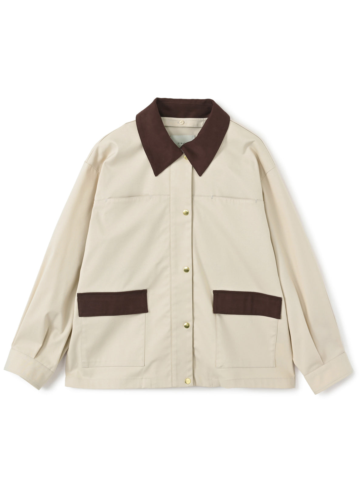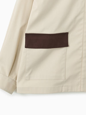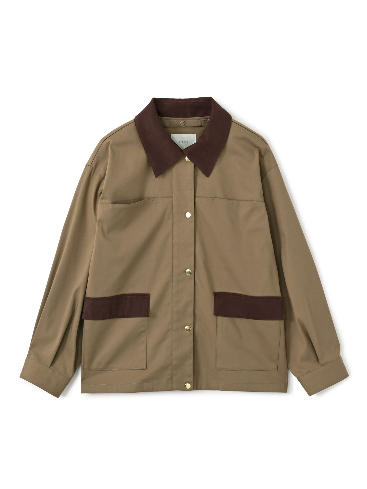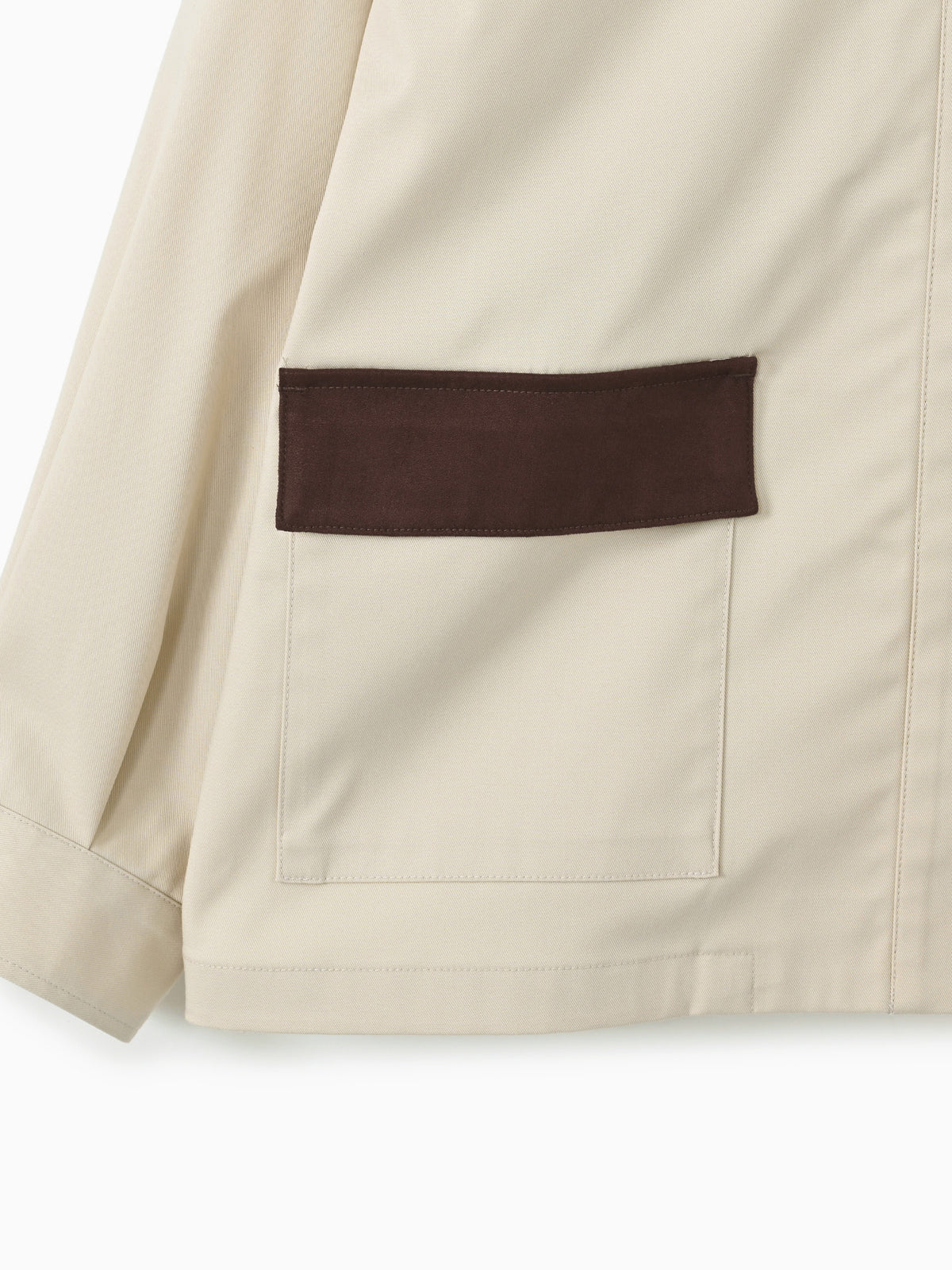 襟とフラップポケットにフェイクスエード素材を使用した、トレンドのハンティングジャケット。