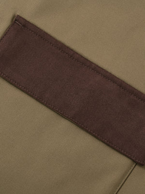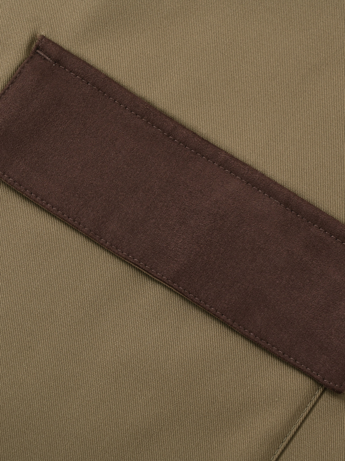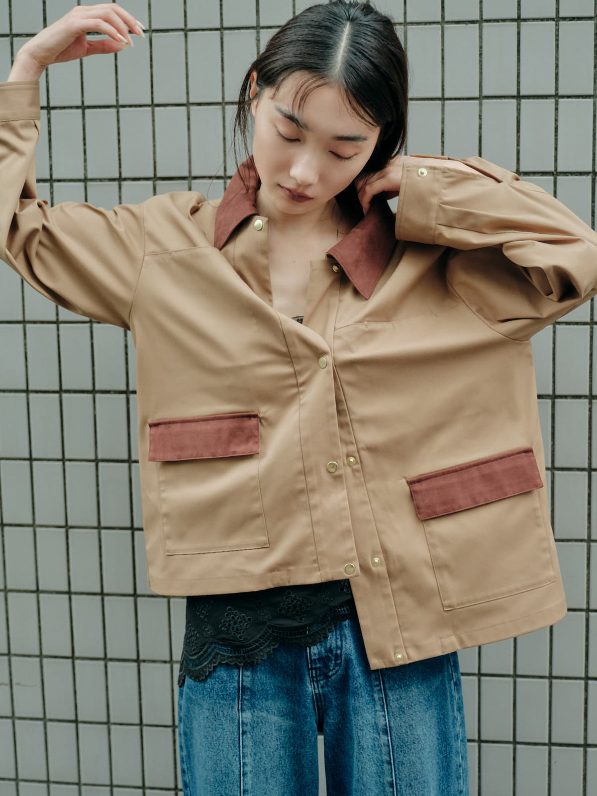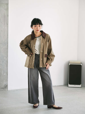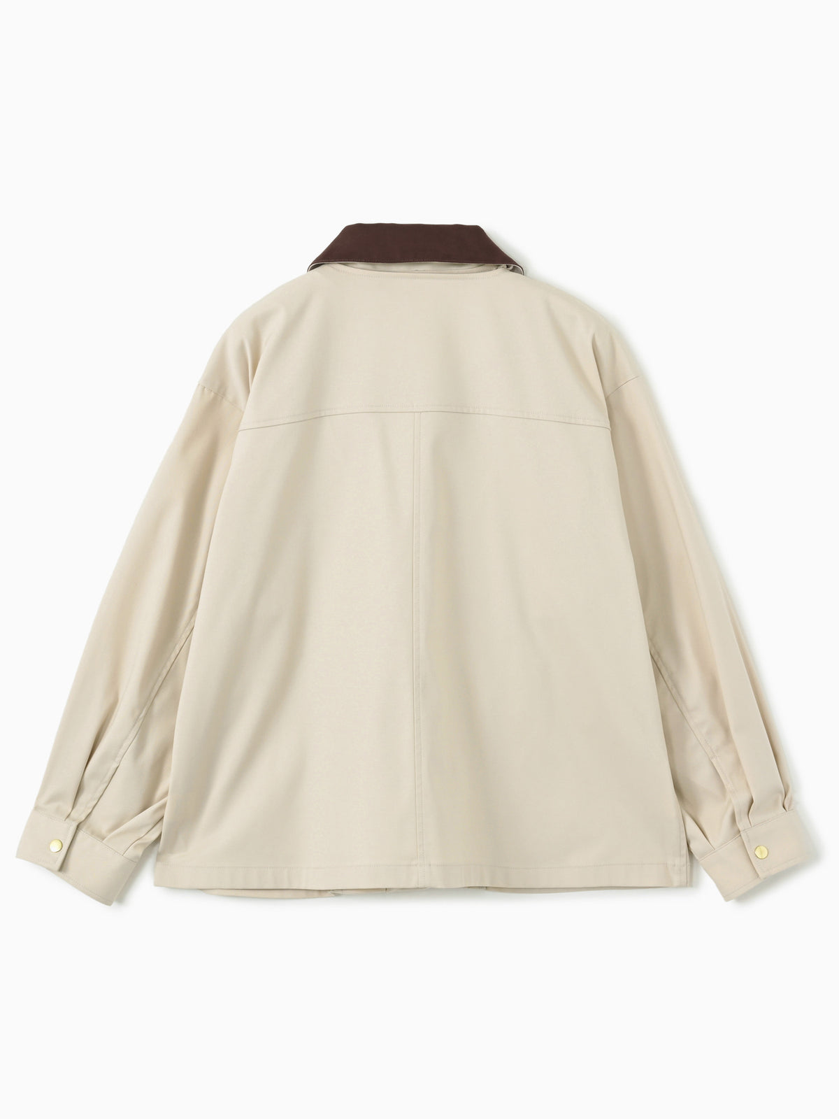 襟とフラップポケットにフェイクスエード素材を使用した、トレンドのハンティングジャケット。